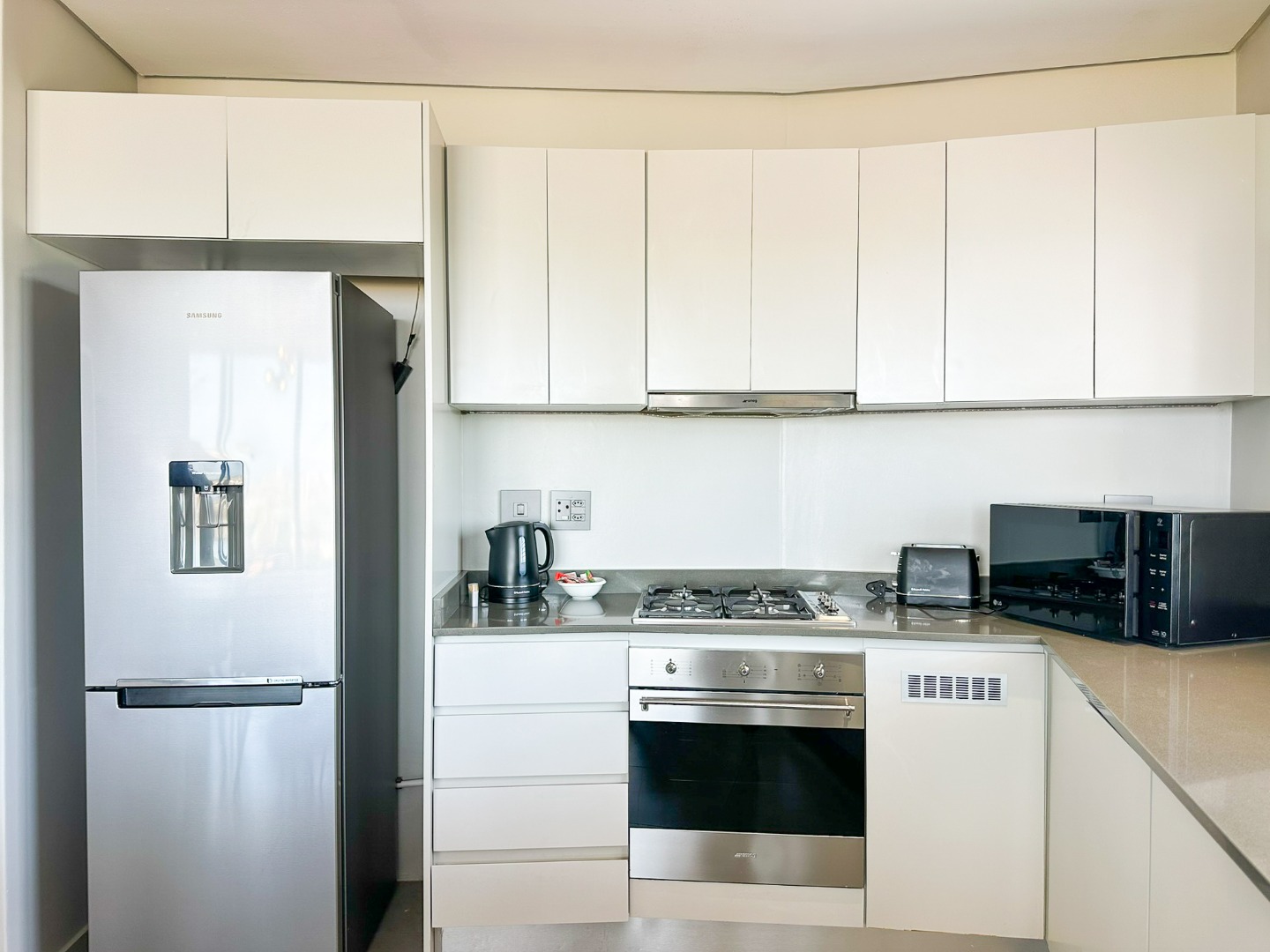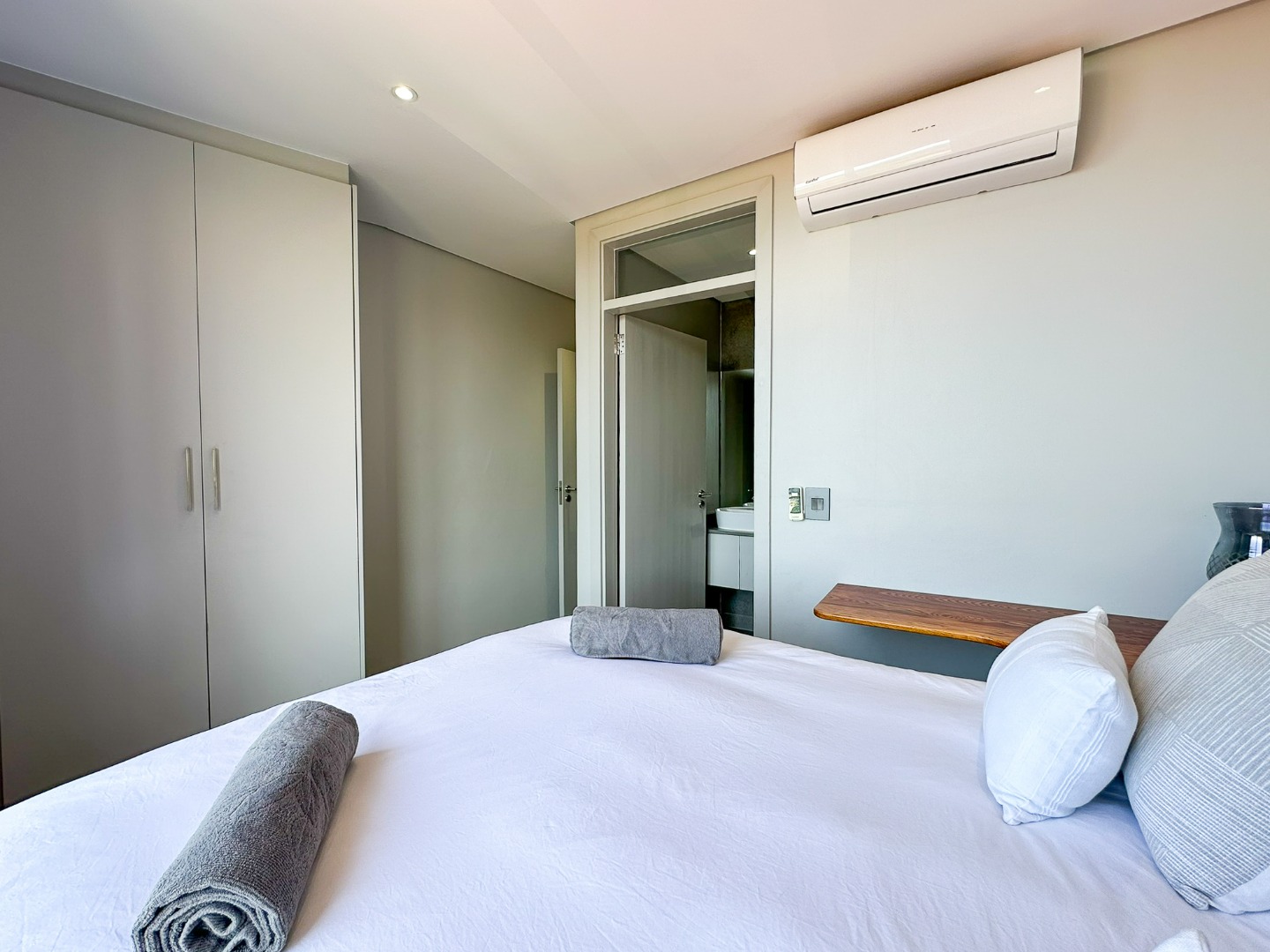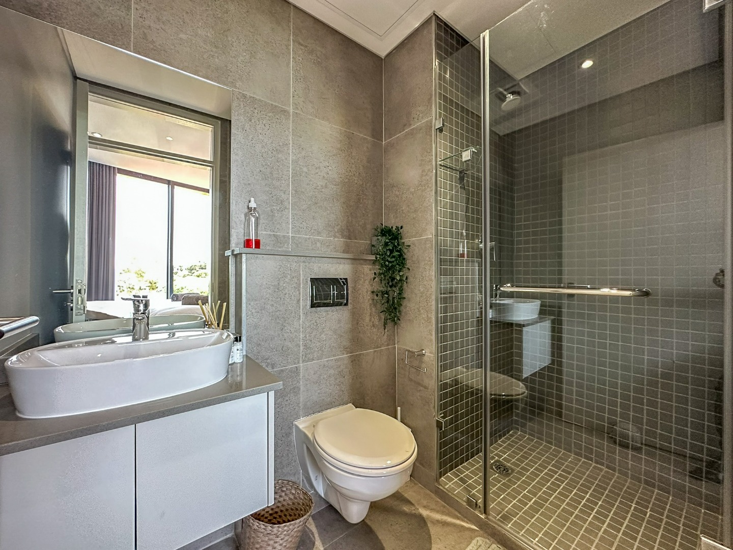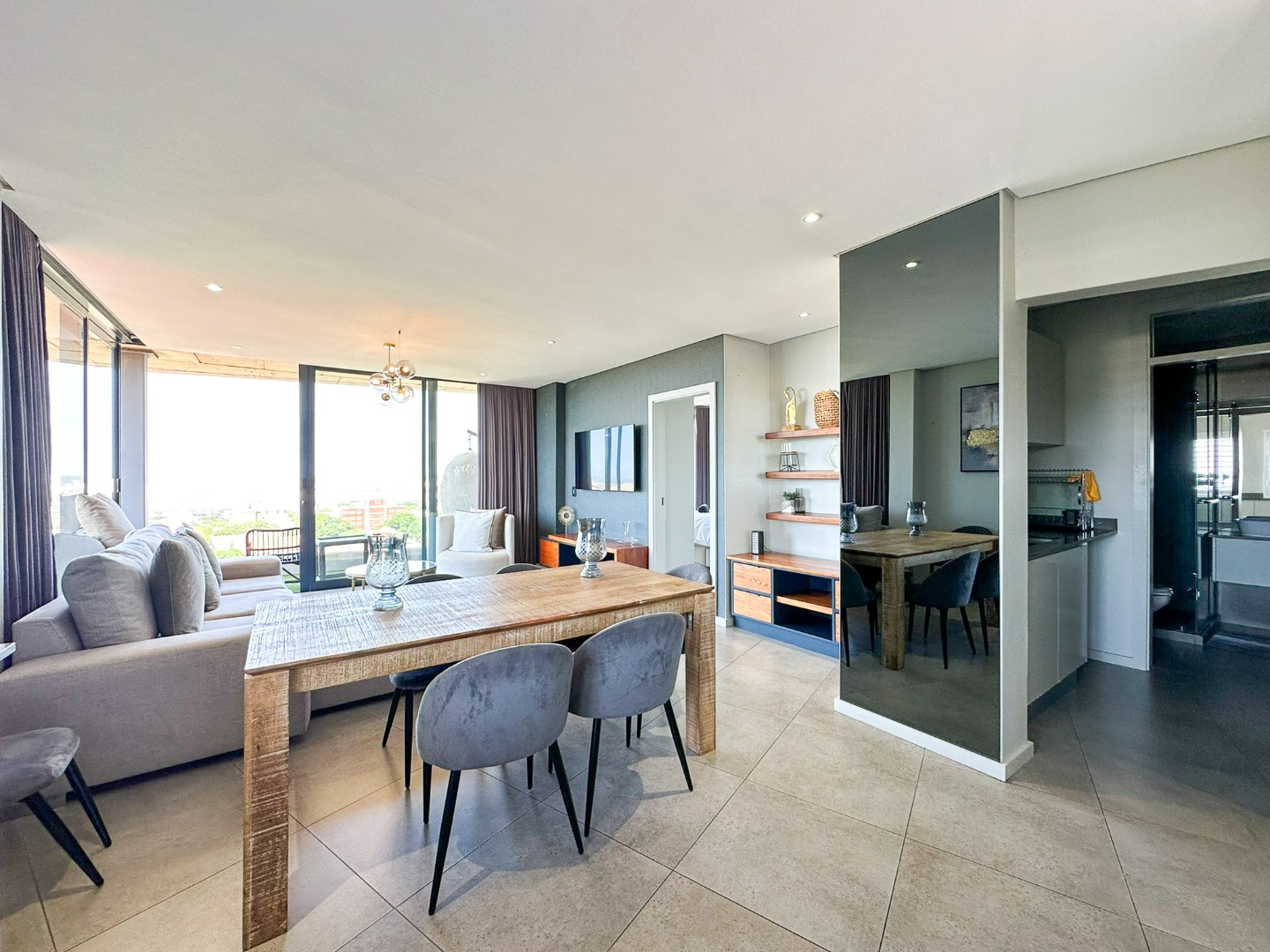 The scullery is plumbed for both a washing machine and dishwasher. There’s also a convenient guest loo with a shower, toilet, and basin. Two of the three bedrooms feature ensuite bathrooms and ample cupboard space, with the main bedroom opening onto the balcony. The third bedroom also includes built-in cupboards. The entire property is elegantly tiled throughout.