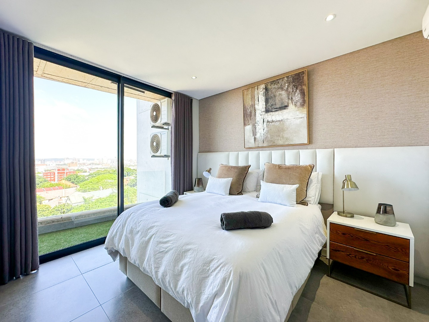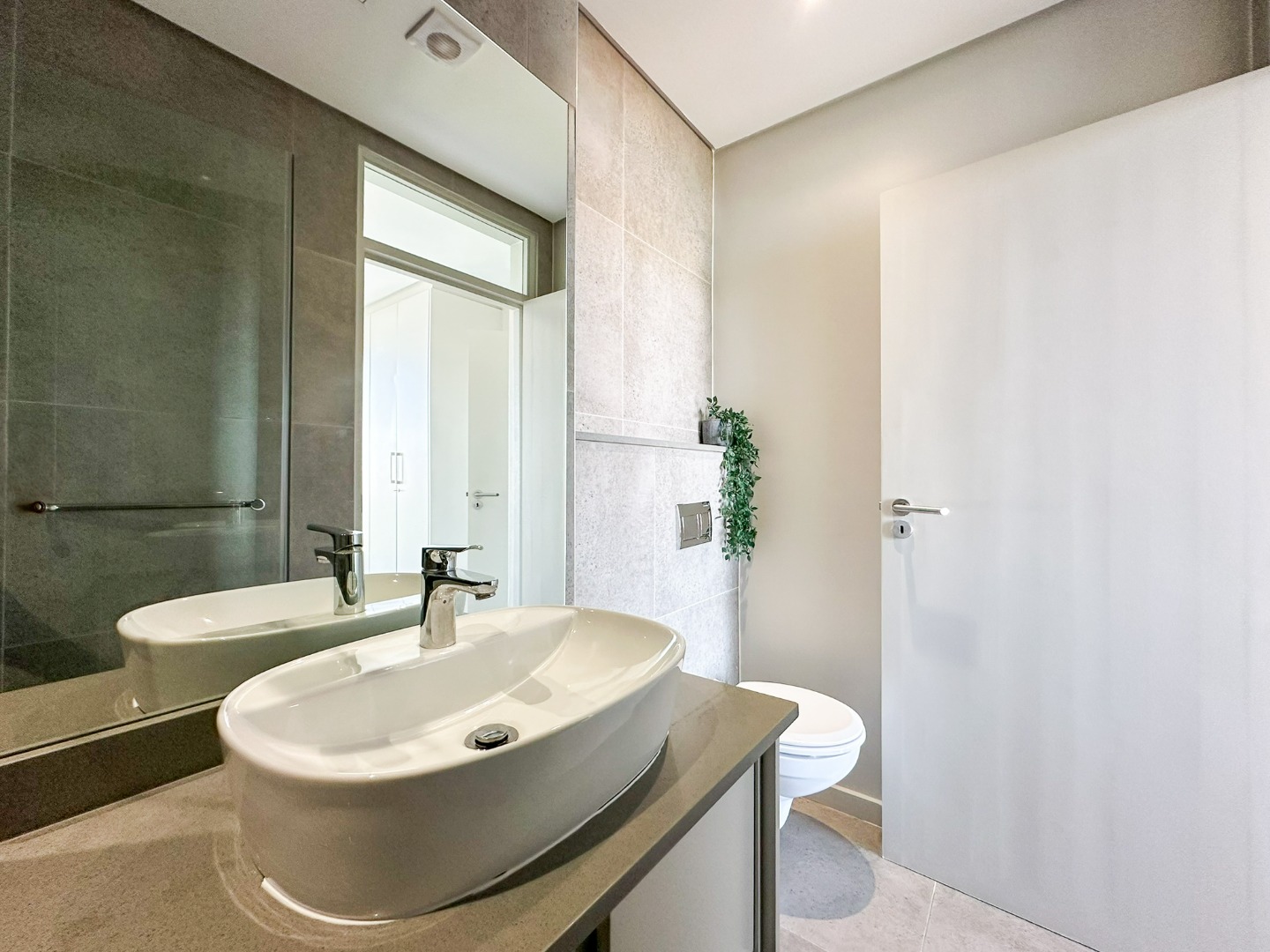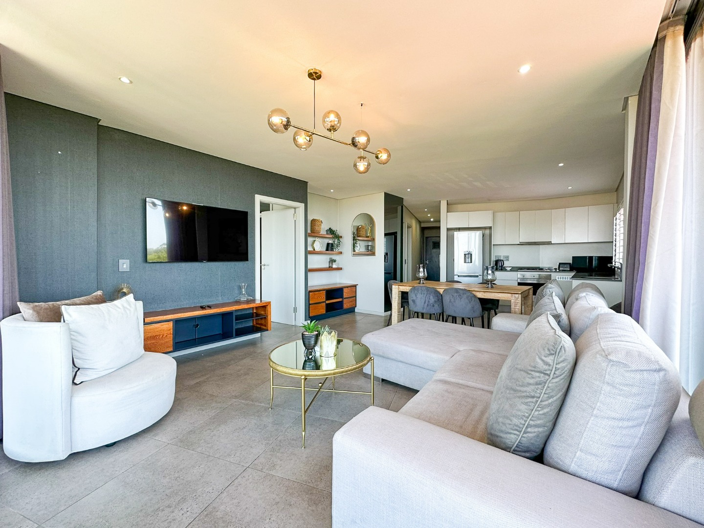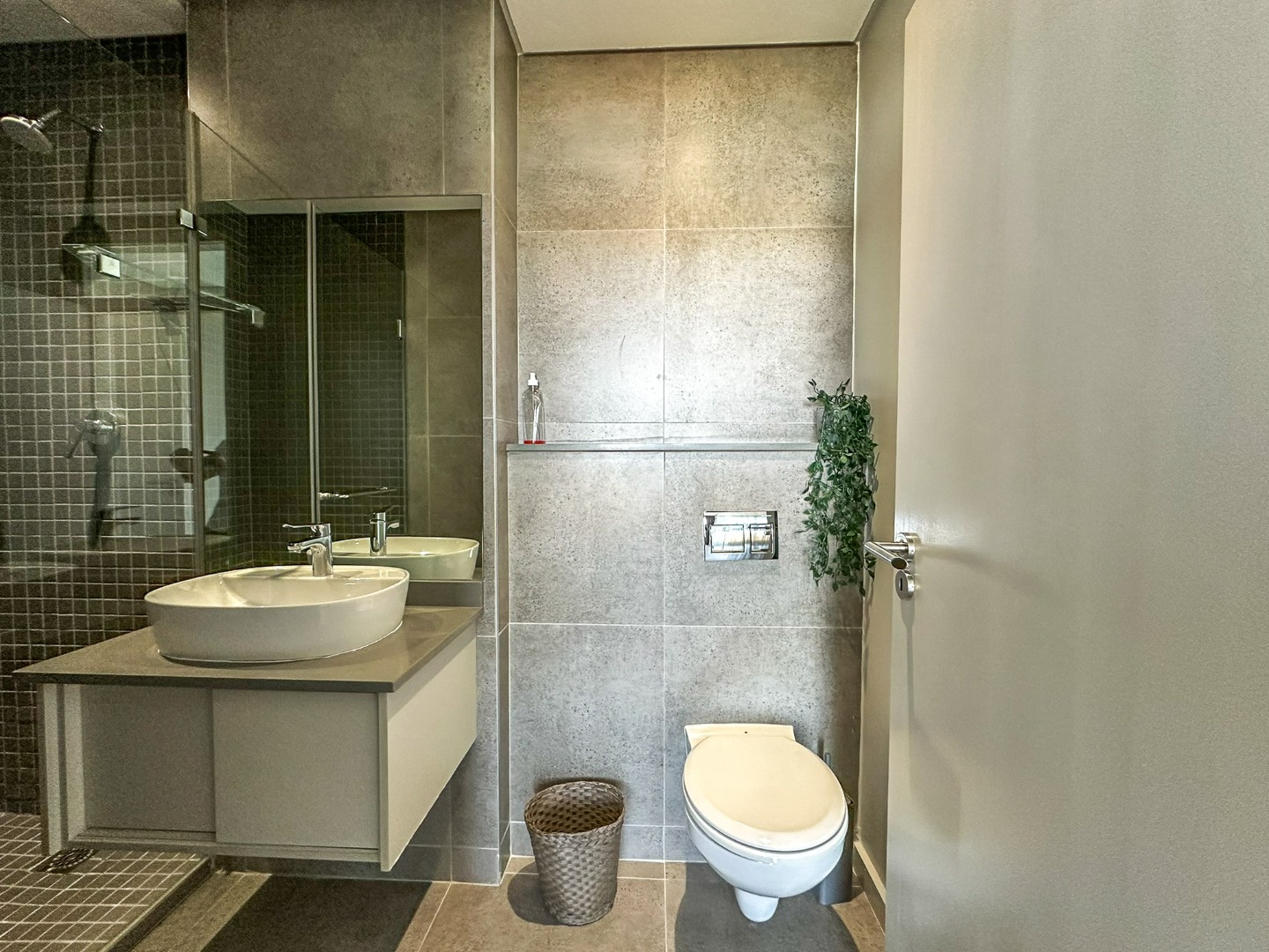 The scullery is plumbed for both a washing machine and dishwasher. There’s also a convenient guest loo with a shower, toilet, and basin. Two of the three bedrooms feature ensuite bathrooms and ample cupboard space, with the main bedroom opening onto the balcony. The third bedroom also includes built-in cupboards. The entire property is elegantly tiled throughout.
