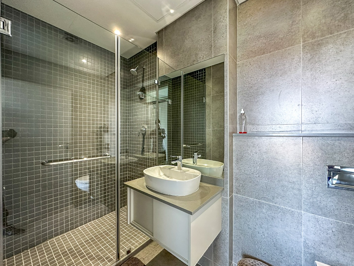 Residents can enjoy a communal pool and entertainment area. The building offers strict 24-hour security with a manned guard and biometric face recognition for entry. Two allocated parking spaces are included.