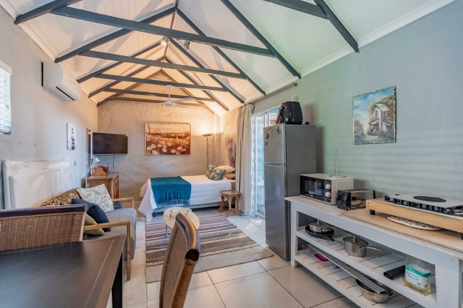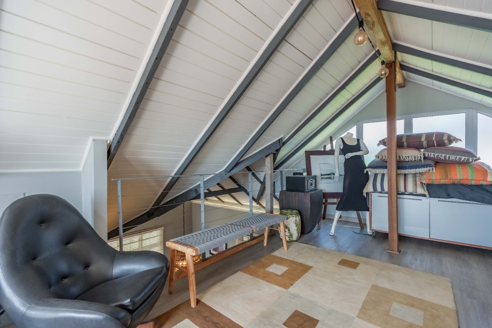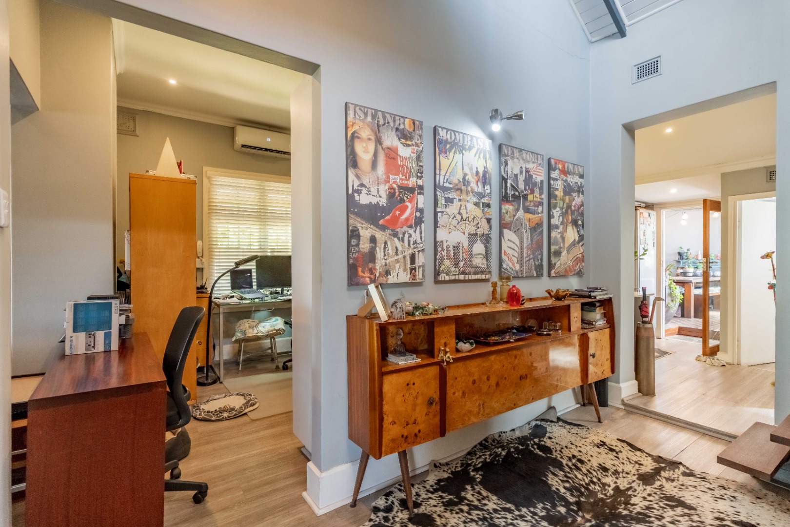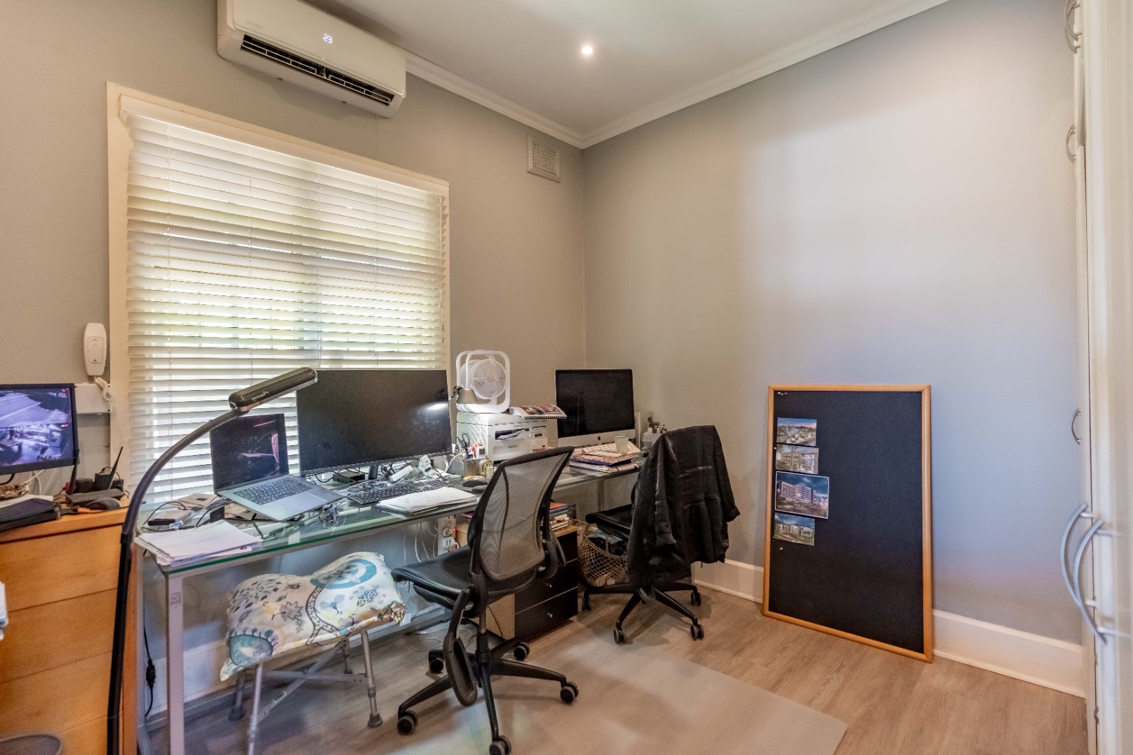 Upstairs, a versatile space can be used as a study or second lounge. The home features exposed beams that are well-treated and painted, enhancing its character and charm. High-quality laminate flooring and air conditioning extend throughout, ensuring both comfort and style.