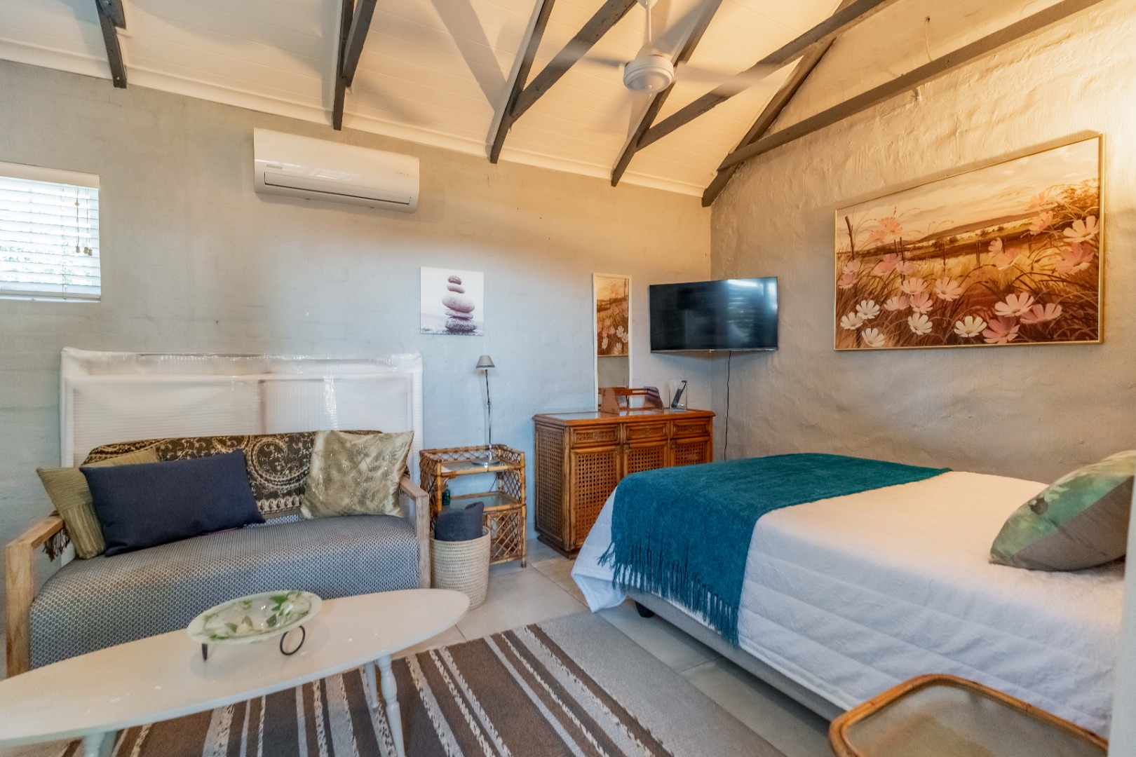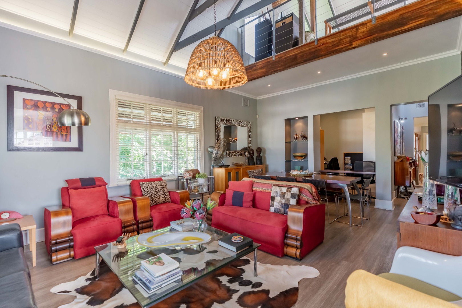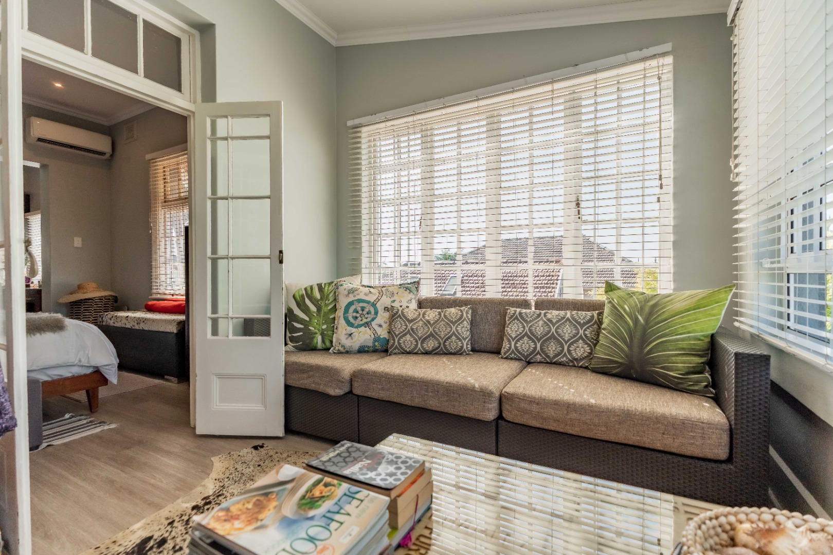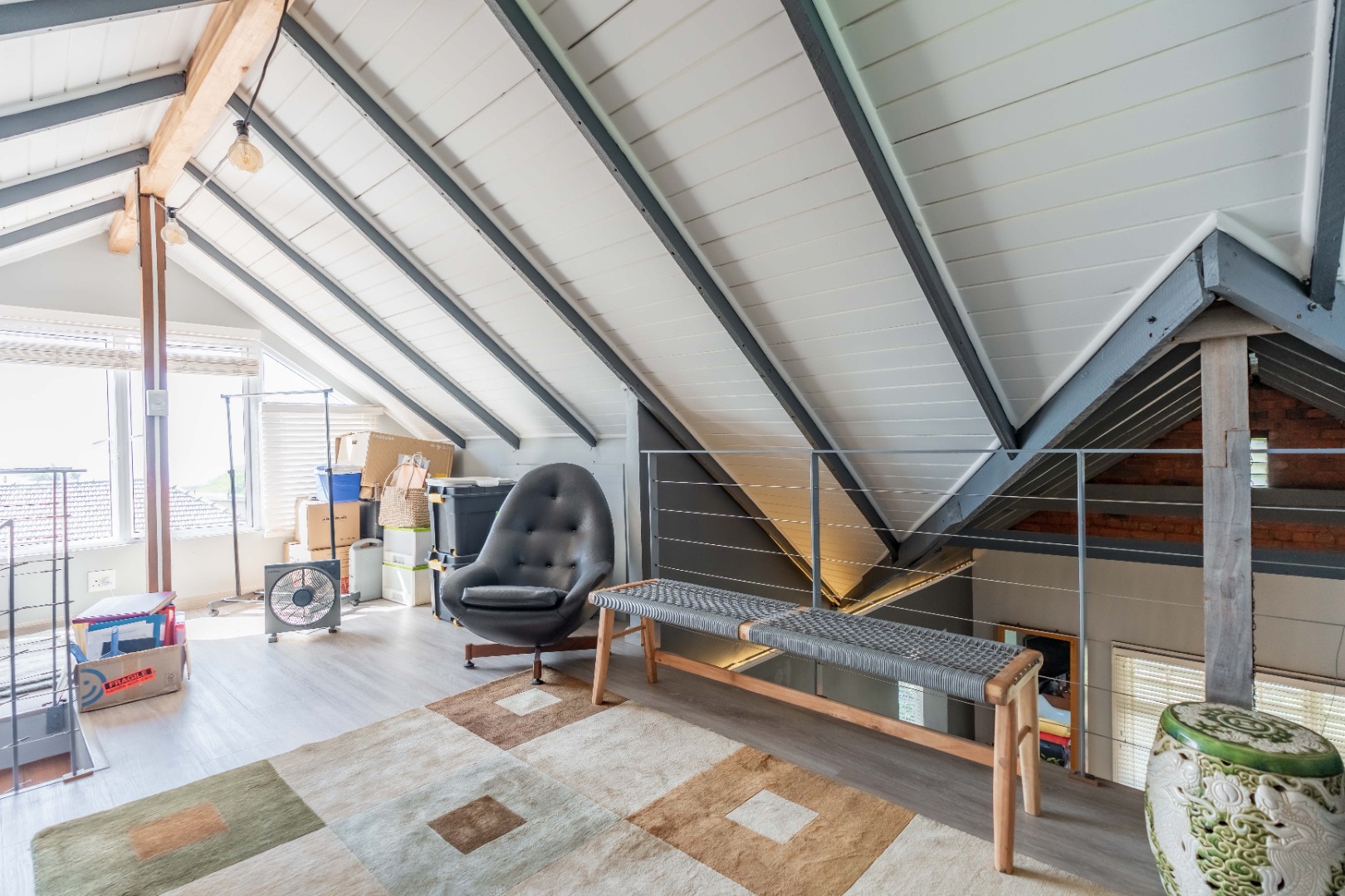 Upstairs, a versatile space can be used as a study or second lounge. The home features exposed beams that are well-treated and painted, enhancing its character and charm. High-quality laminate flooring and air conditioning extend throughout, ensuring both comfort and style.
