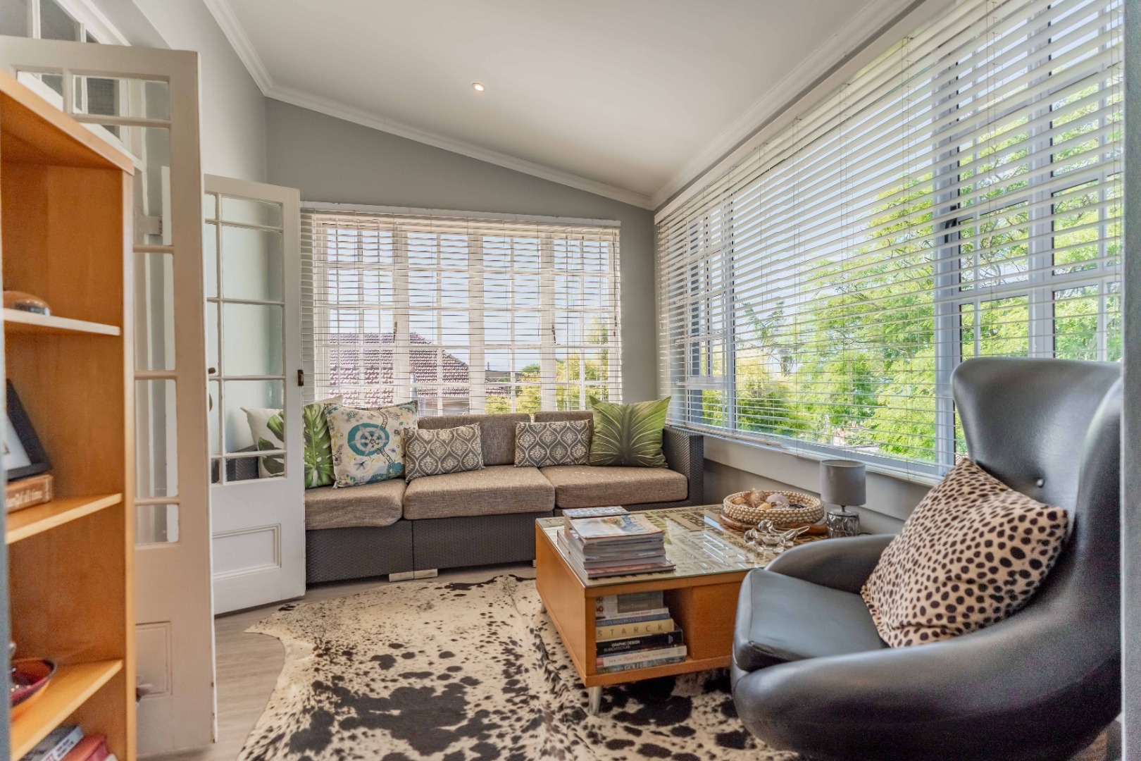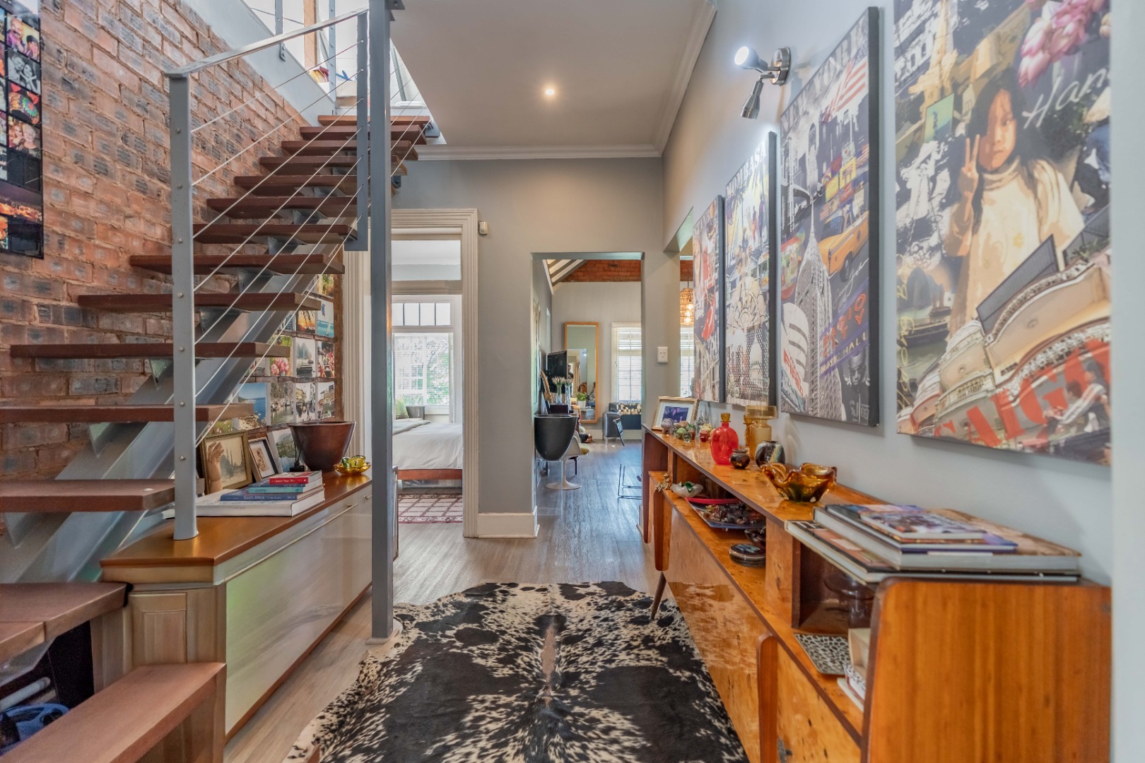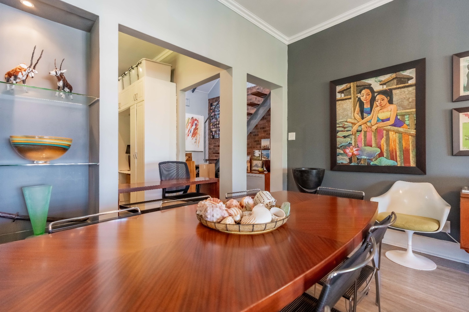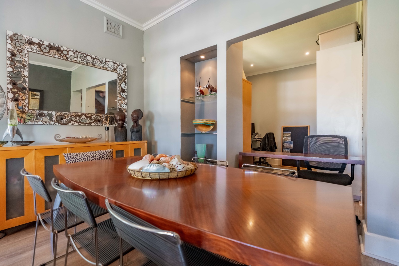 Upstairs, a versatile space can be used as a study or second lounge. The home features exposed beams that are well-treated and painted, enhancing its character and charm. High-quality laminate flooring and air conditioning extend throughout, ensuring both comfort and style.