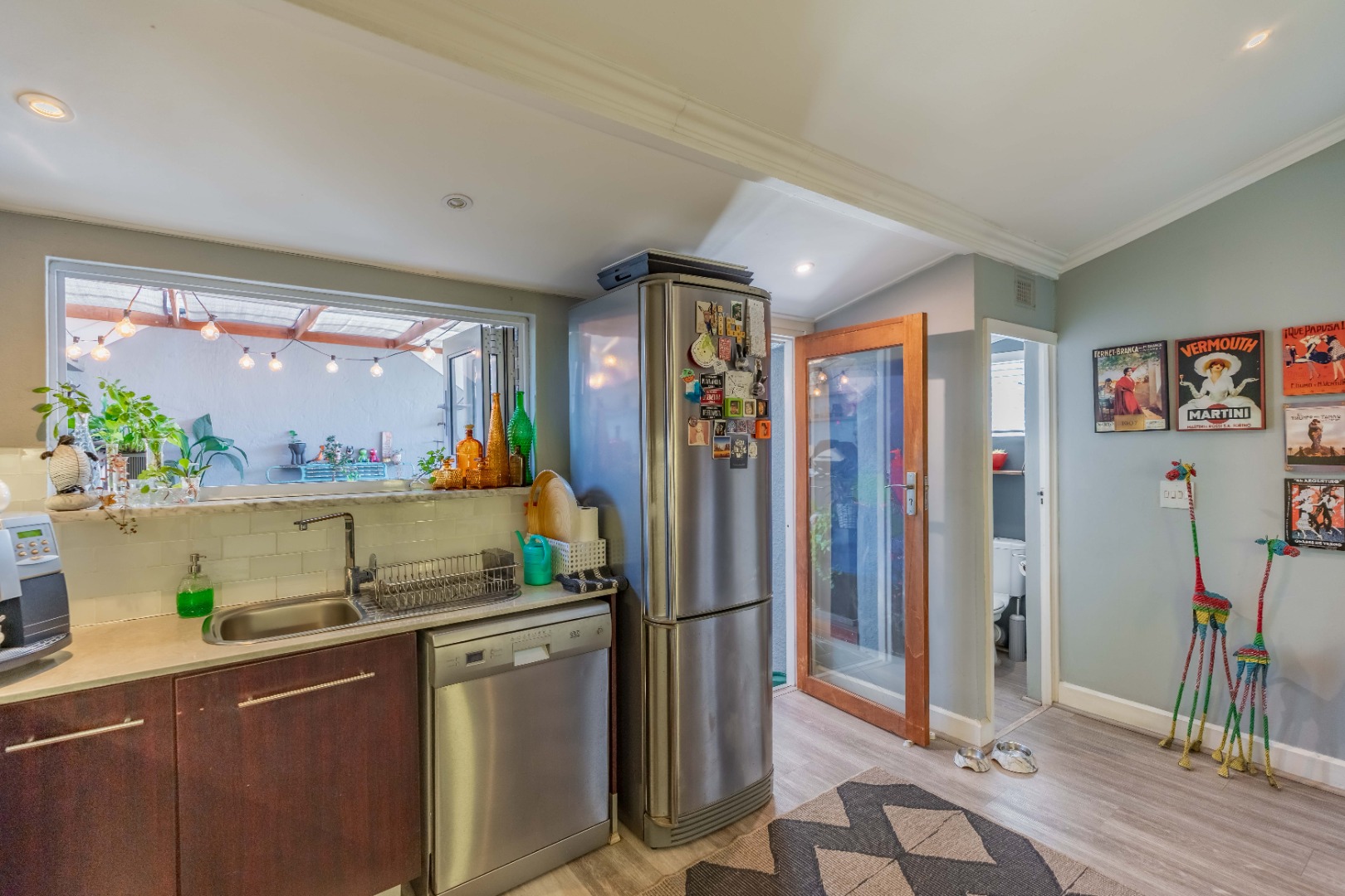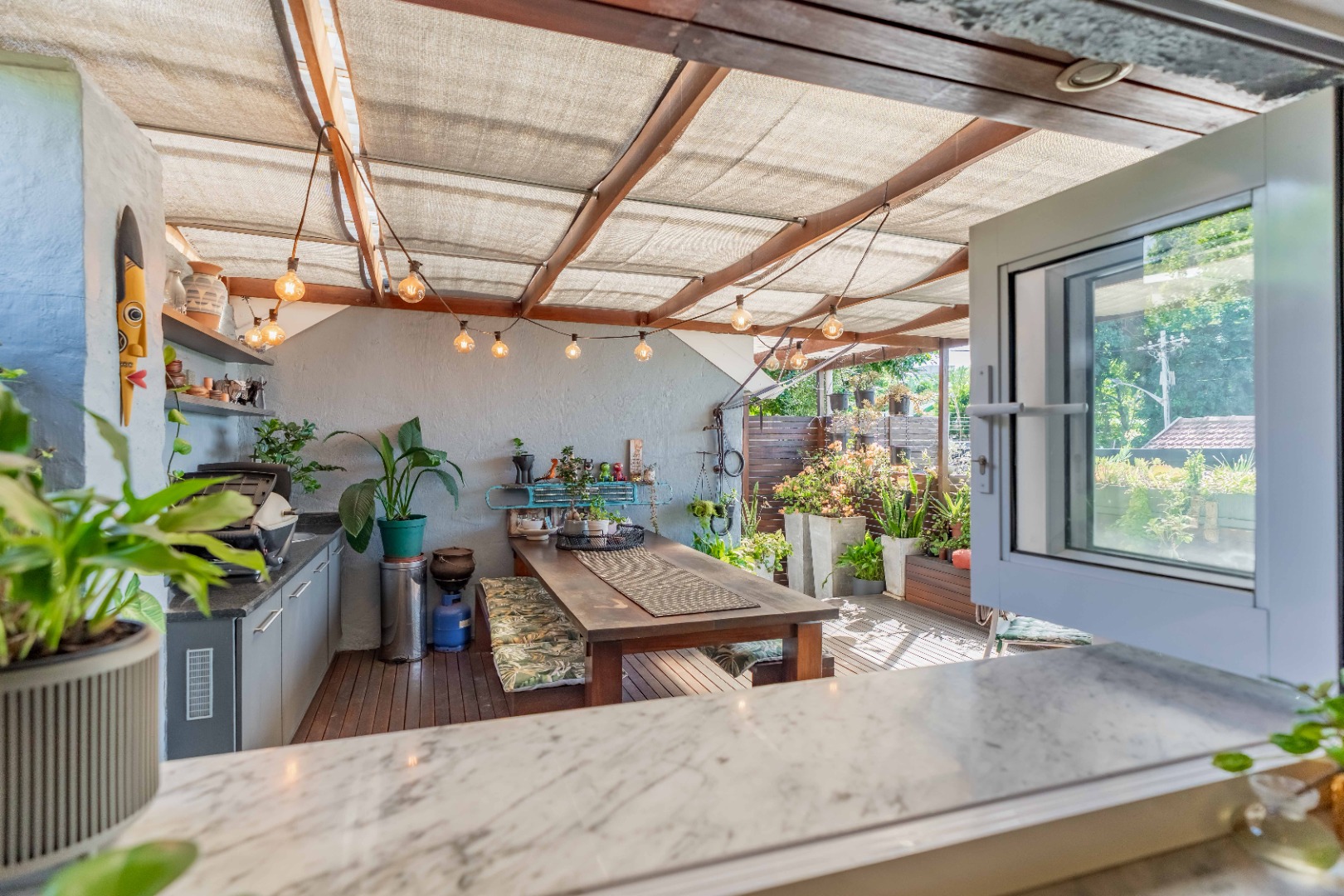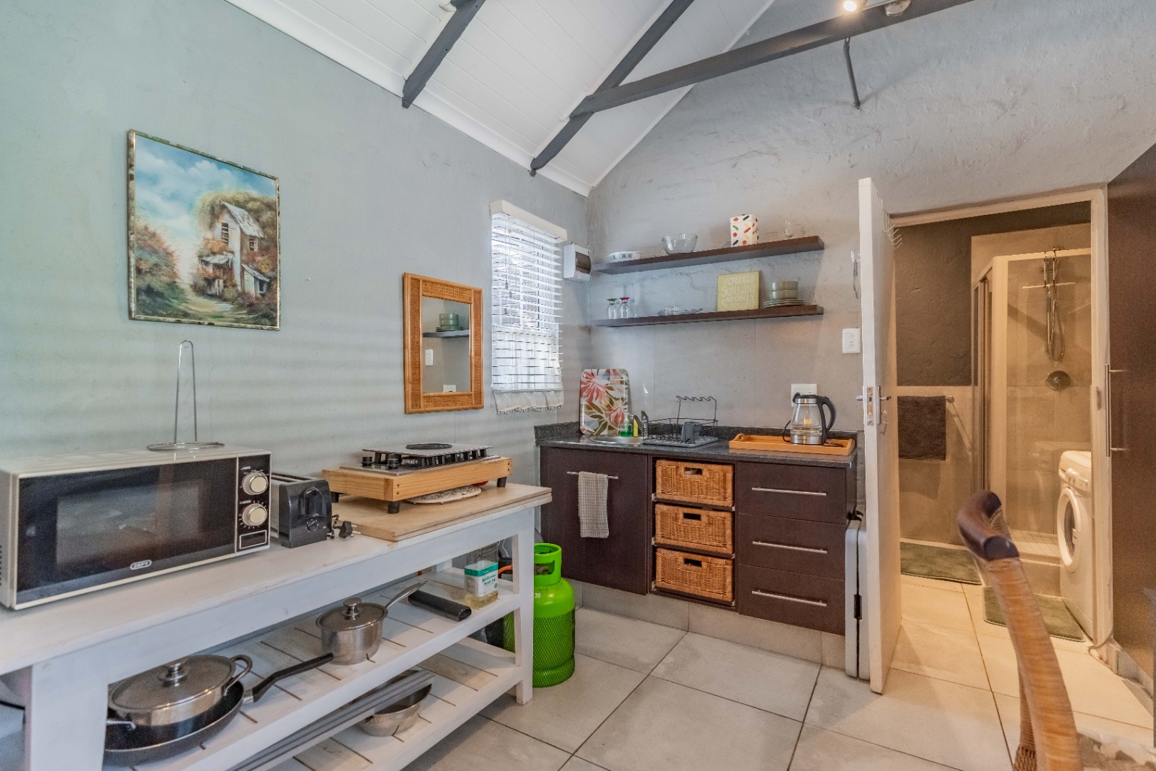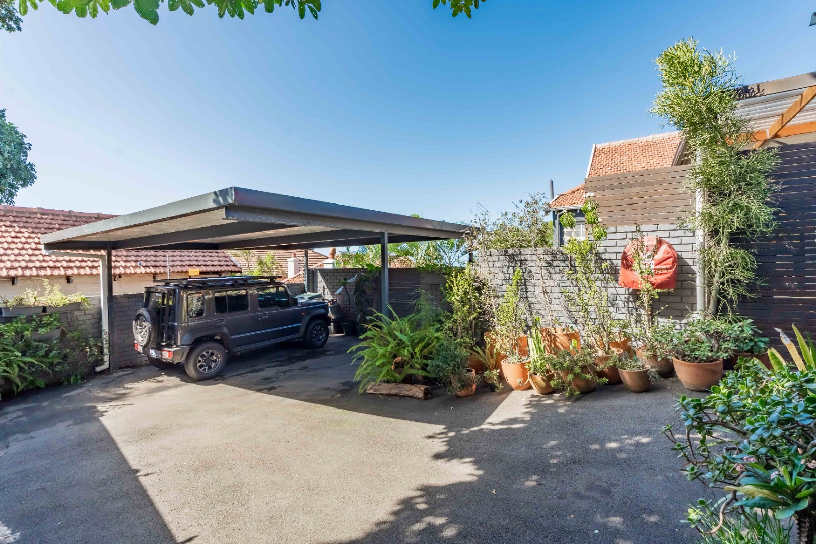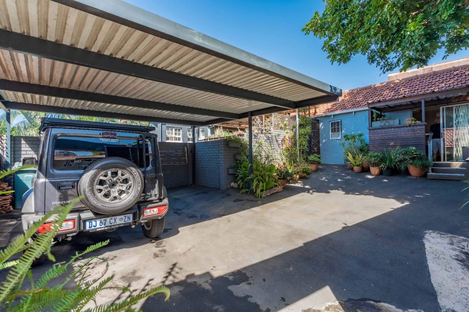 As you enter, you are welcomed by an undercover entertainment area that flows seamlessly into the kitchen. French-style aluminum windows open out from the kitchen, creating a perfect indoor-outdoor space for entertaining. The kitchen is fitted with granite countertops, ample cupboard space, is plumbed for a dishwasher, and includes a separate laundry area.