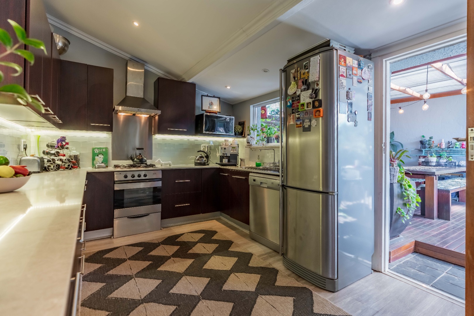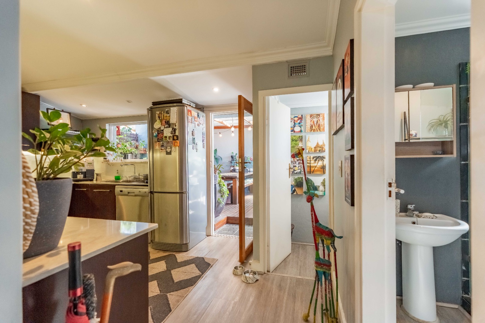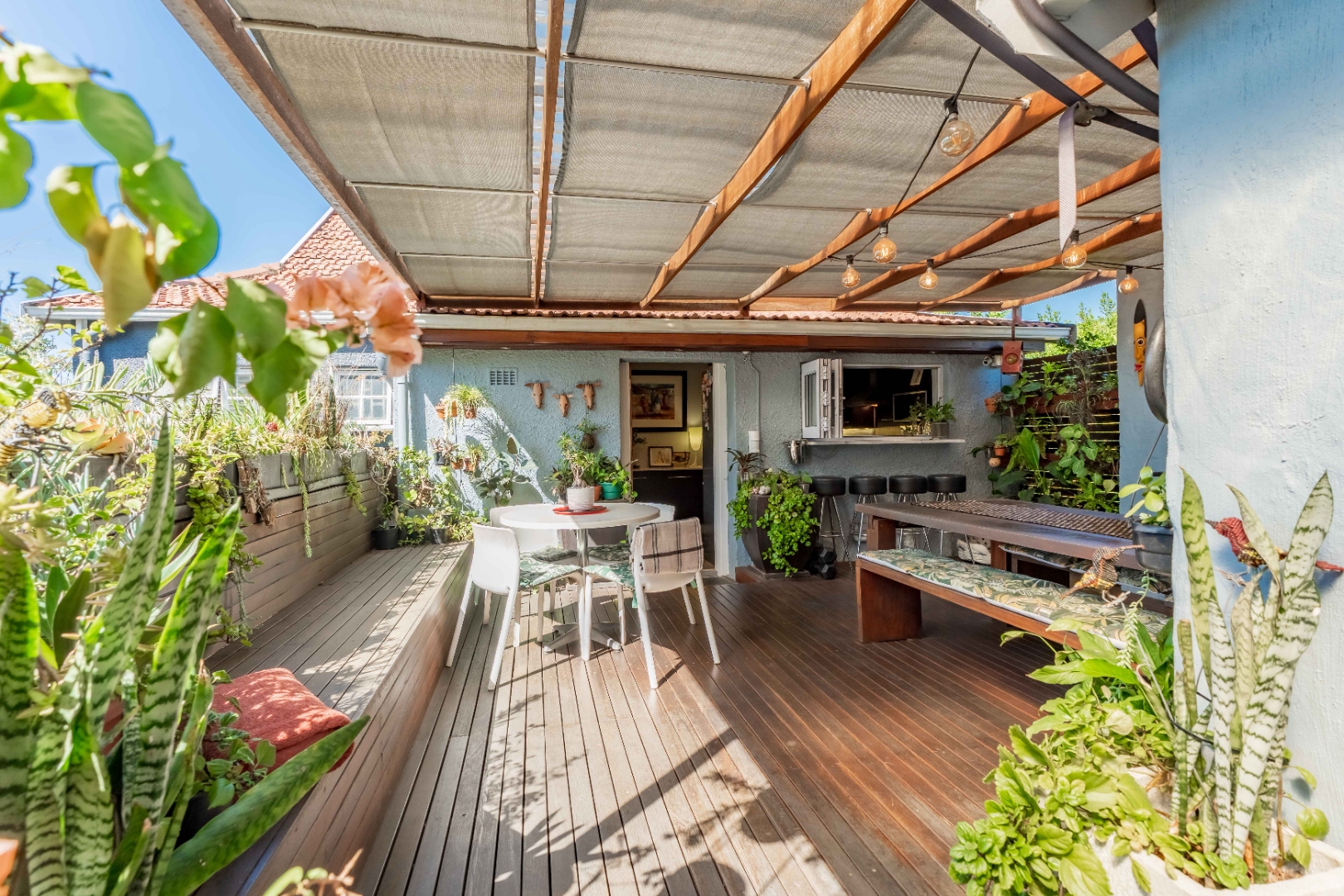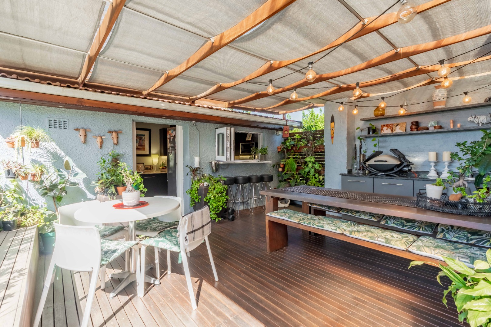 As you enter, you are welcomed by an undercover entertainment area that flows seamlessly into the kitchen. French-style aluminum windows open out from the kitchen, creating a perfect indoor-outdoor space for entertaining. The kitchen is fitted with granite countertops, ample cupboard space, is plumbed for a dishwasher, and includes a separate laundry area.