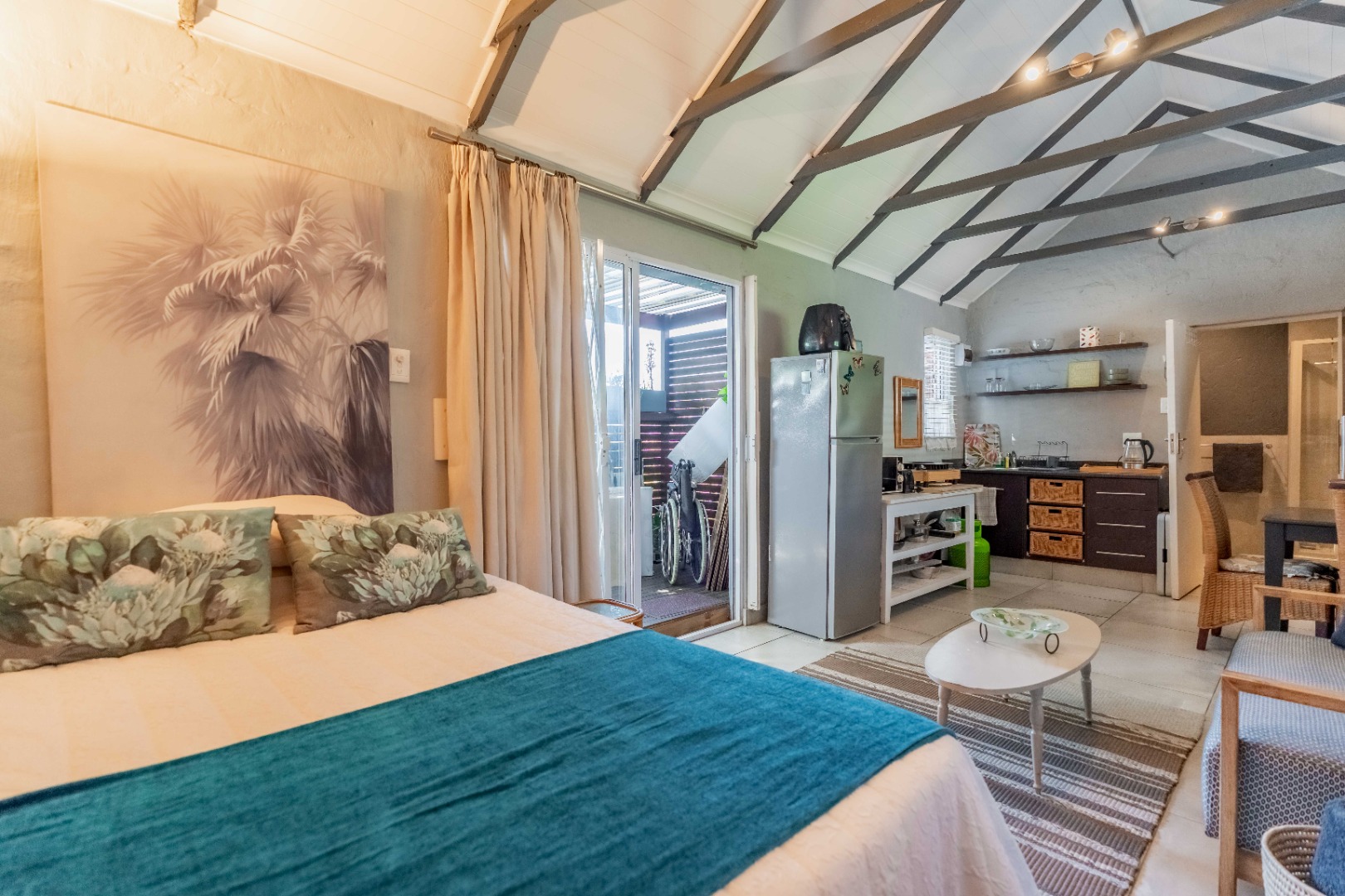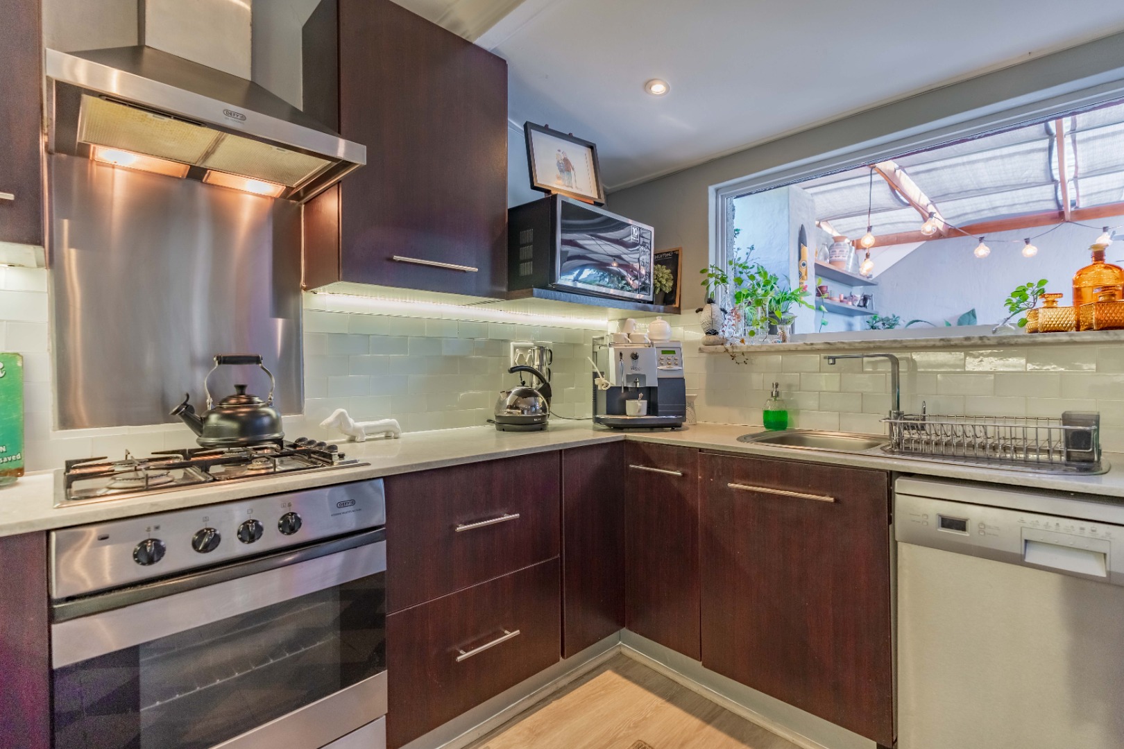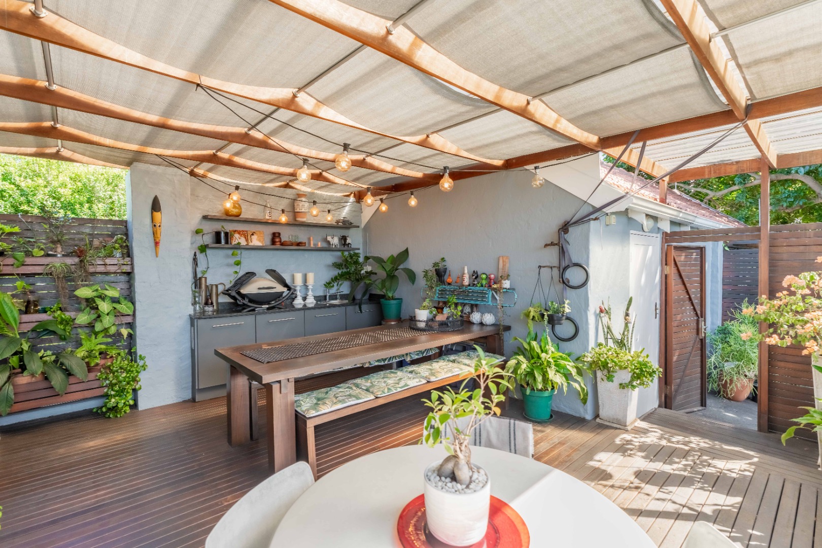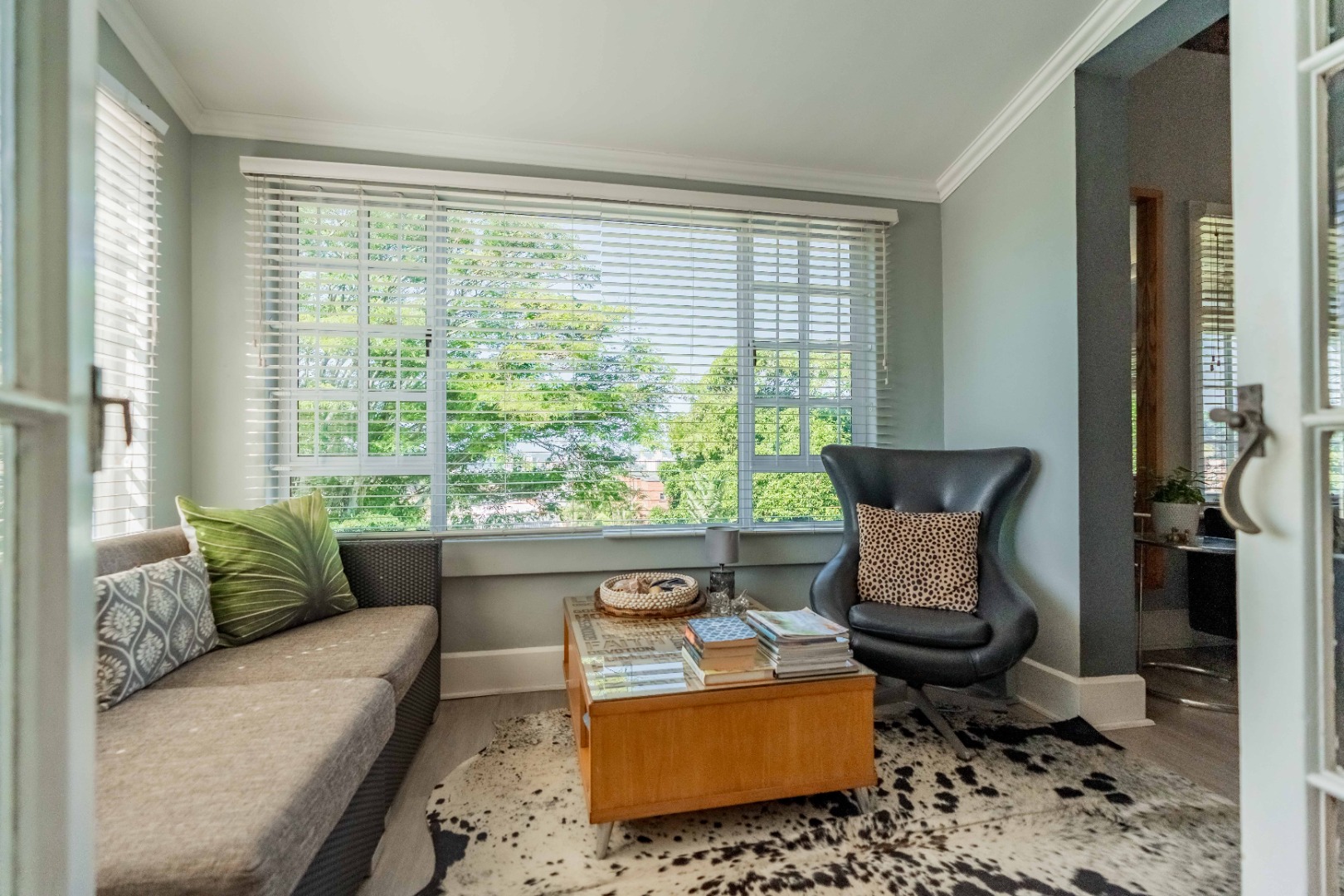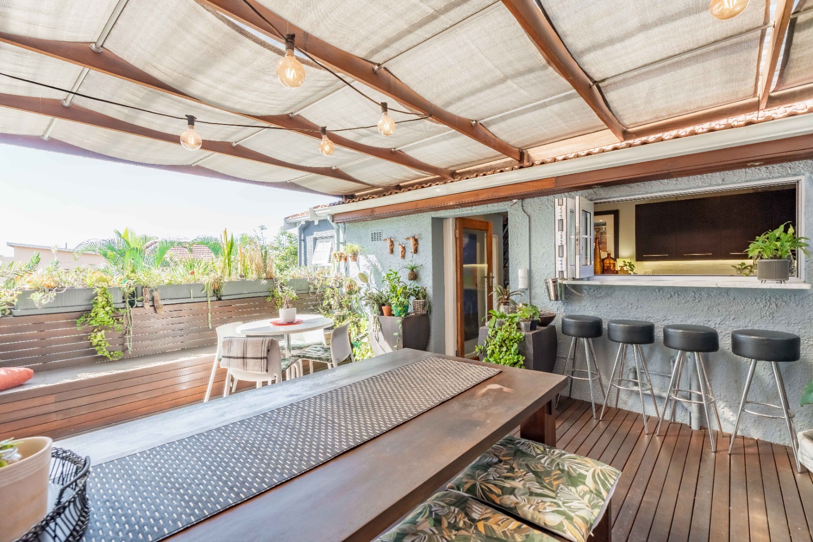 As you enter, you are welcomed by an undercover entertainment area that flows seamlessly into the kitchen. French-style aluminum windows open out from the kitchen, creating a perfect indoor-outdoor space for entertaining. The kitchen is fitted with granite countertops, ample cupboard space, is plumbed for a dishwasher, and includes a separate laundry area.
