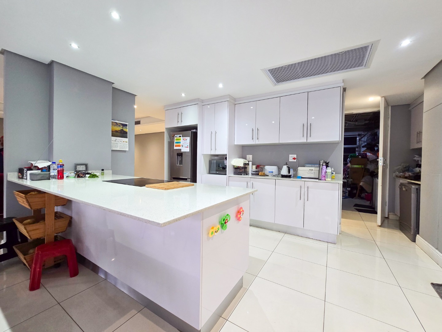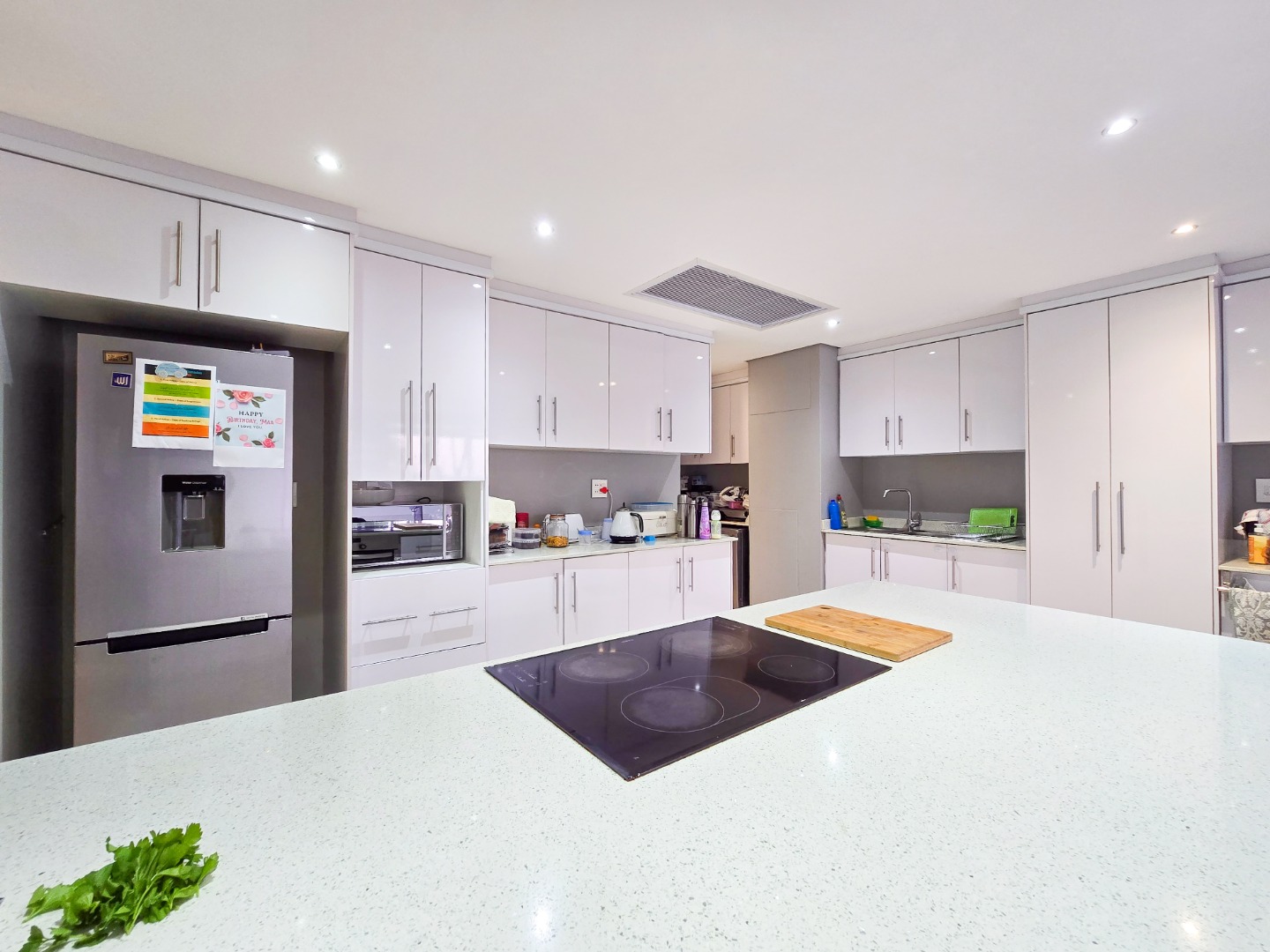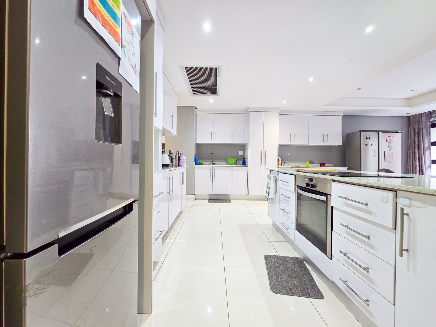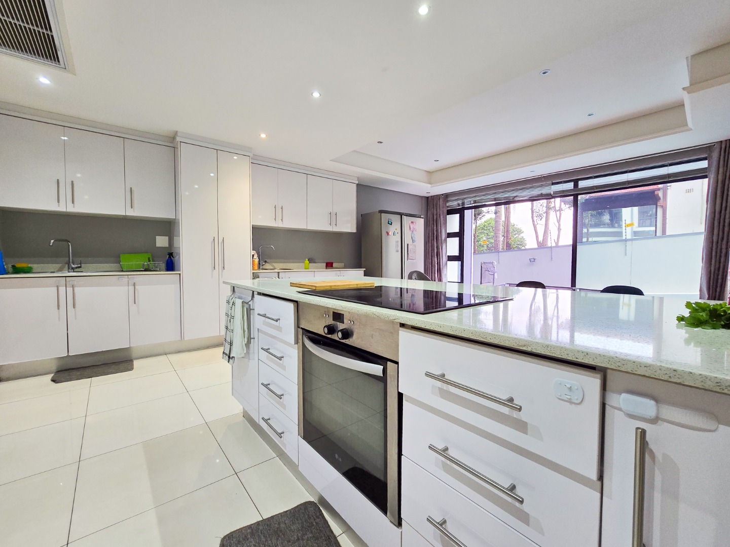 The lounge flows seamlessly into the open-plan dining area and a fully fitted kitchen boasting high-gloss built-in cupboards, a built-in hob and oven, Caesarstone countertops, a scullery, and ample storage space.
