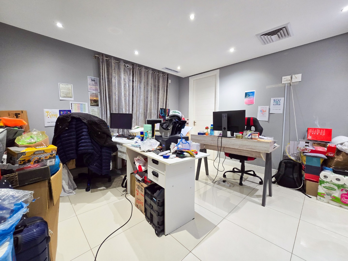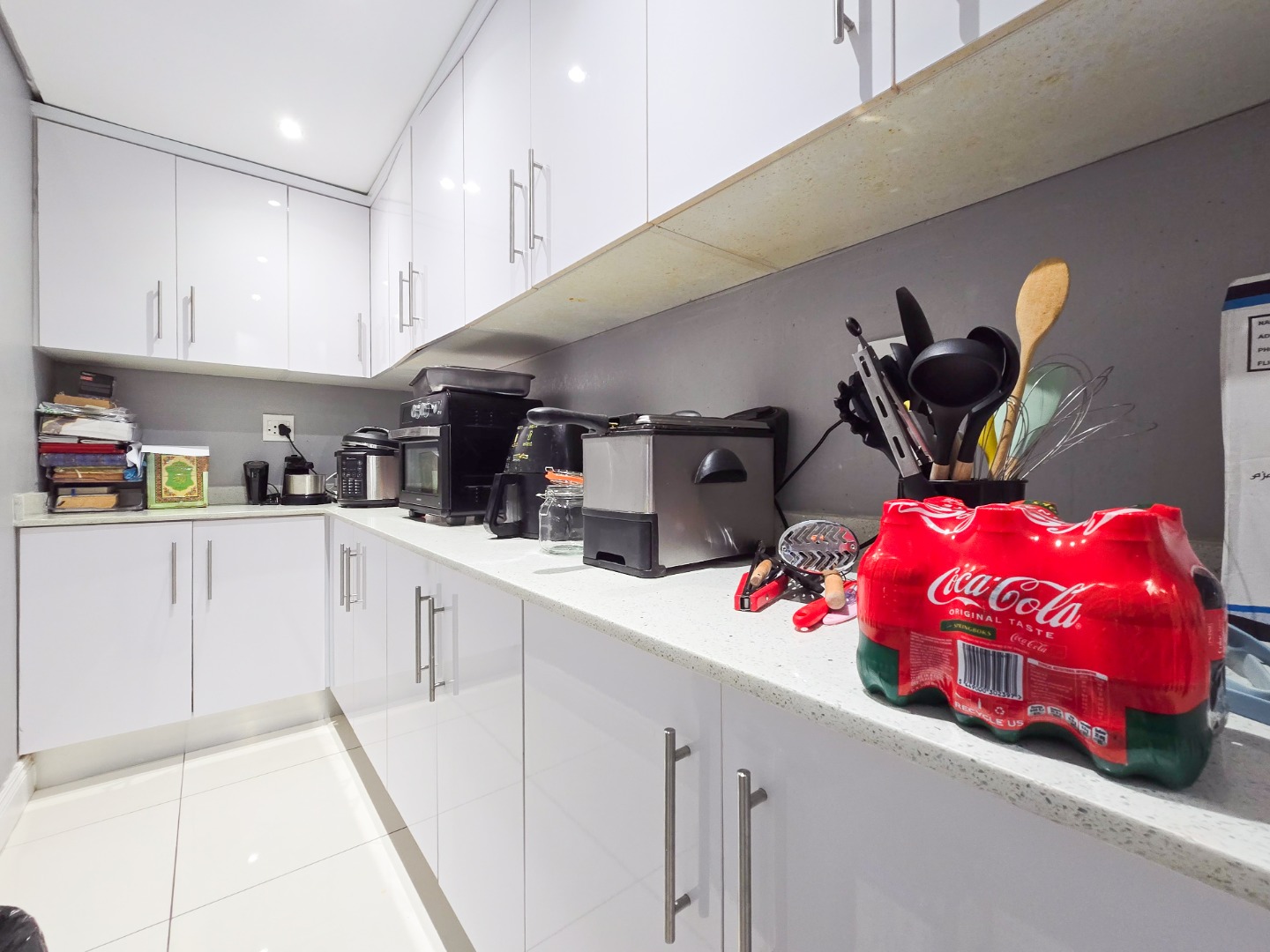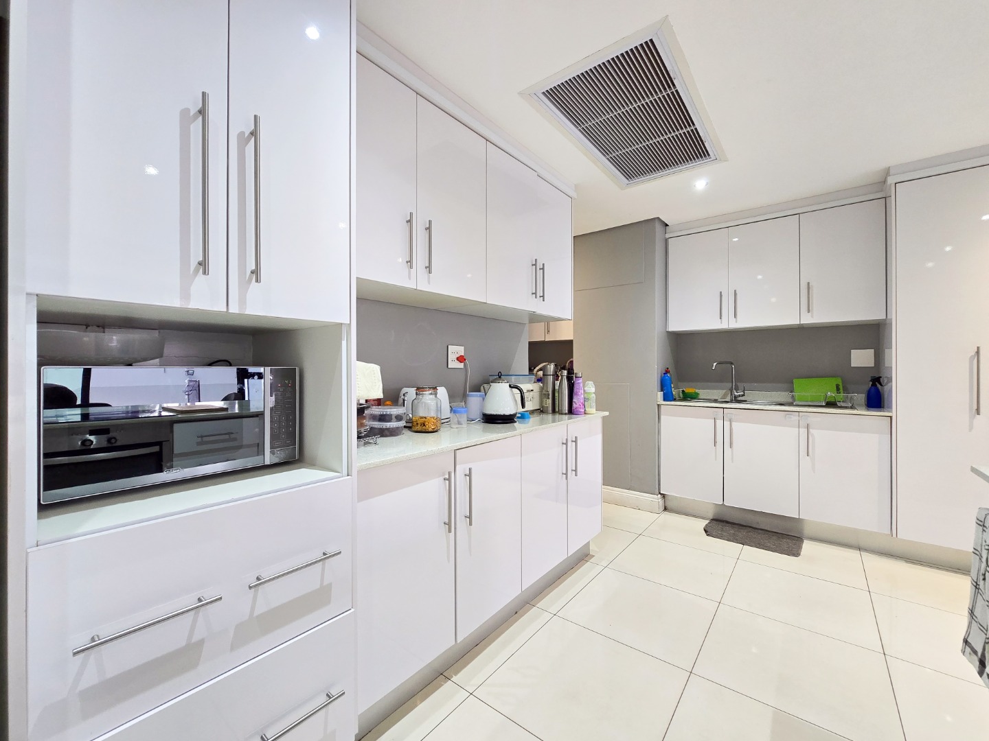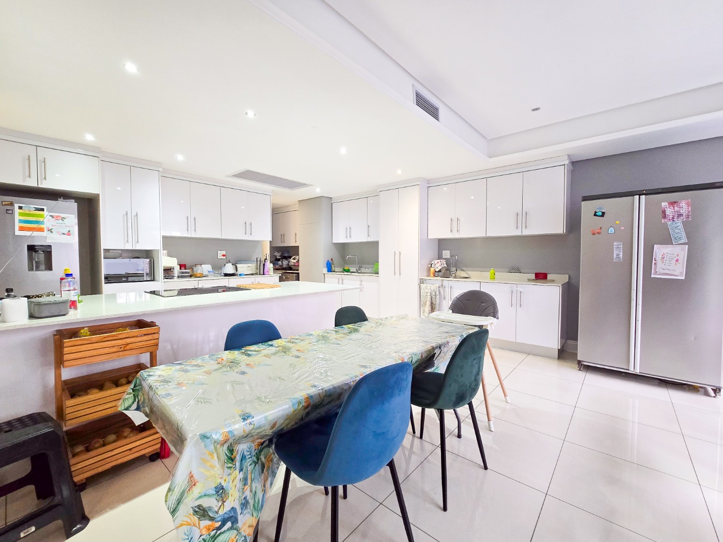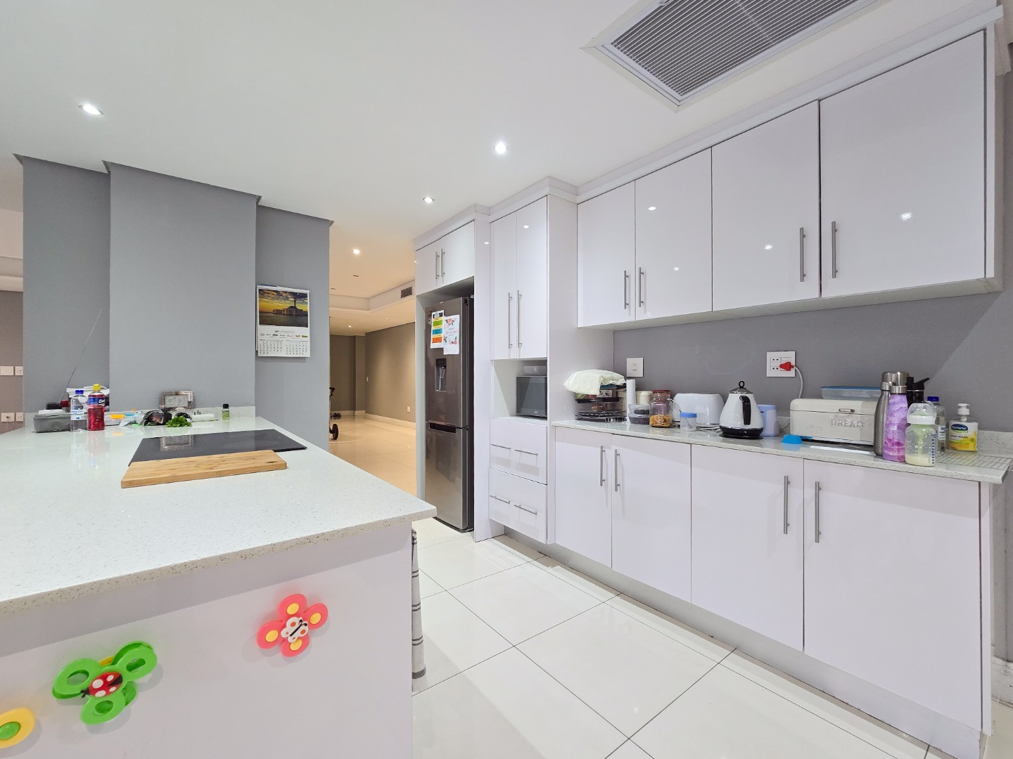 The lounge flows seamlessly into the open-plan dining area and a fully fitted kitchen boasting high-gloss built-in cupboards, a built-in hob and oven, Caesarstone countertops, a scullery, and ample storage space.