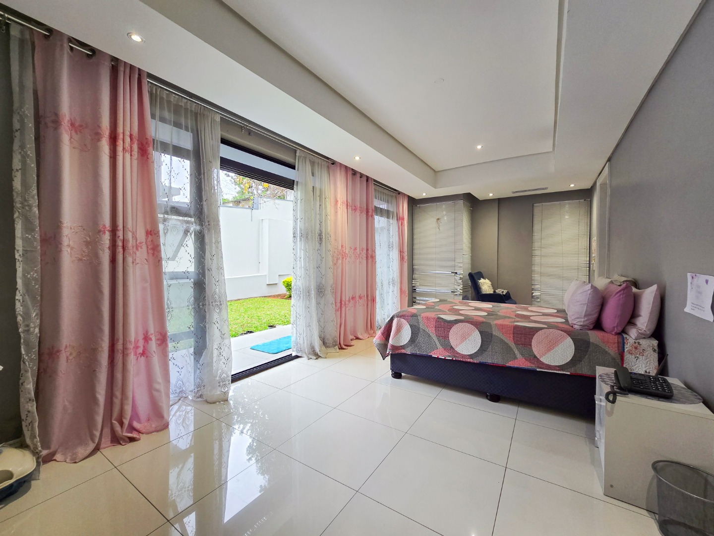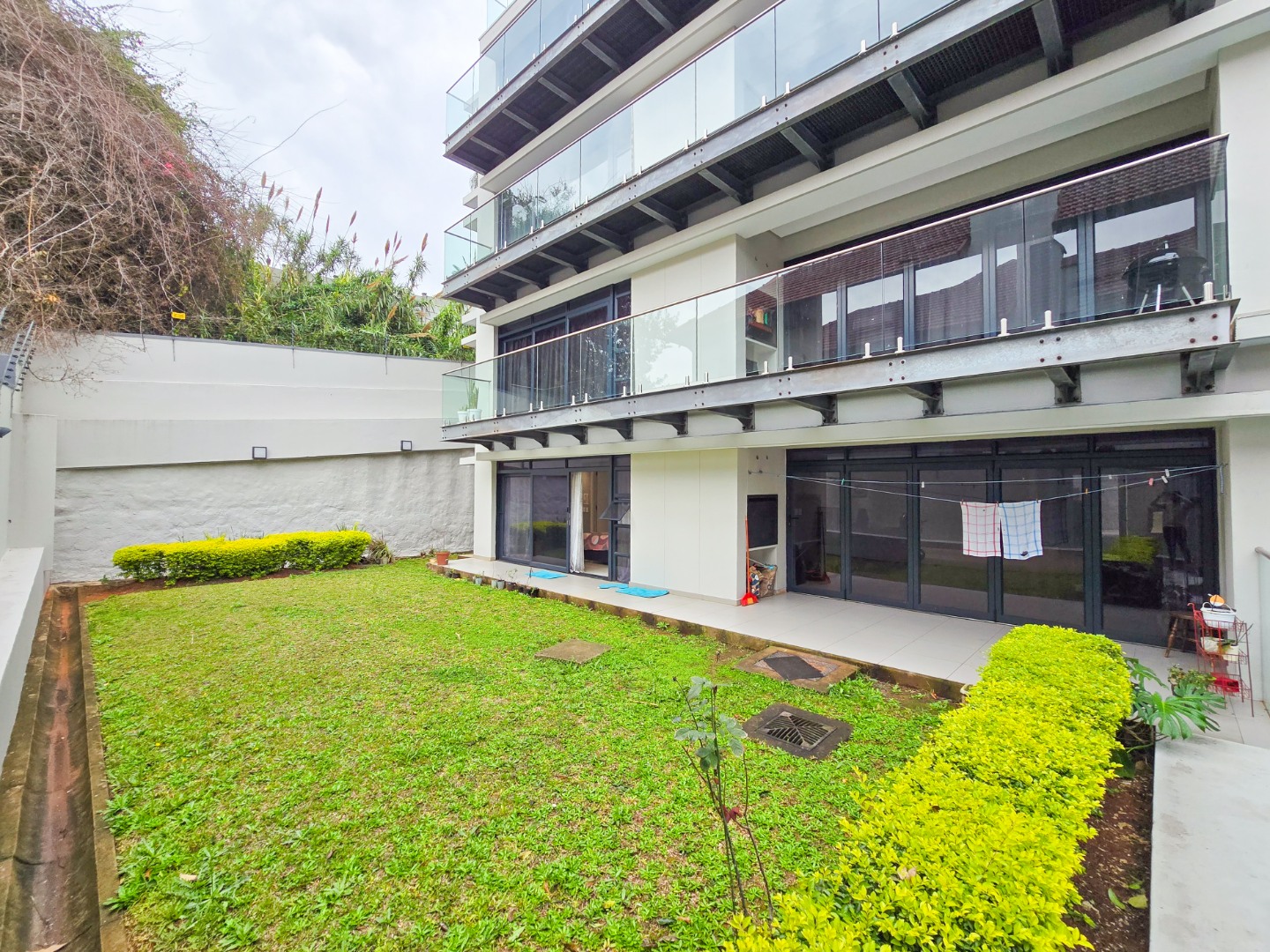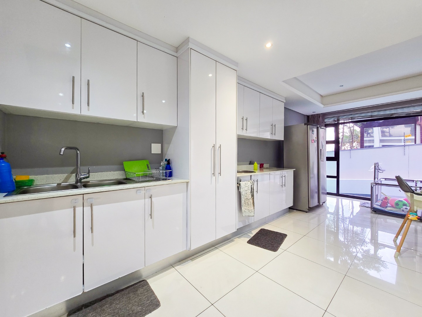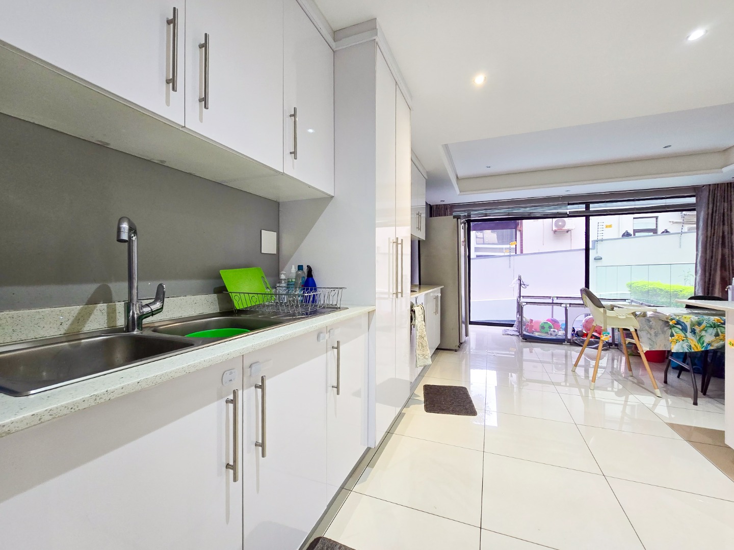 Step inside and be impressed by the sleek, contemporary finishes throughout. The apartment offers fully tiled floors and a guest loo upon entry. A passage leads to a spacious lounge area filled with natural light, featuring stackable doors that open onto a private garden area perfect for entertaining family and friends or for kids to play in.