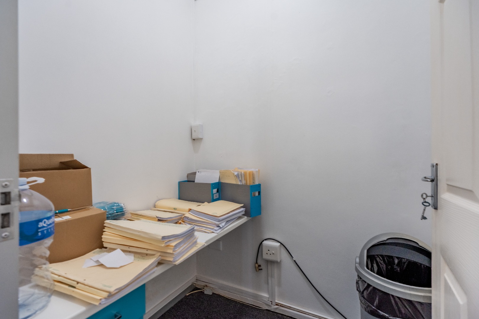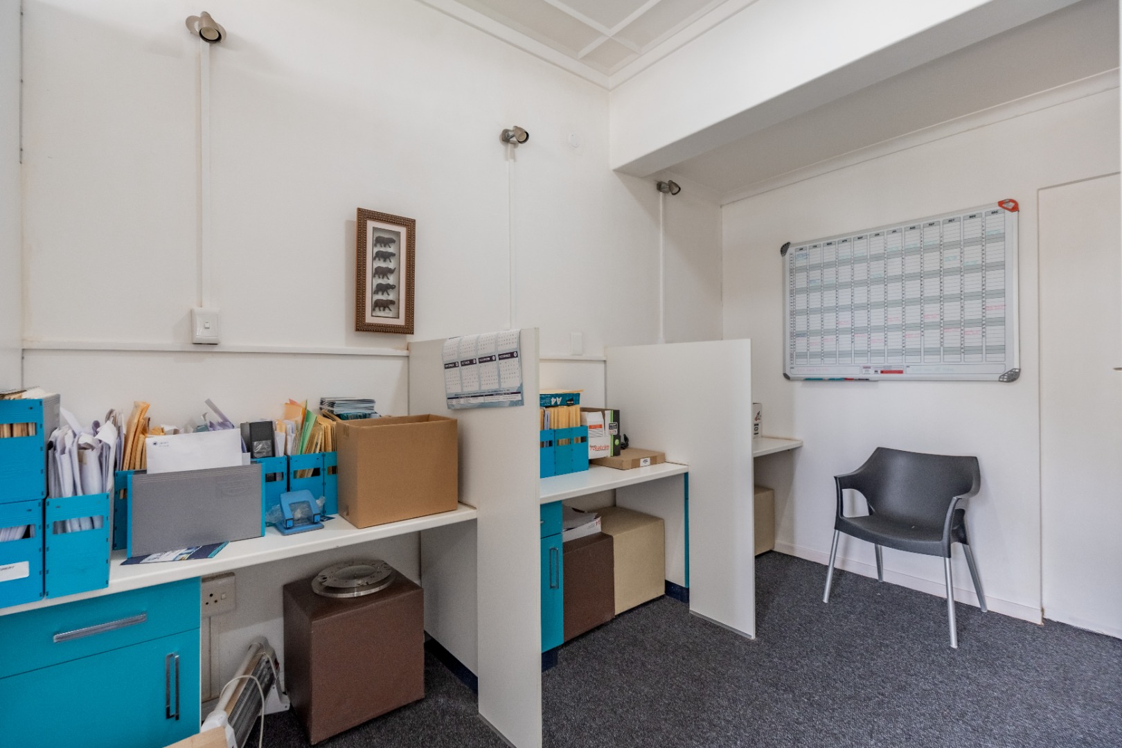 The unit offers approximately 100m² under roof, neatly partitioned into multiple offices and carpeted throughout for a professional and functional layout. A private entrance leads into a welcoming reception area, complemented by an extremely spacious outdoor section — ideal for business functions, client events or a relaxed breakout space.