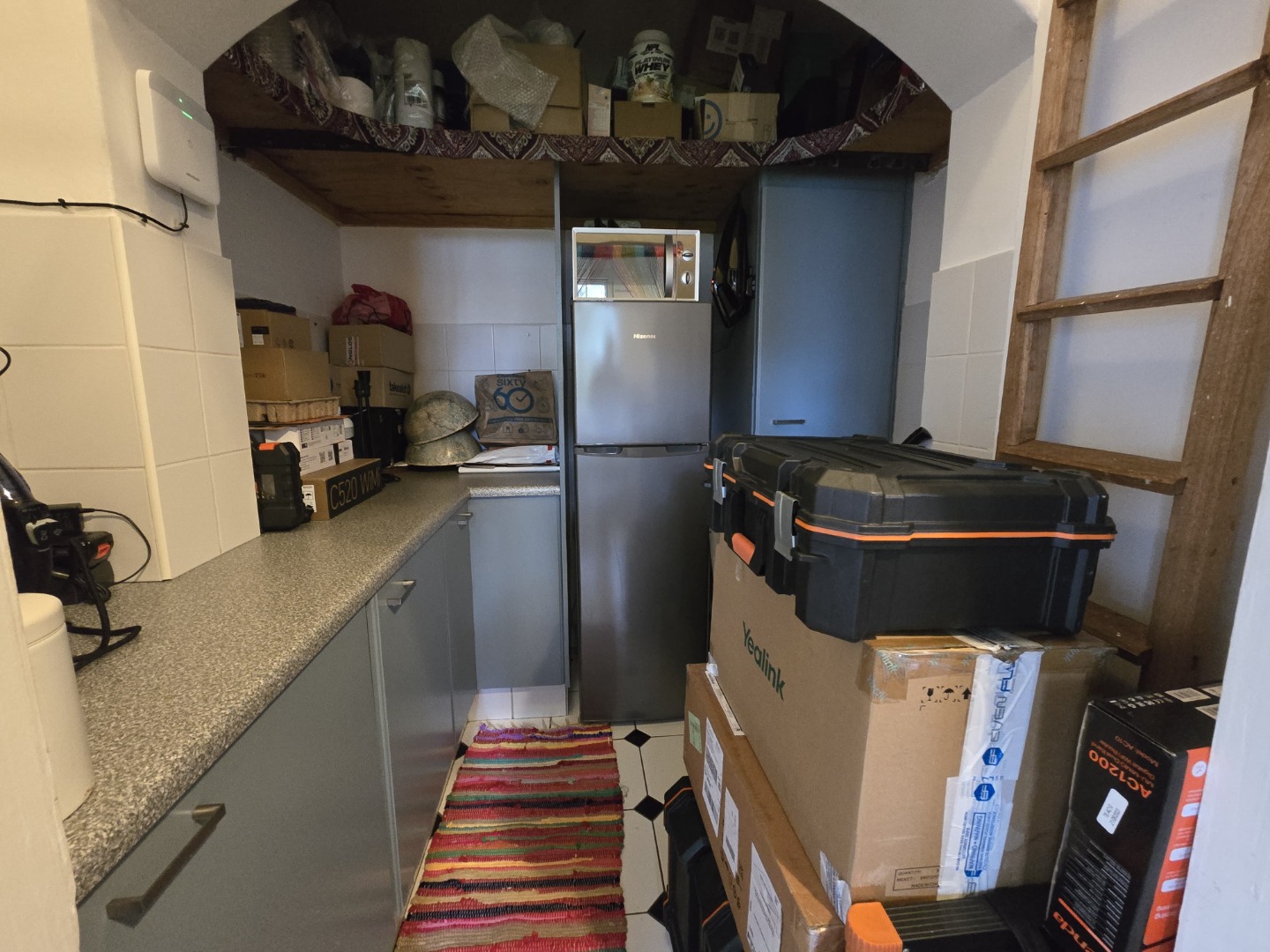 A standout feature of the apartment is its impressive high ceilings, which enhance the sense of space and natural light throughout. The warm wooden flooring in the main living areas adds character and a cozy ambiance, while the kitchen and compact living or study area are finished with sleek tiles, blending practicality with style.