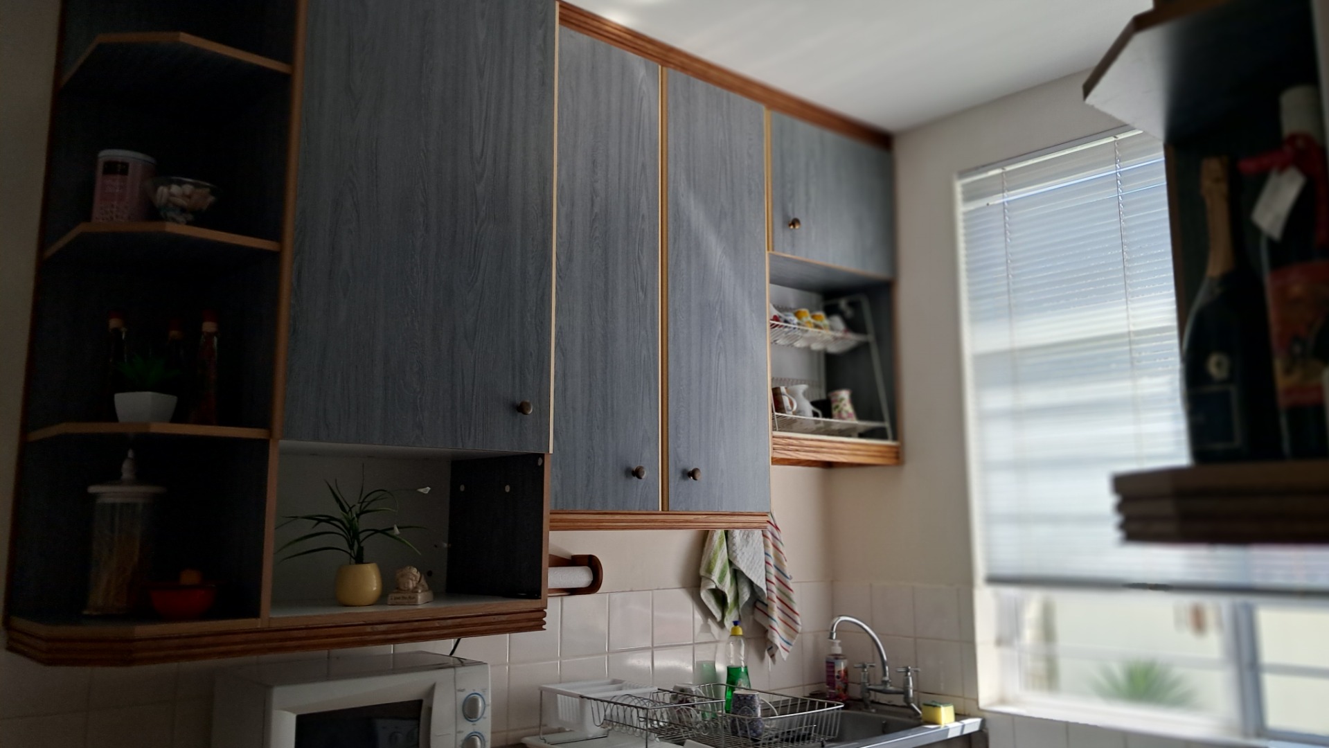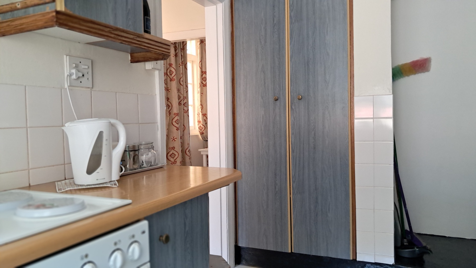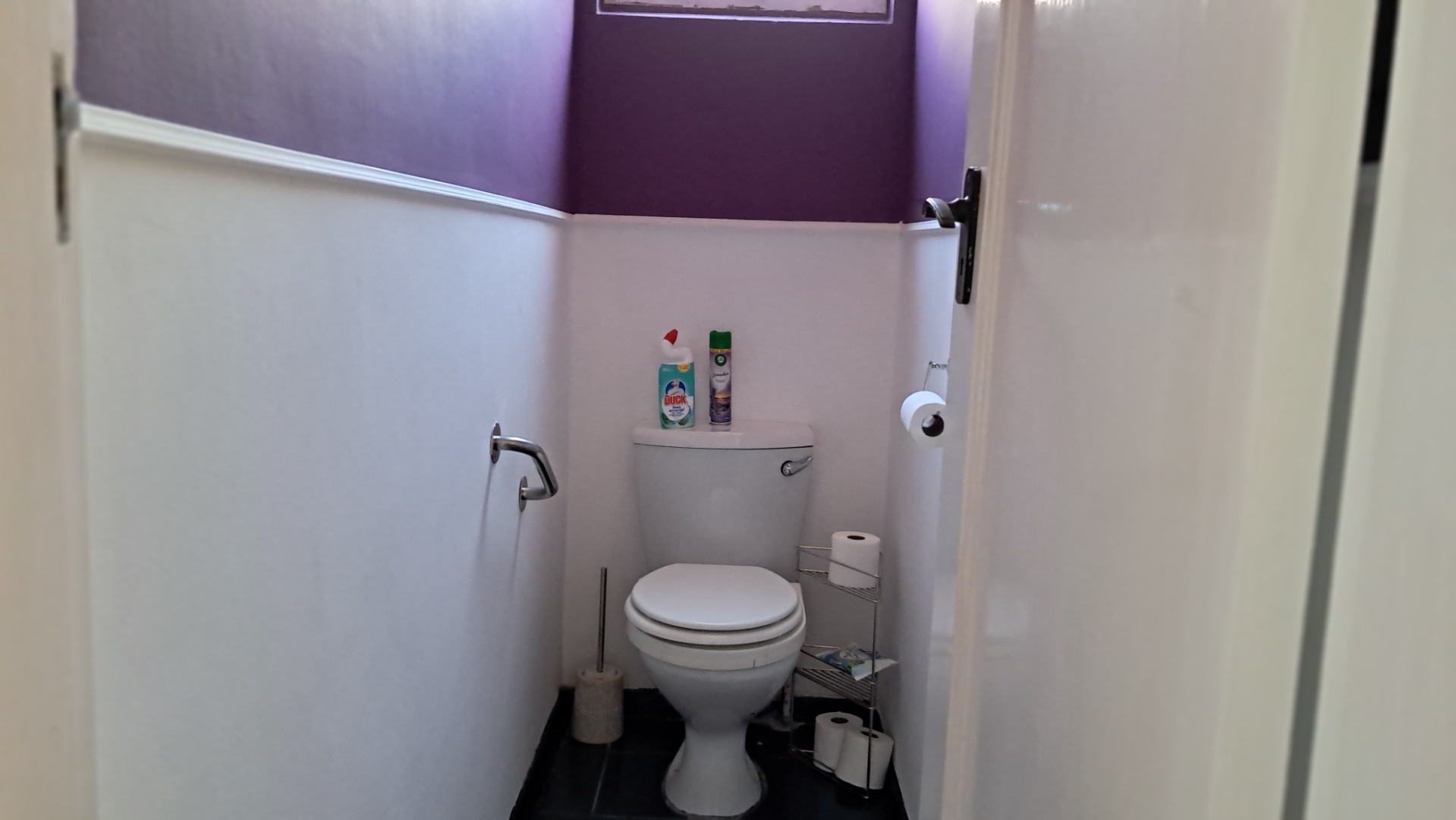 The master bedroom includes built-in cupboards, and the unit features a separate toilet and bathroom for added convenience.