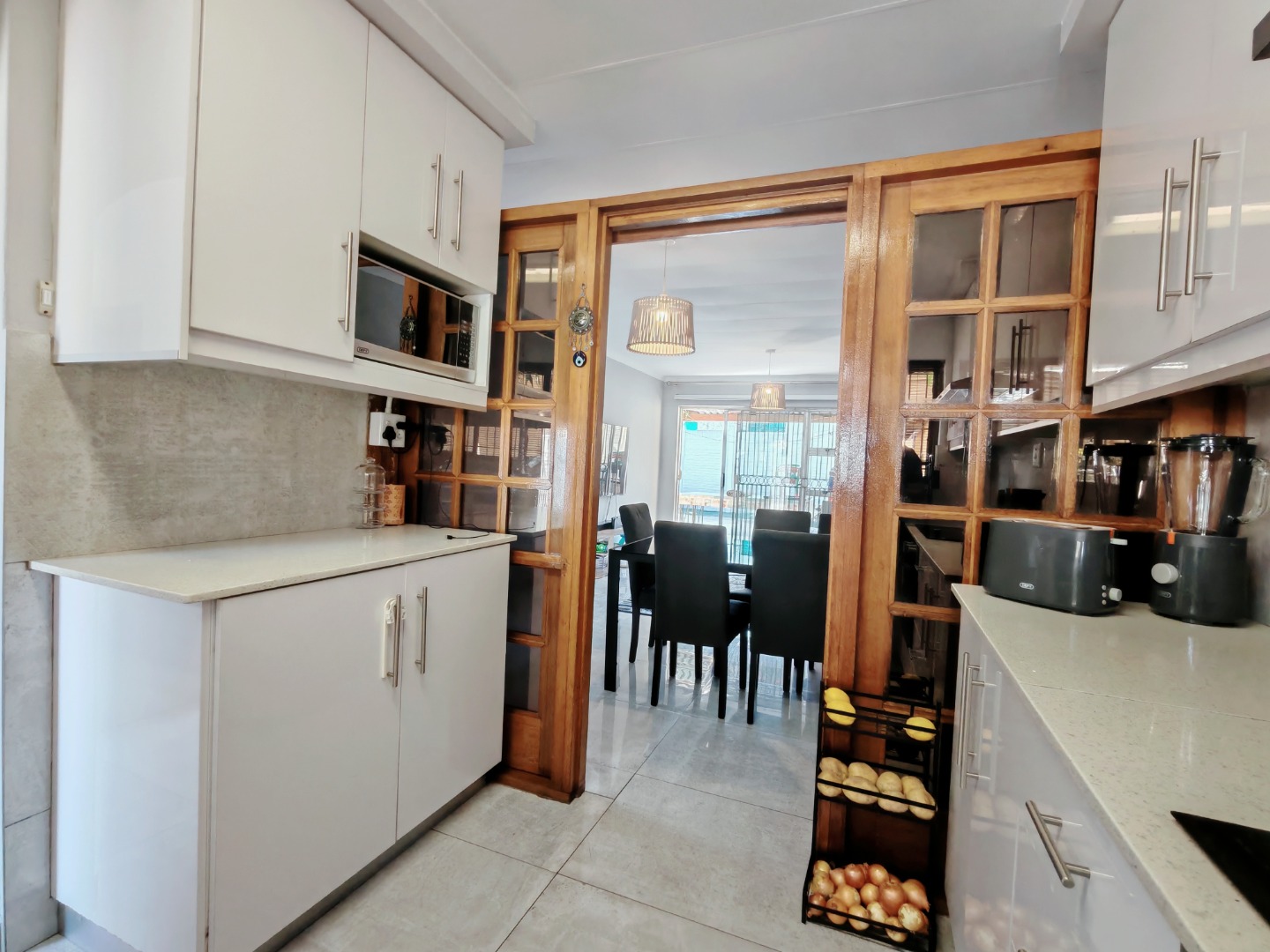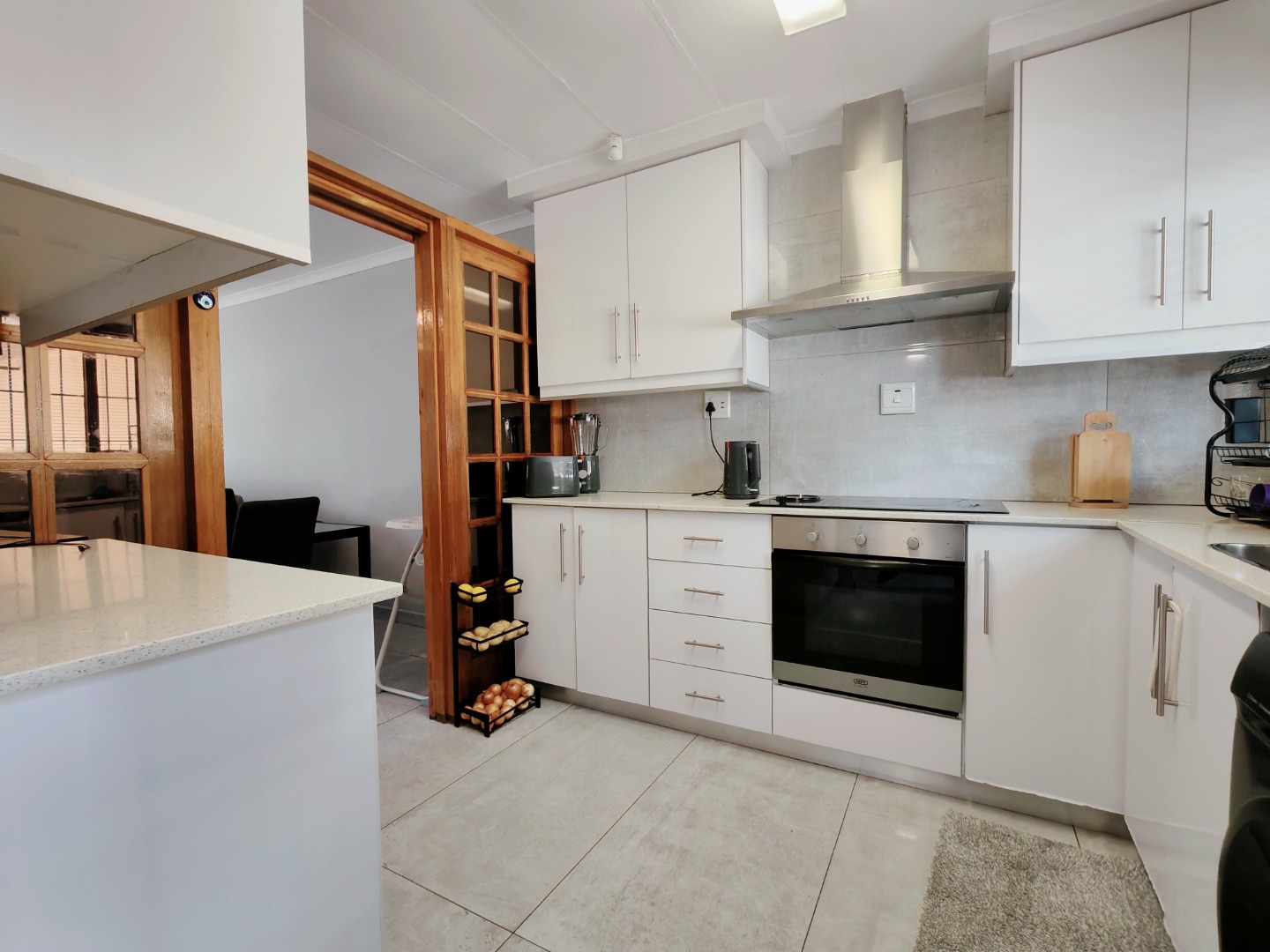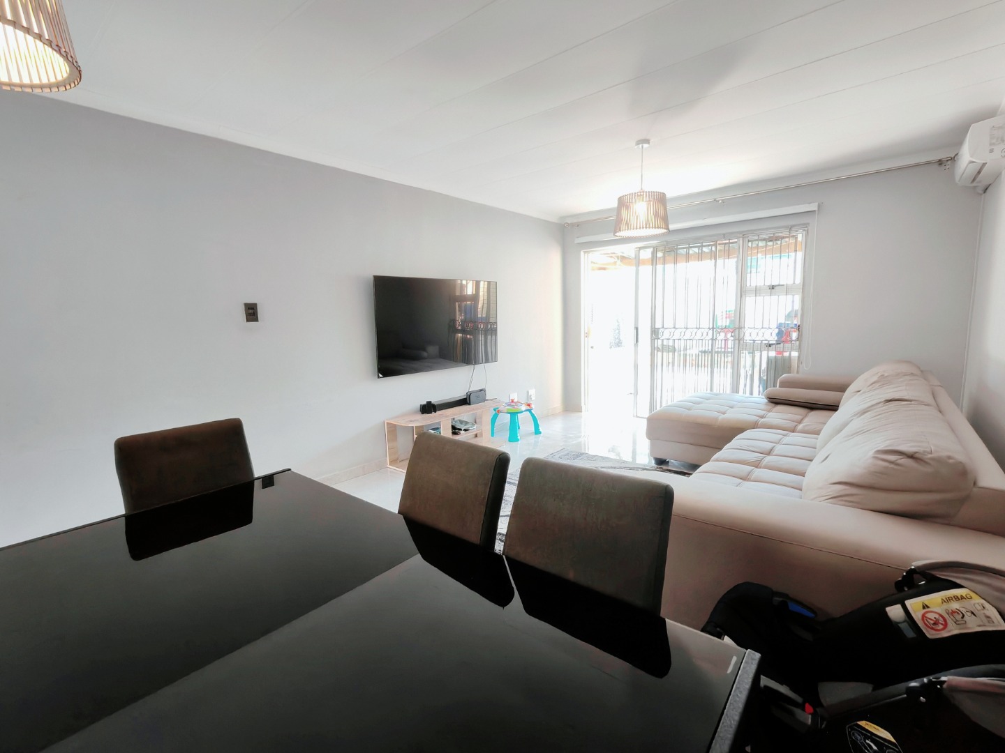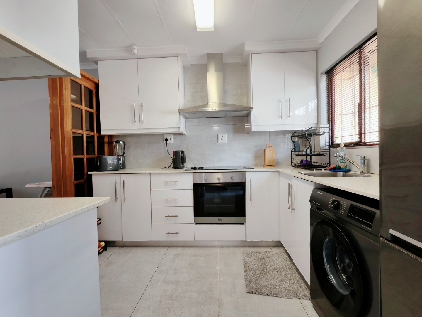 The well-equipped kitchen is both practical and functional, complete with plumbing for a washing machine. It flows seamlessly into the open-plan lounge and dining area, which is also air-conditioned for added convenience.