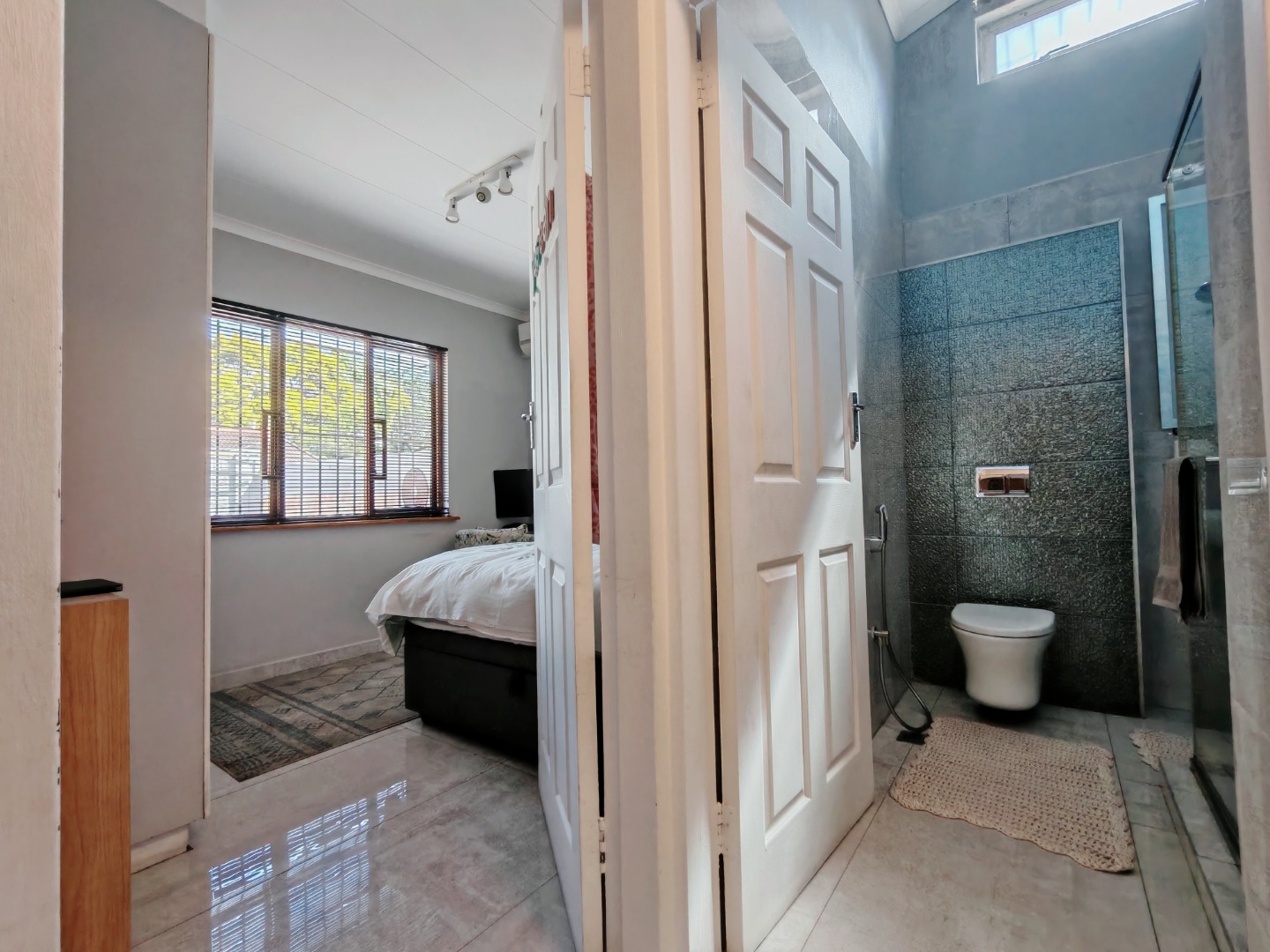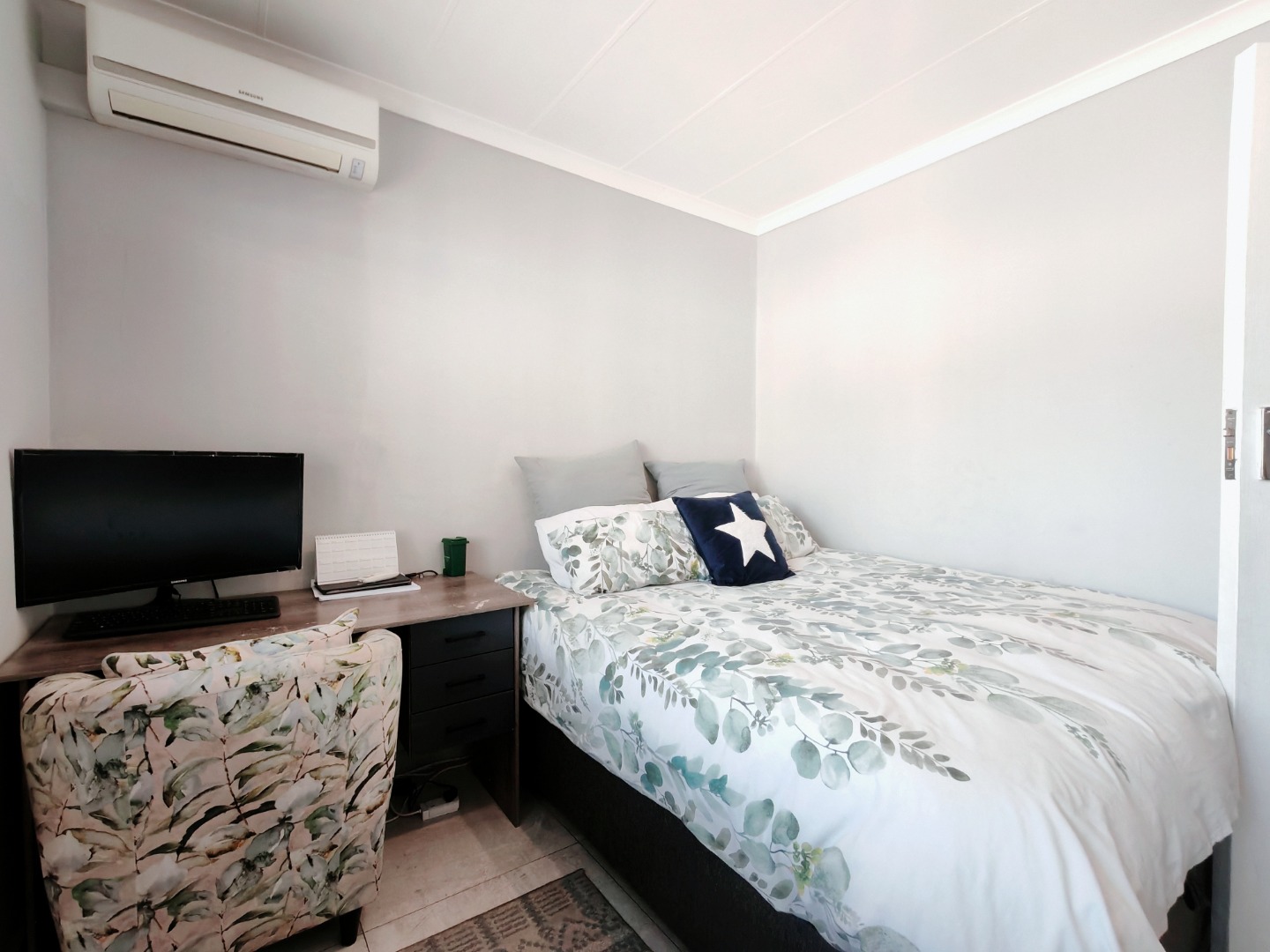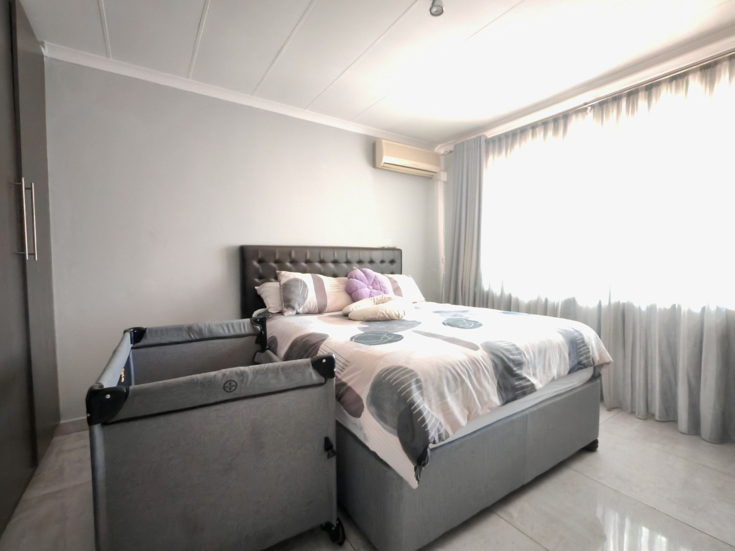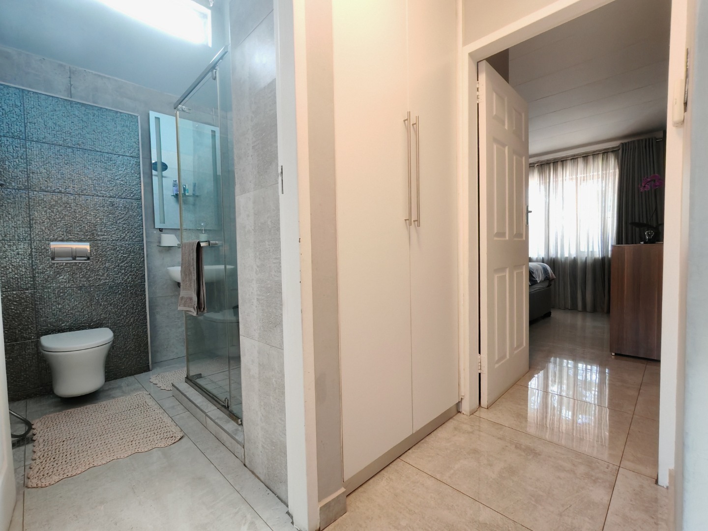 Both bedrooms are fitted with built-in cupboards and air conditioning, ensuring ample storage and year-round comfort. The modern bathroom is beautifully finished, featuring a sleek wall-hung toilet and a spacious walk-in shower.