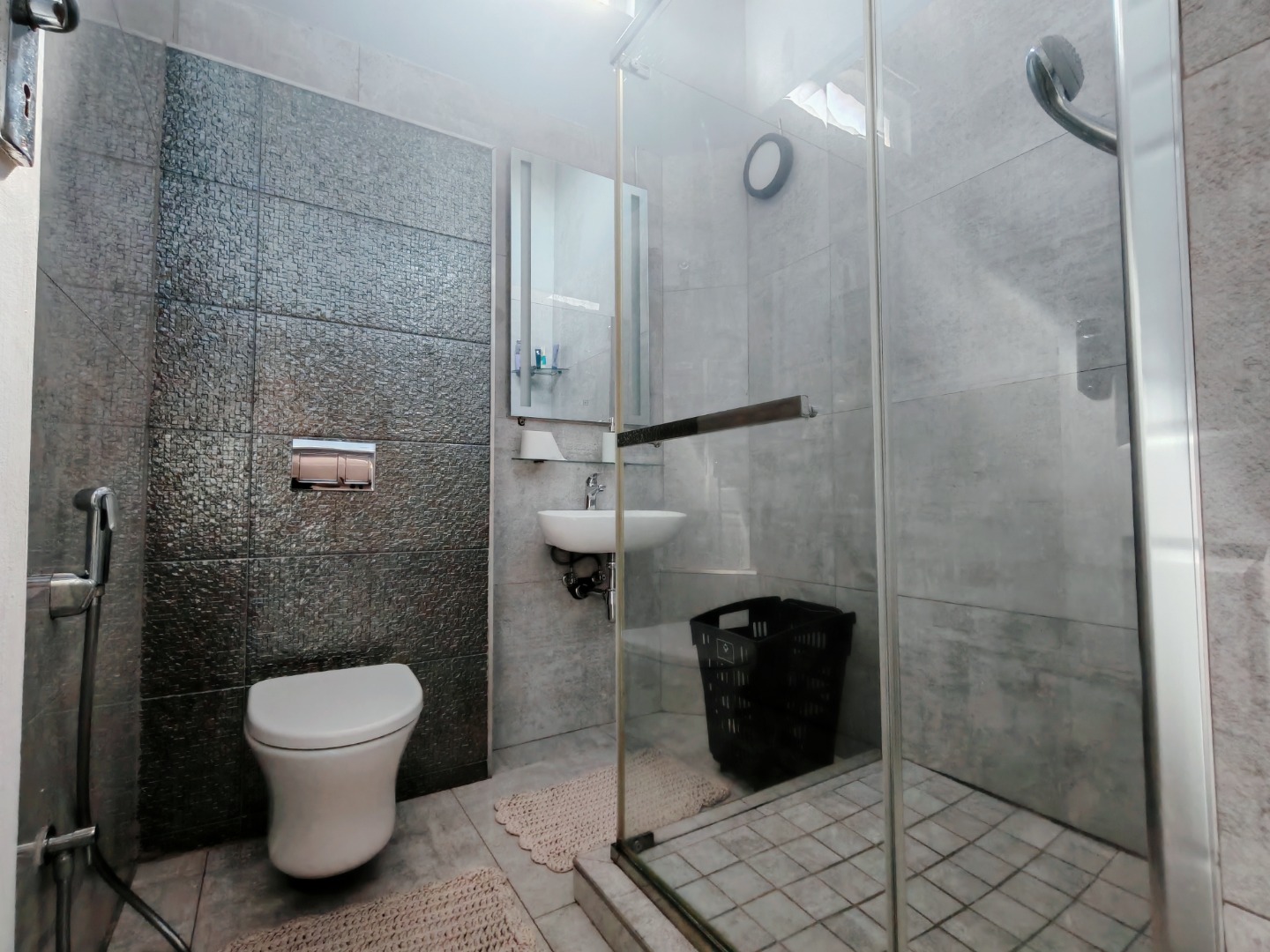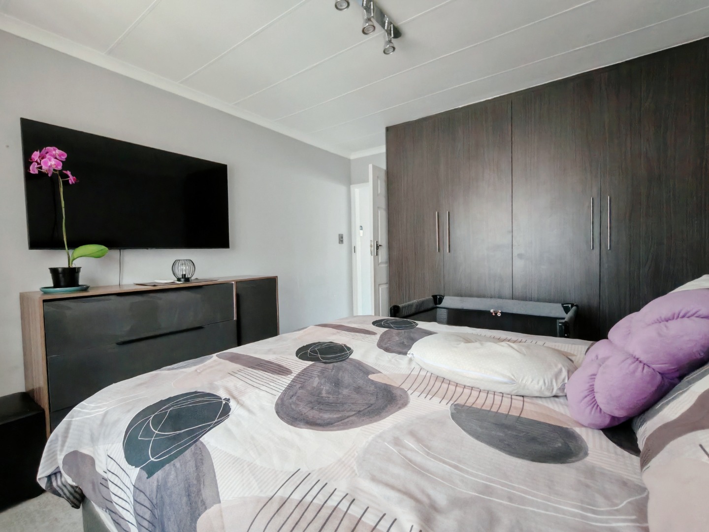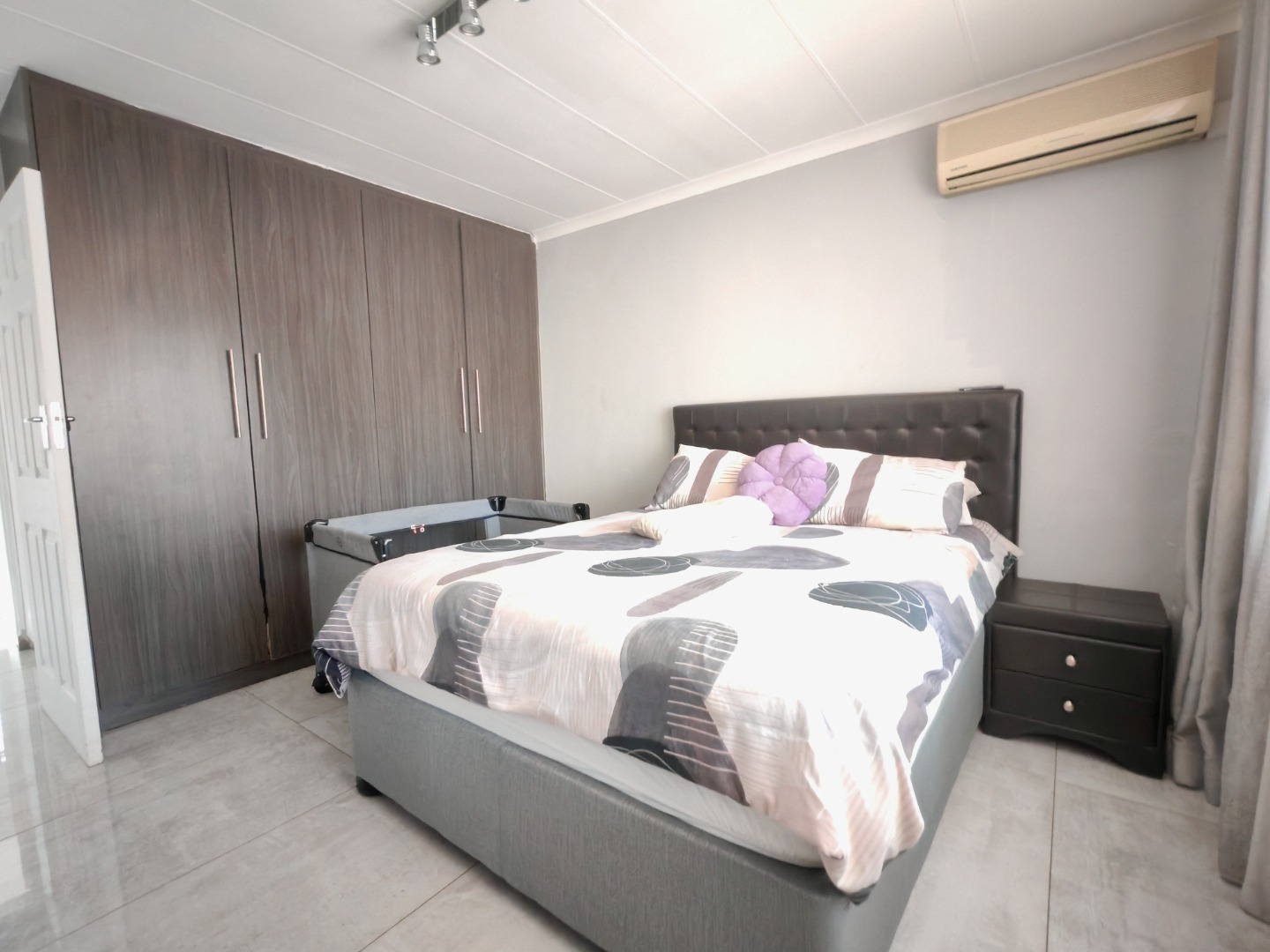 Both bedrooms are fitted with built-in cupboards and air conditioning, ensuring ample storage and year-round comfort. The modern bathroom is beautifully finished, featuring a sleek wall-hung toilet and a spacious walk-in shower.