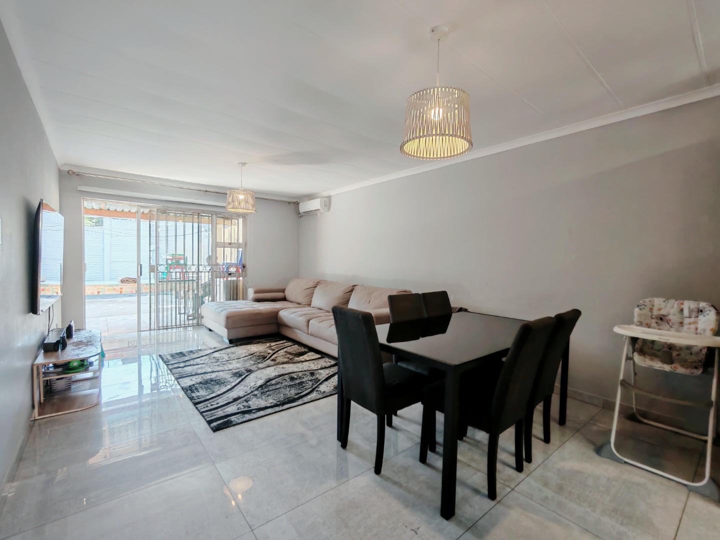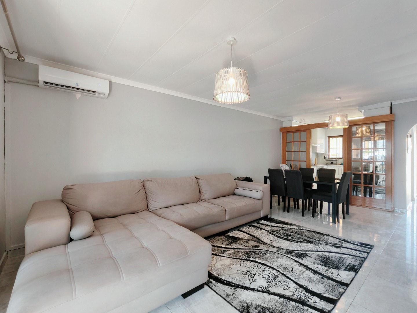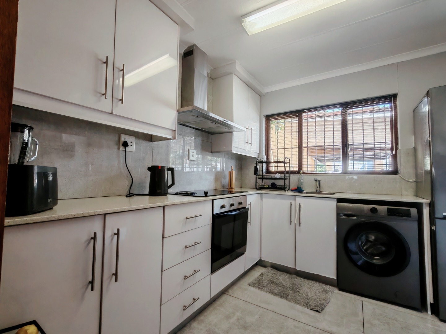 The well-equipped kitchen is both practical and functional, complete with plumbing for a washing machine. It flows seamlessly into the open-plan lounge and dining area, which is also air-conditioned for added convenience.