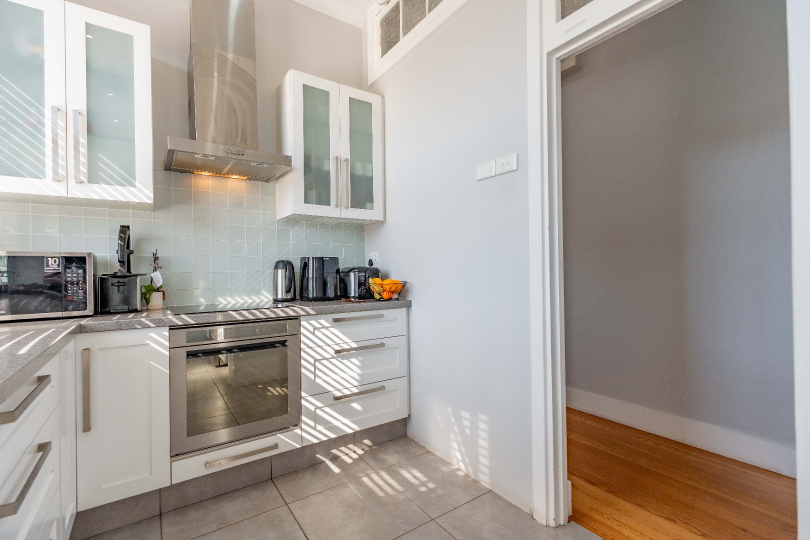 The spacious open-plan living and dining area showcases beautiful wooden flooring and offers uninterrupted views of the iconic St Thomas Mosque, a striking backdrop that adds to the property’s charm. The fully fitted kitchen is equipped with granite countertops and has direct access to the laundry lines, adding everyday practicality. Water is included in the levy.