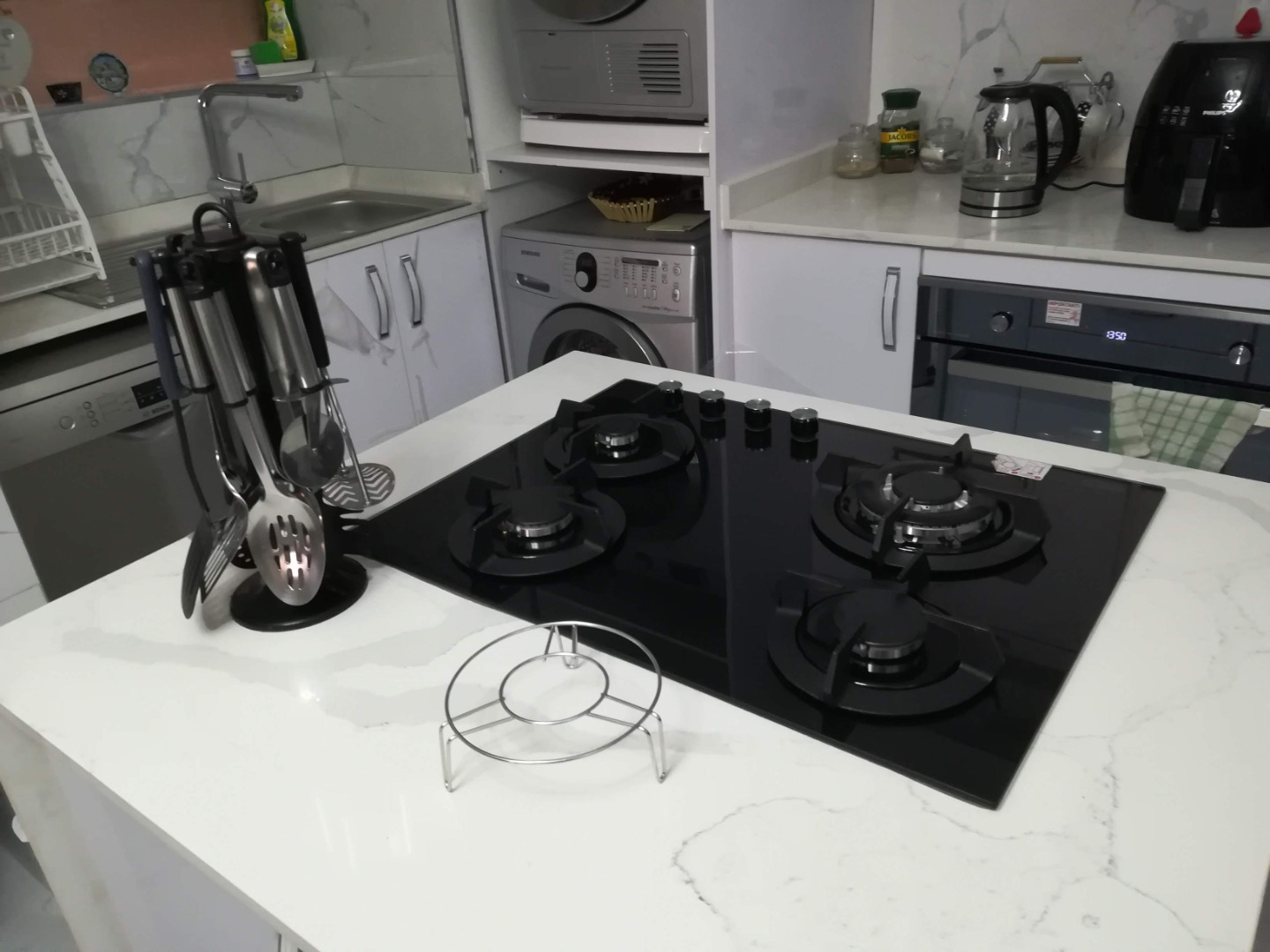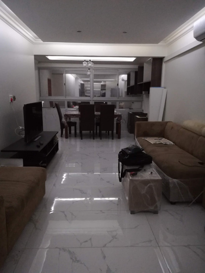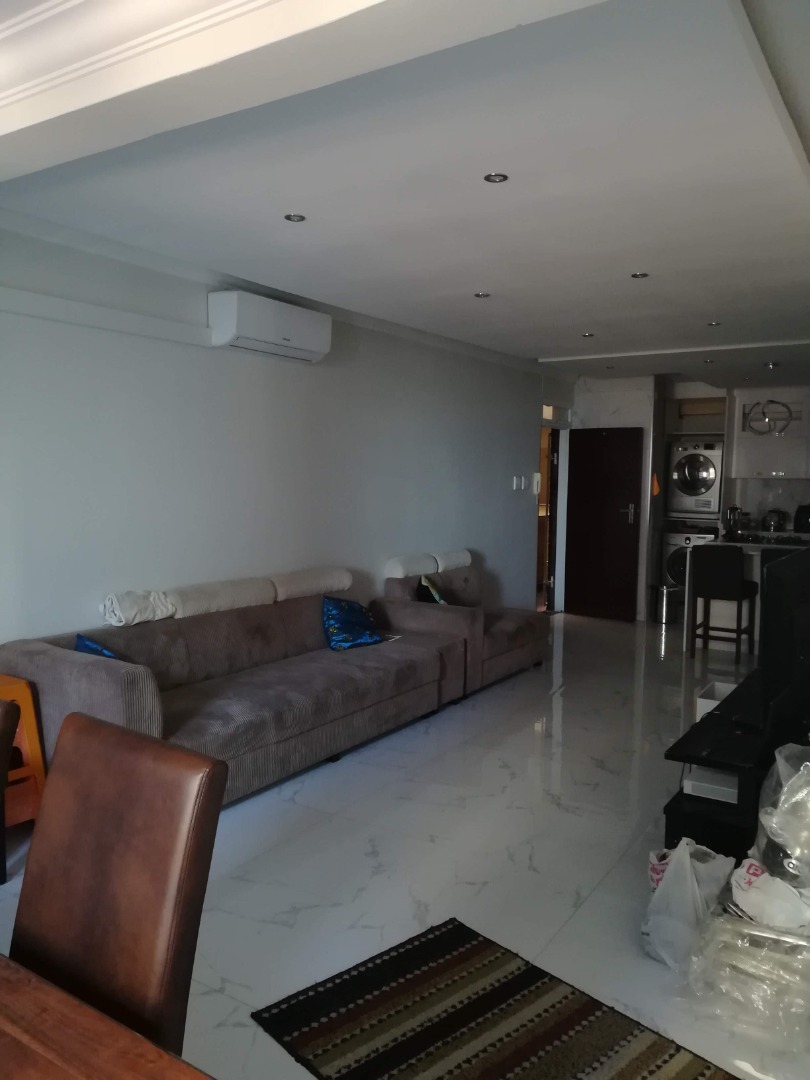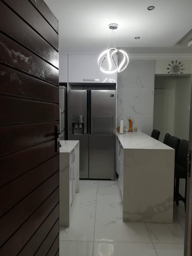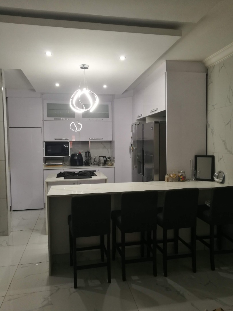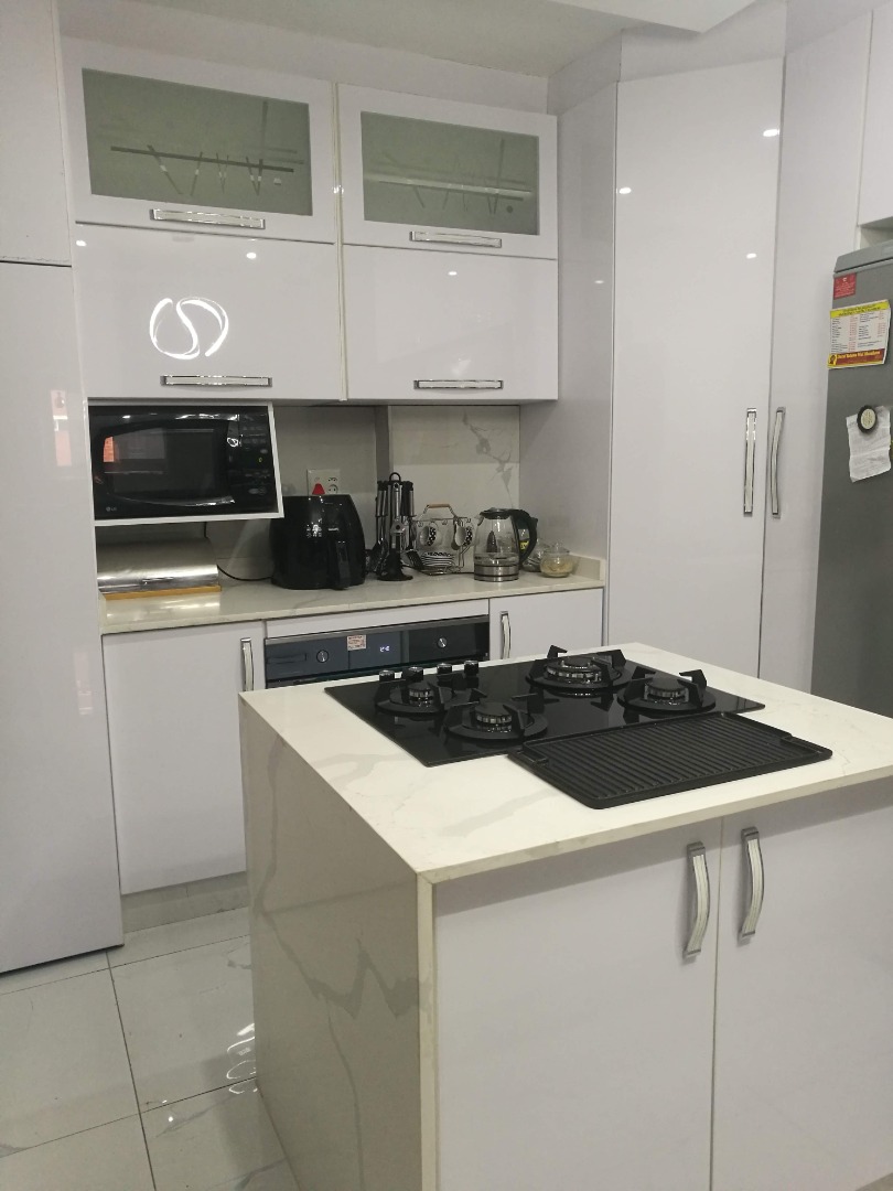 The open-plan layout seamlessly connects the pristine, modern kitchen to the lounge and dining areas, making it perfect for entertaining. The entire apartment is tiled and upgraded, offering a clean, contemporary feel.