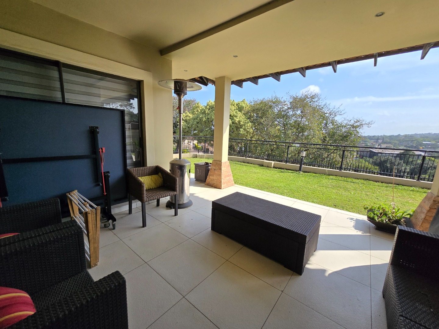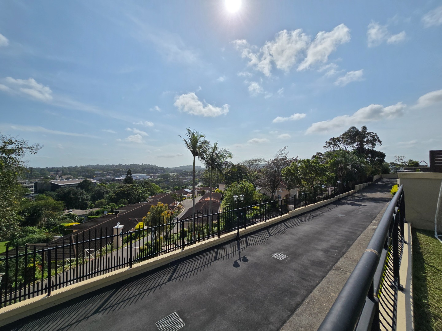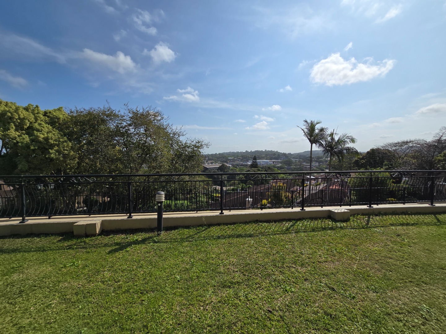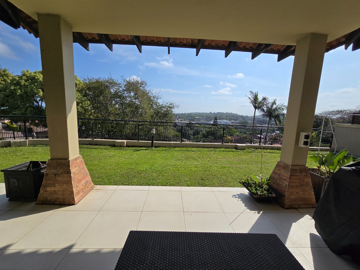 Expansive concertina sliding doors open from the formal lounge onto a spacious undercover veranda, offering breathtaking inland views of Westville Central. The private garden enhances the serene atmosphere, and additional outdoor amenities include a wash basin and a small staff quarters with ablution facilities.
