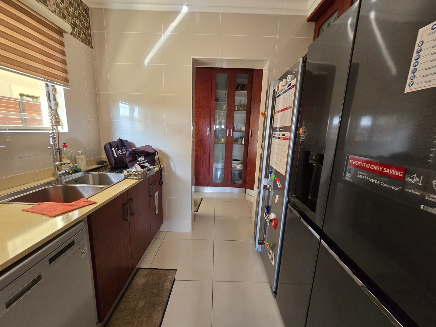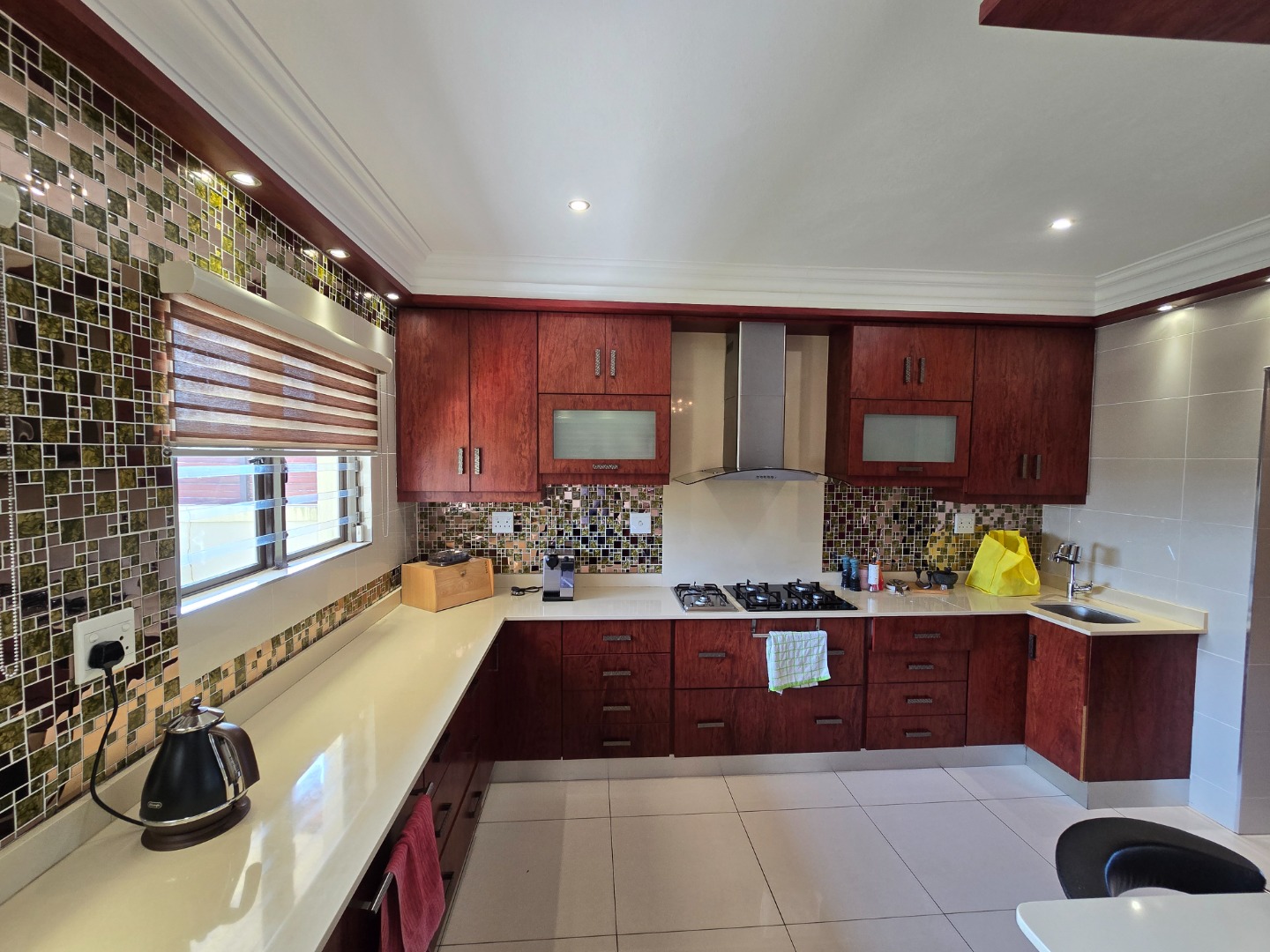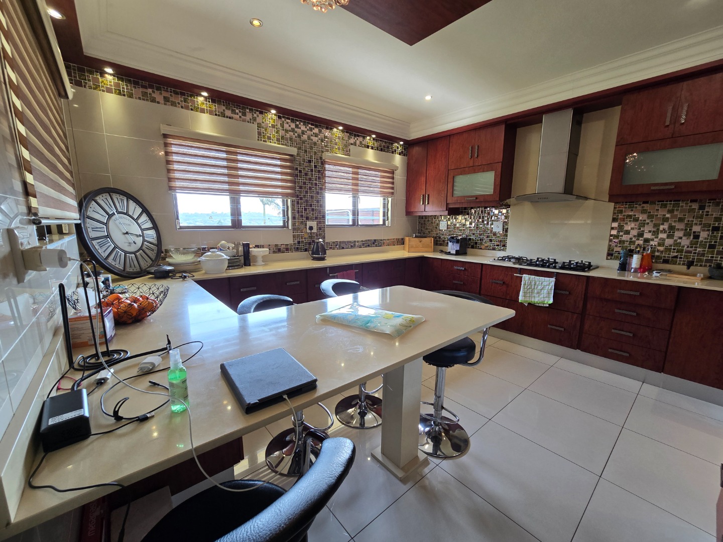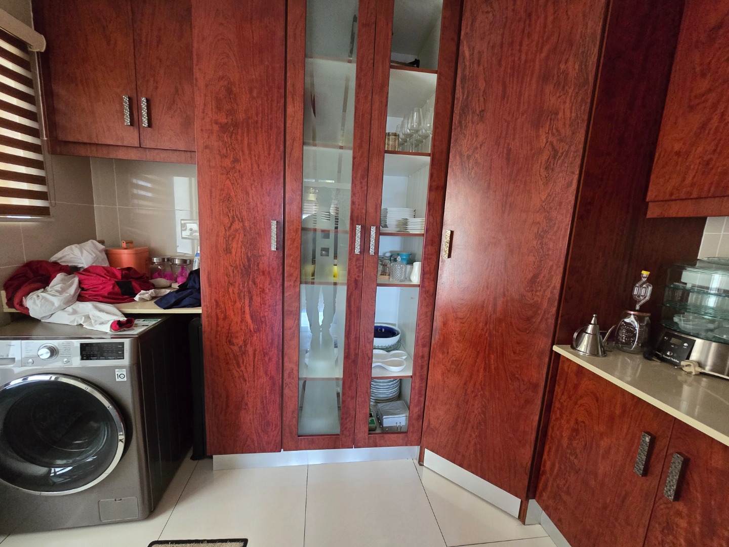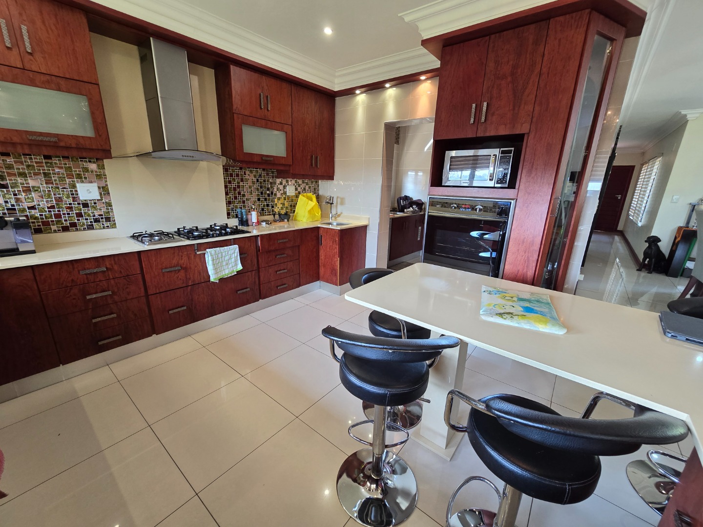 The kitchen boasts sleek Caesarstone countertops, a breakfast nook, ample cupboard space, a gas stove with an extractor fan, and a built-in under-counter oven. Adjacent to the kitchen is a well-equipped scullery with plumbing for a dishwasher, a double basin sink, and space for two double-door refrigerators. Beyond the scullery, a separate laundry room provides additional built-in cupboards for extra storage.