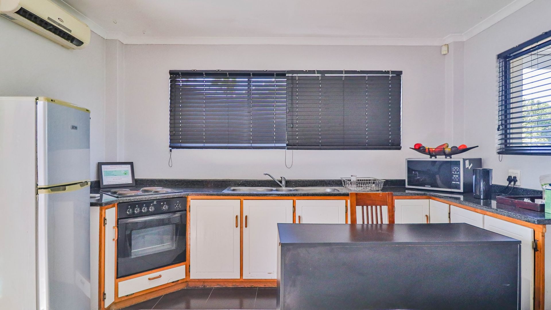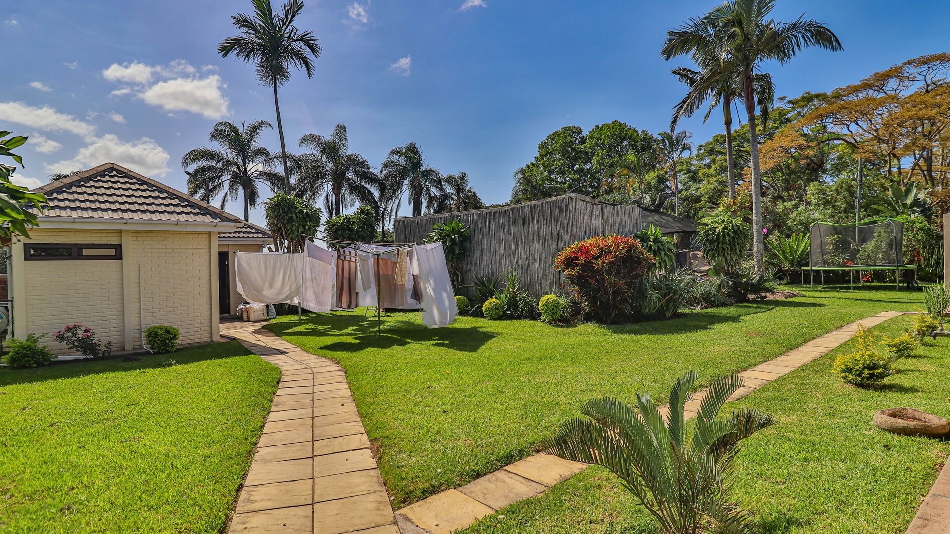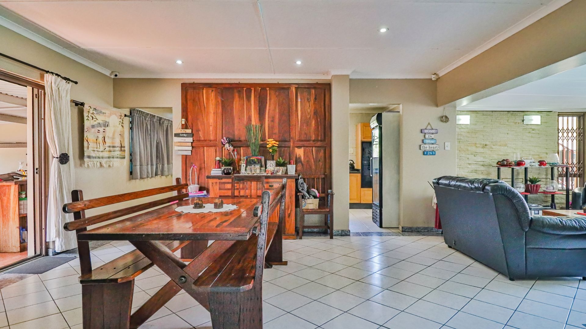 The interior boasts a distinct lounge area, an informal dining area and a dedicated formal dining room, providing ample space for both formal entertaining and relaxed family living. The presence of a single kitchen with granite tops, solid wood cupboards, gas hob, and eye-level ovens, is the central hub for culinary activities. Practical amenities such as a laundry room and dedicated storage facilities contribute to the home's functional appeal. The residence is also equipped with air conditioning and is wheelchair-friendly, ensuring comfort and accessibility for all occupants.