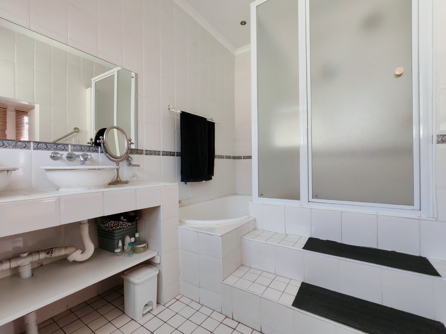 The residence features three comfortable bedrooms, two of which are en-suite, providing privacy and convenience. Each bedroom benefits from natural light and includes built-in wardrobes for ample storage. The two bathrooms are well-appointed with double vanities, large mirrors, and tiled finishes, offering both a built-in tub and glass-enclosed showers. While presenting an opportunity for contemporary updates, the existing layout provides a solid foundation for a personalized family home.