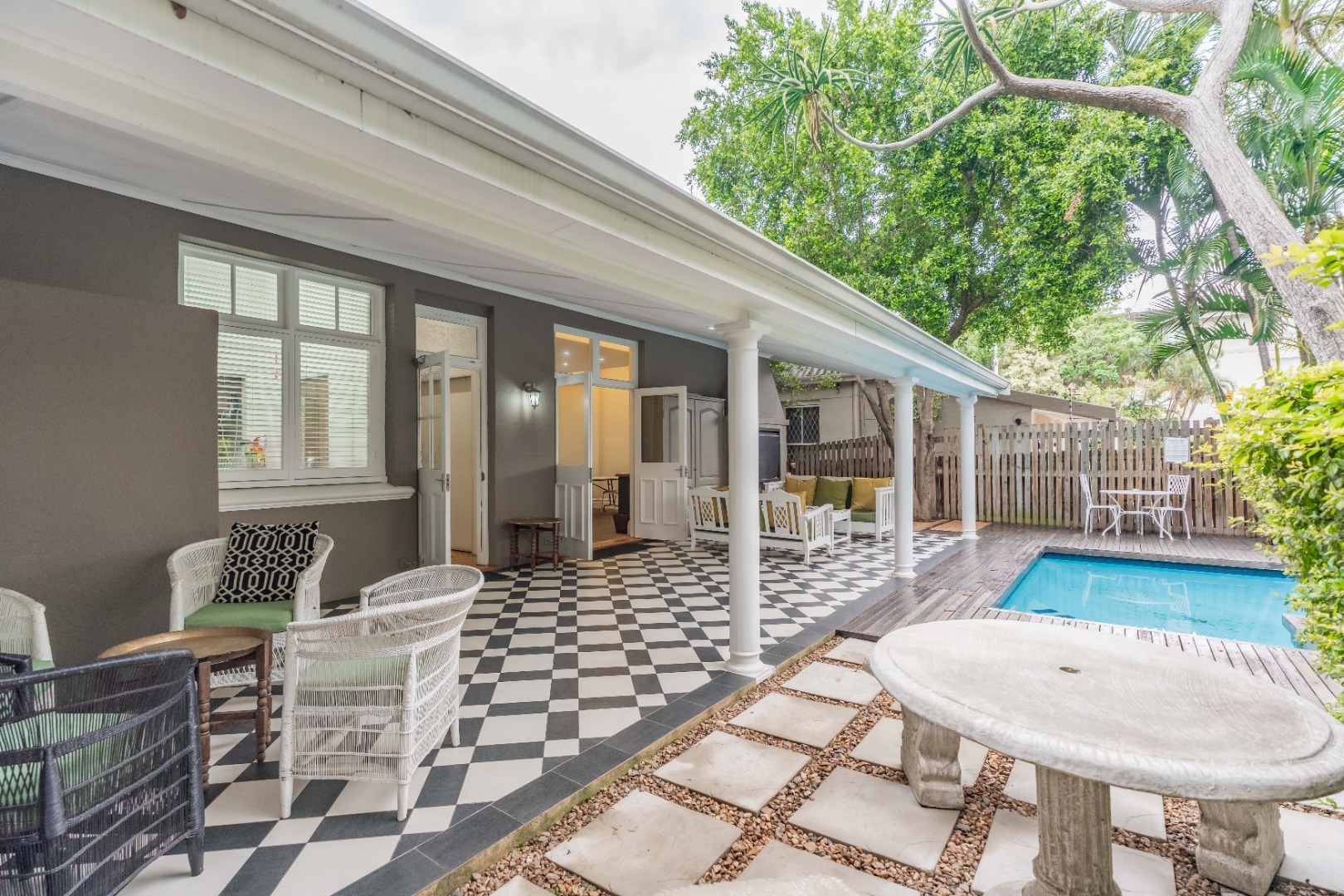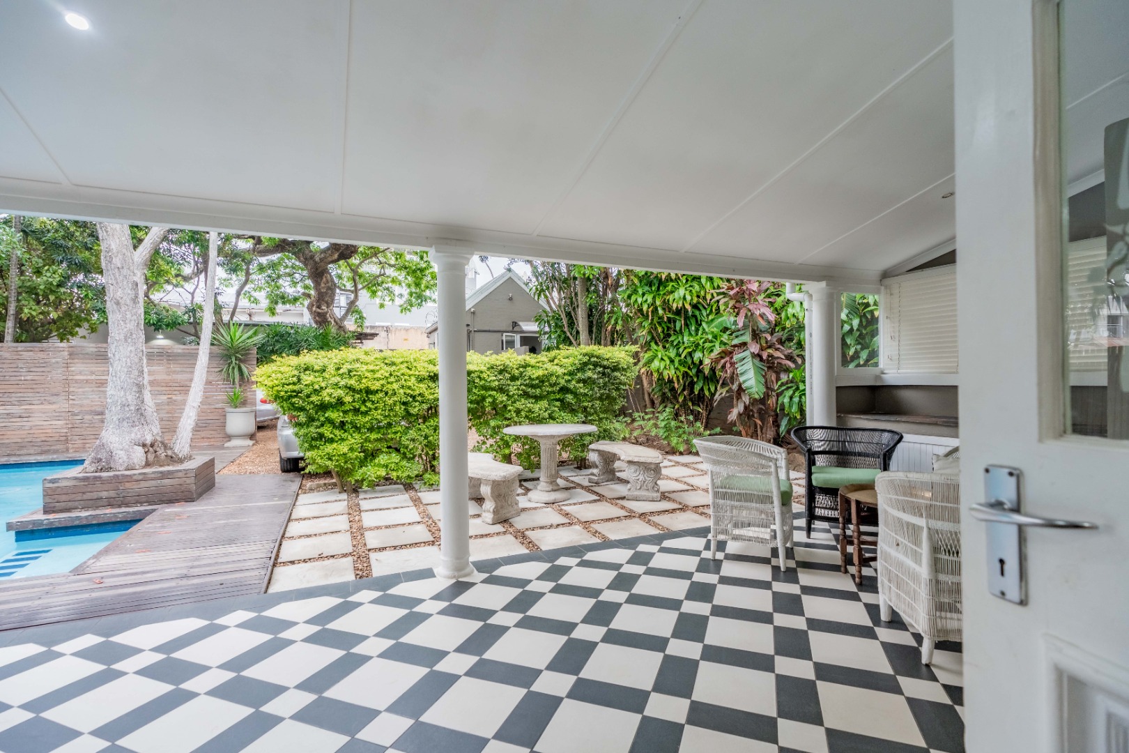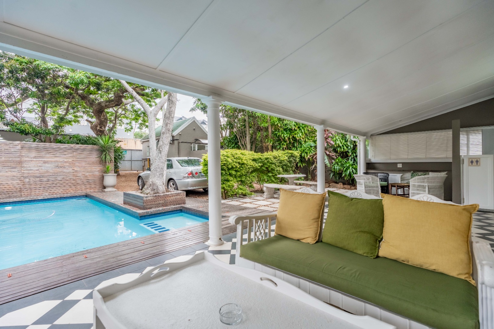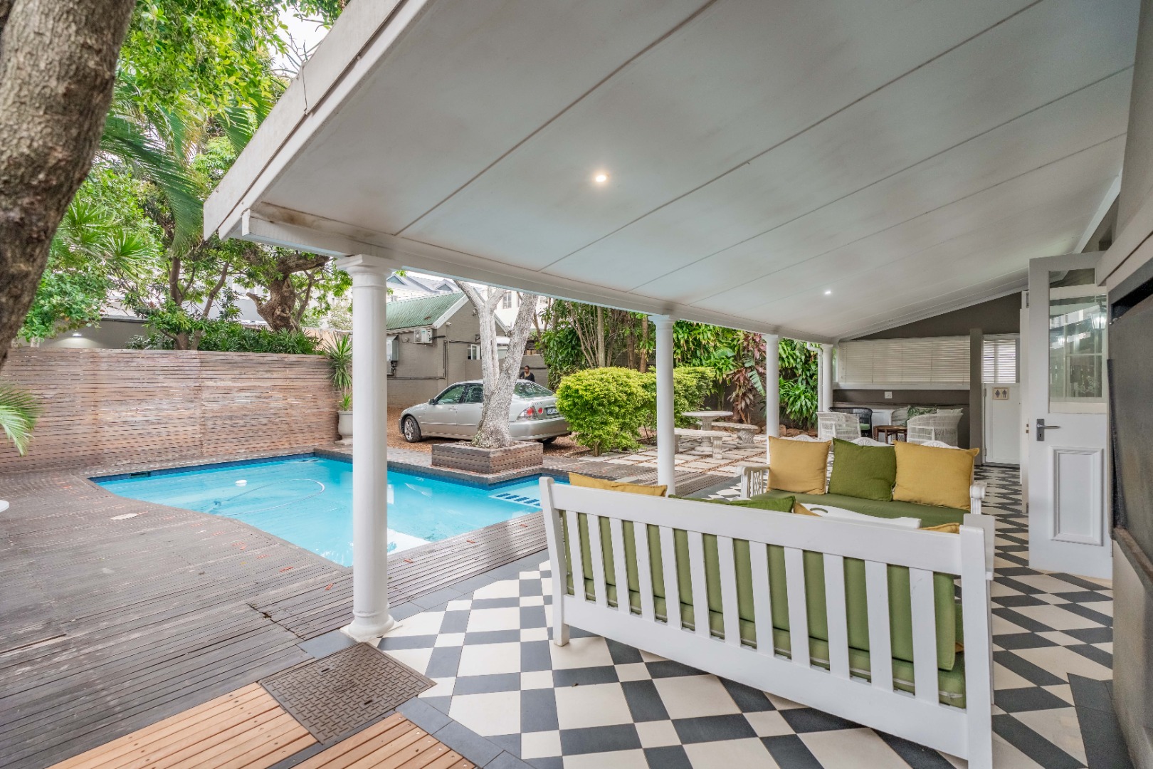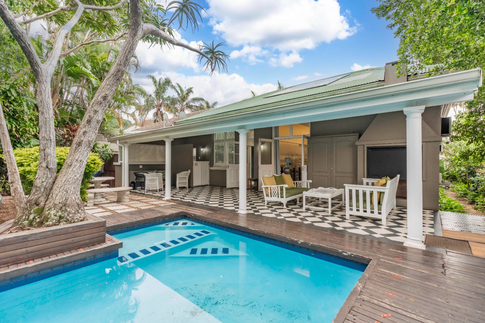 The property features three en suite bedrooms plus an en suite flatlet, perfect for guests or extended family. A conference room provides space for meetings or training sessions, while the veranda overlooks a sparkling swimming pool, creating an inviting area for relaxation or entertaining.