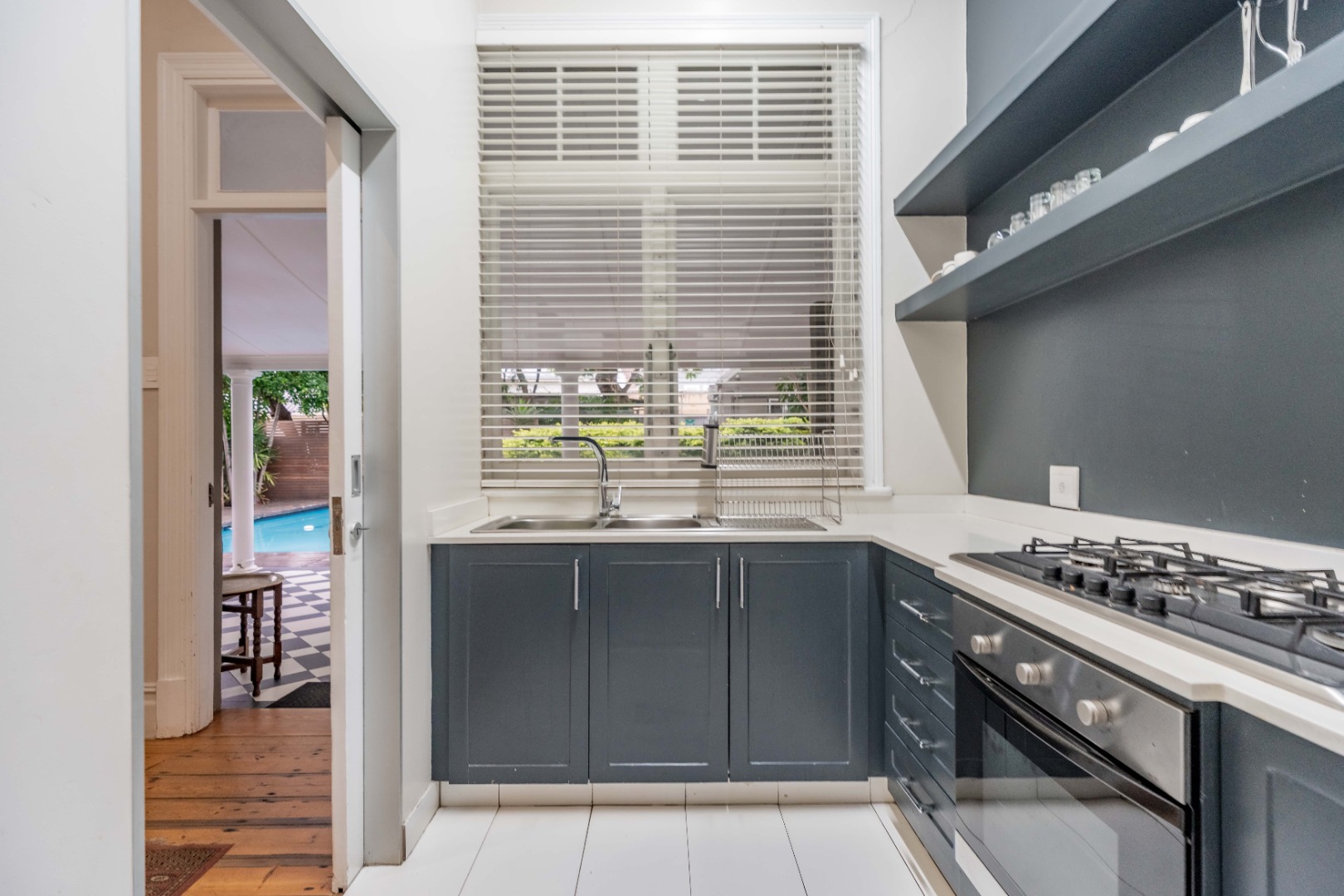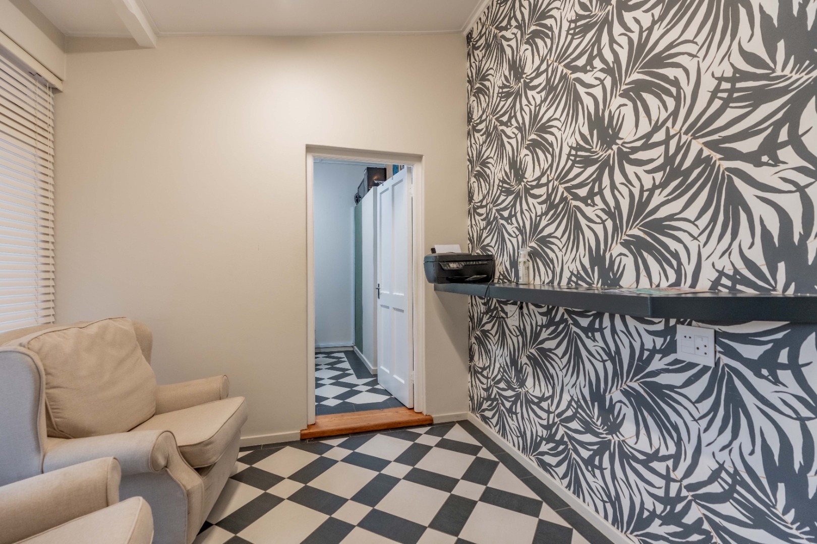 The modern kitchen is fitted with granite countertops, a gas hob and under-counter oven. There’s also a guest loo, an office with waiting room, and a laundry room for added practicality.