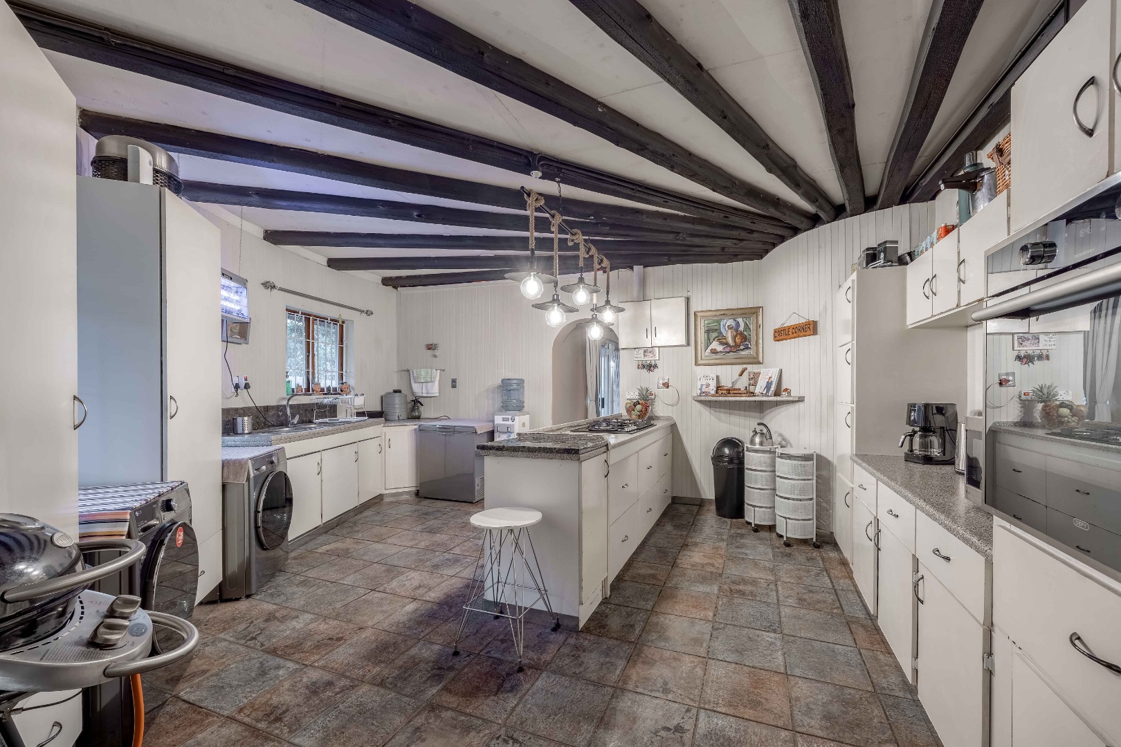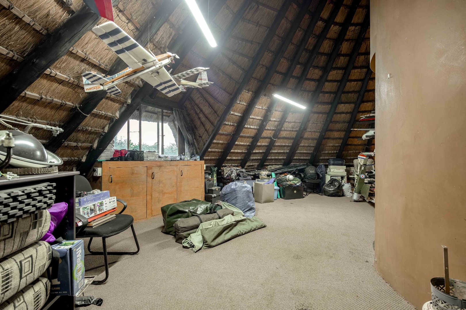 The moment you step inside, the world outside simply disappears. This is a home that makes you forget the rush, offering a private sanctuary with all the practical space you’ve been looking for. Head up the front stairs and through the entrance hall into a home laid out simply and naturally. The living space opens into a lounge with a cozy fireplace and high thatched ceilings that keep the air fresh and cool. This flows right into a big dining area, perfect for family meals. Tucked between the dining room and the kitchen is a surprise staircase leading to an attic/hobby room—the ideal spot for a hideaway or creative space. The kitchen itself is bright and well-equipped, built for everything from morning coffee to long Sunday roasts. Down the hallway, you’ll find three spacious, light-filled bedrooms. There is a modern full family bathroom, and the main bedroom features its own private en-suite shower. For those working from home, the dedicated office provides a quiet, focused spot, but it’s large enough to easily become a 4th bedroom if your family needs the extra room.
