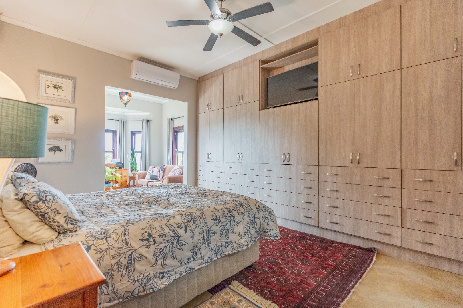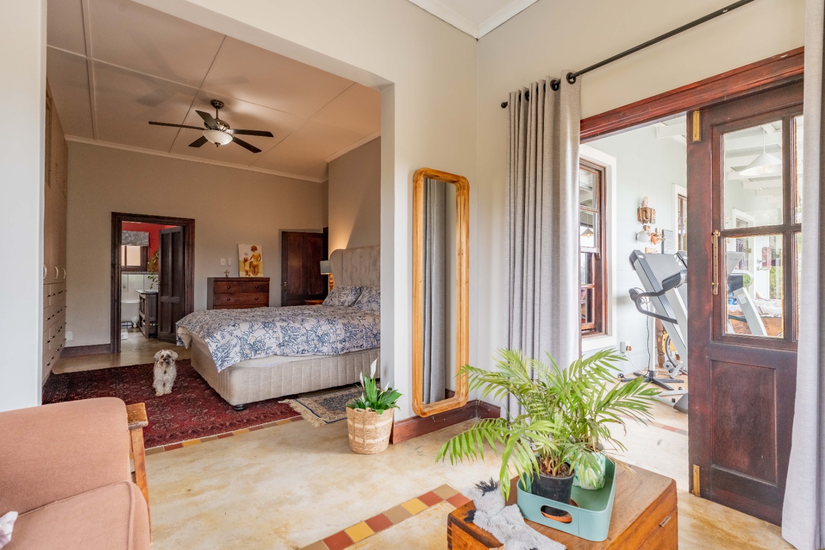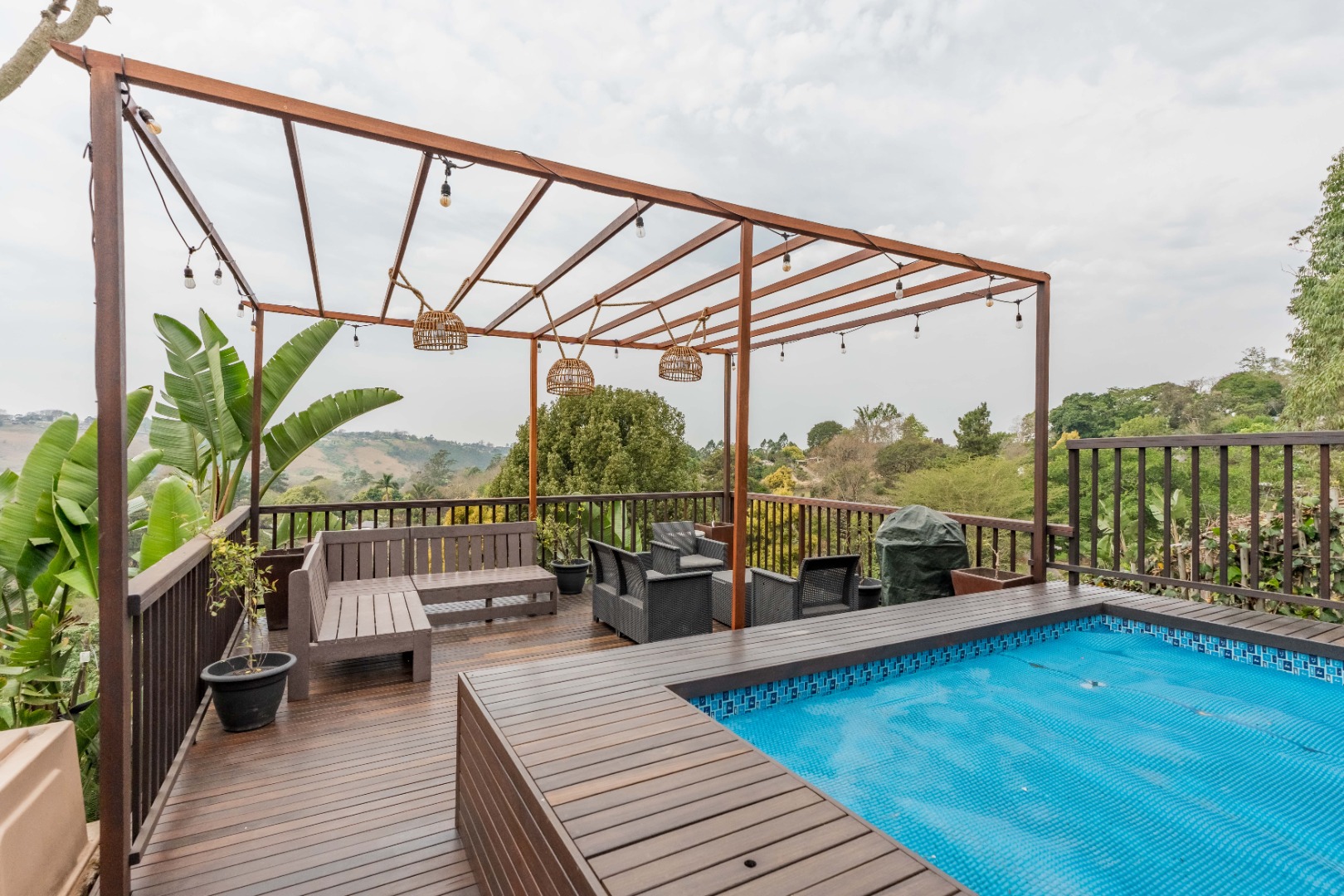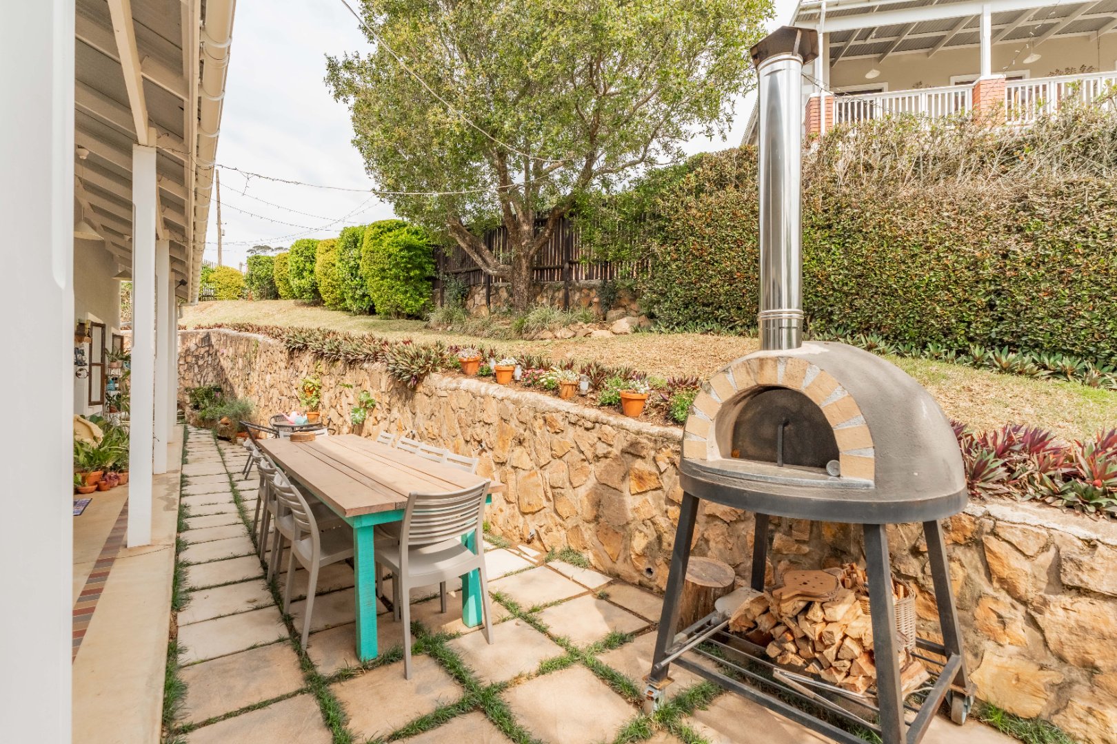 An expansive entertainment deck opens out to the garden, where a private splash pool awaits. The pool is fitted with an 8KVA inverter heating system, ensuring year-round enjoyment. This home has been designed with sustainability in mind, featuring a full 8KVA solar system, two 5KVA lithium batteries, and 12 sun panels — giving you peace of mind during load-shedding and dramatically reducing running costs. A 1,000-litre rainwater harvesting tank adds another layer of eco-friendly living.