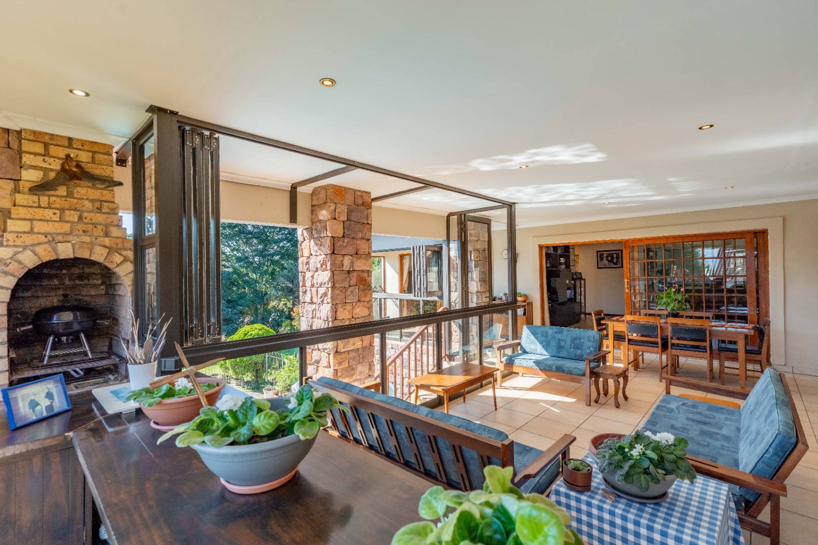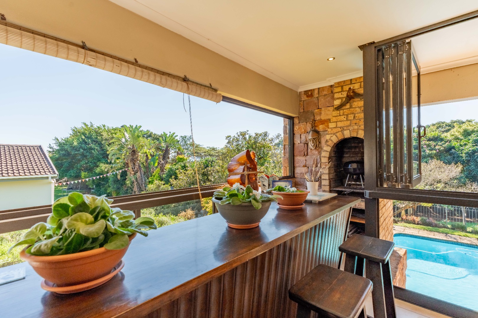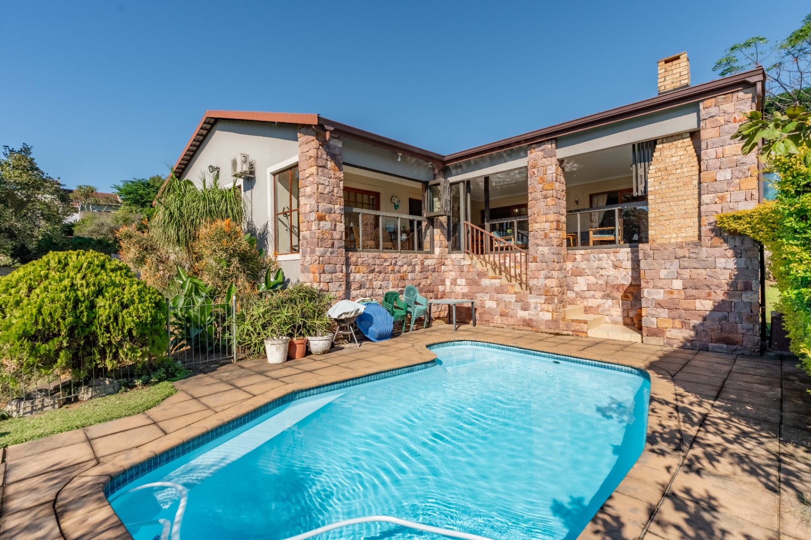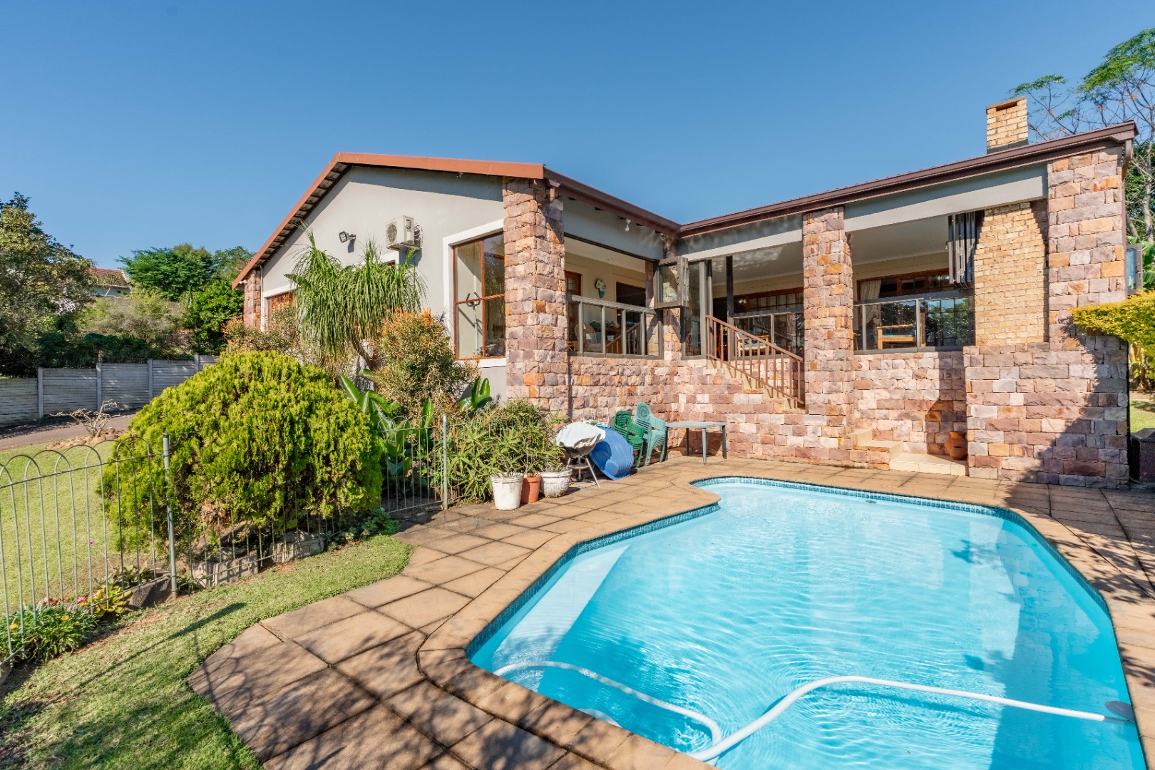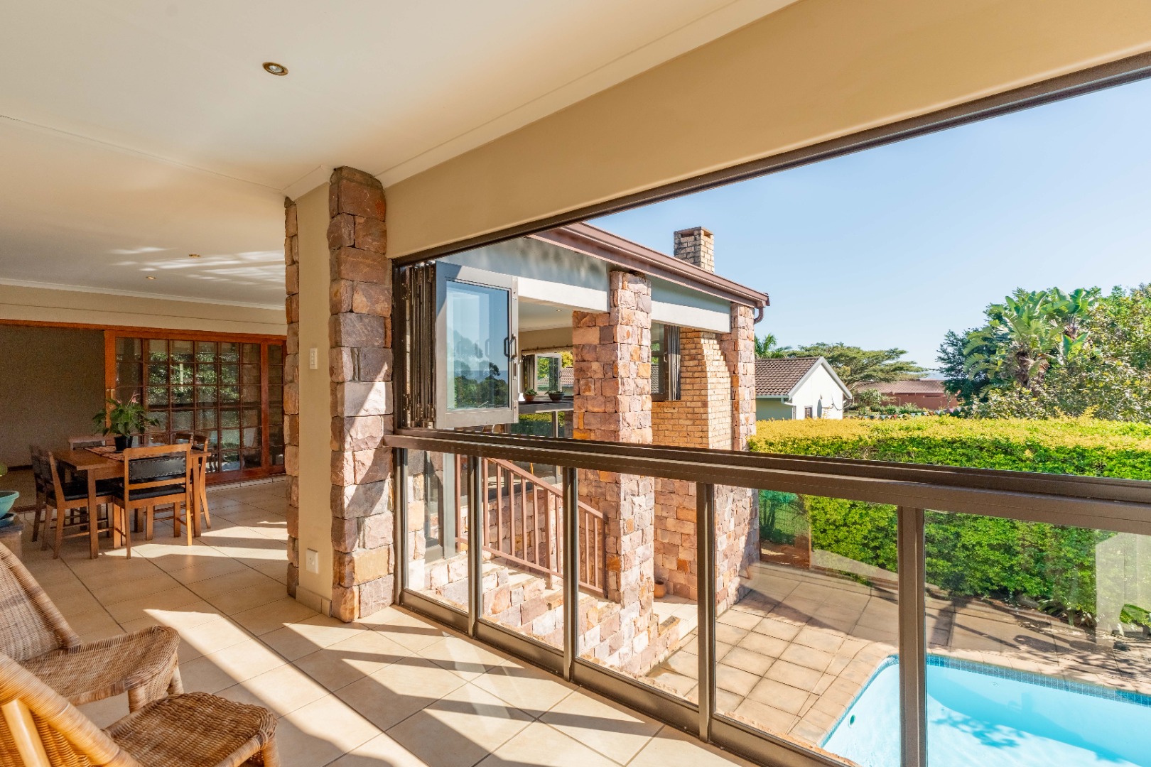 This immaculately maintained residence offers outstanding versatility, making it an excellent choice for large families, multi-generational living, or as a rental income opportunity. Thoughtfully designed as two separate homes, it is seamlessly connected by a stunning shared verandah. With stack-back windows framing views of a sparkling swimming pool and a built-in braai, this inviting space is perfect for entertaining and relaxed family gatherings.