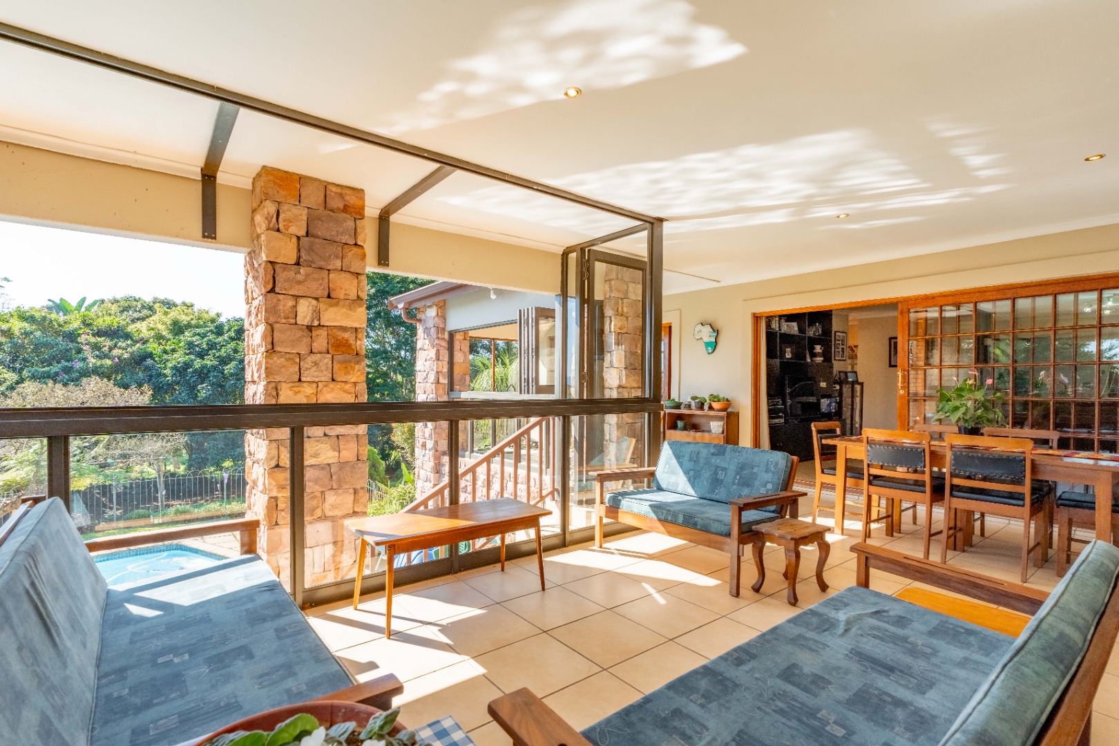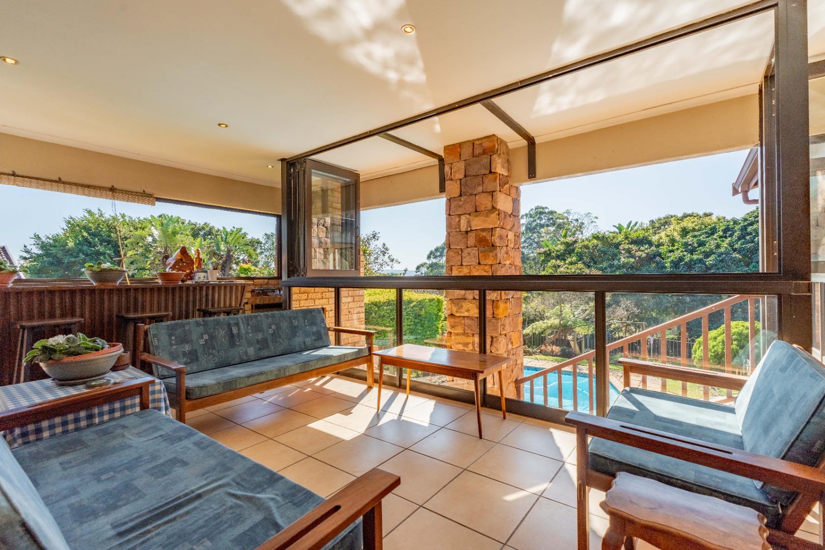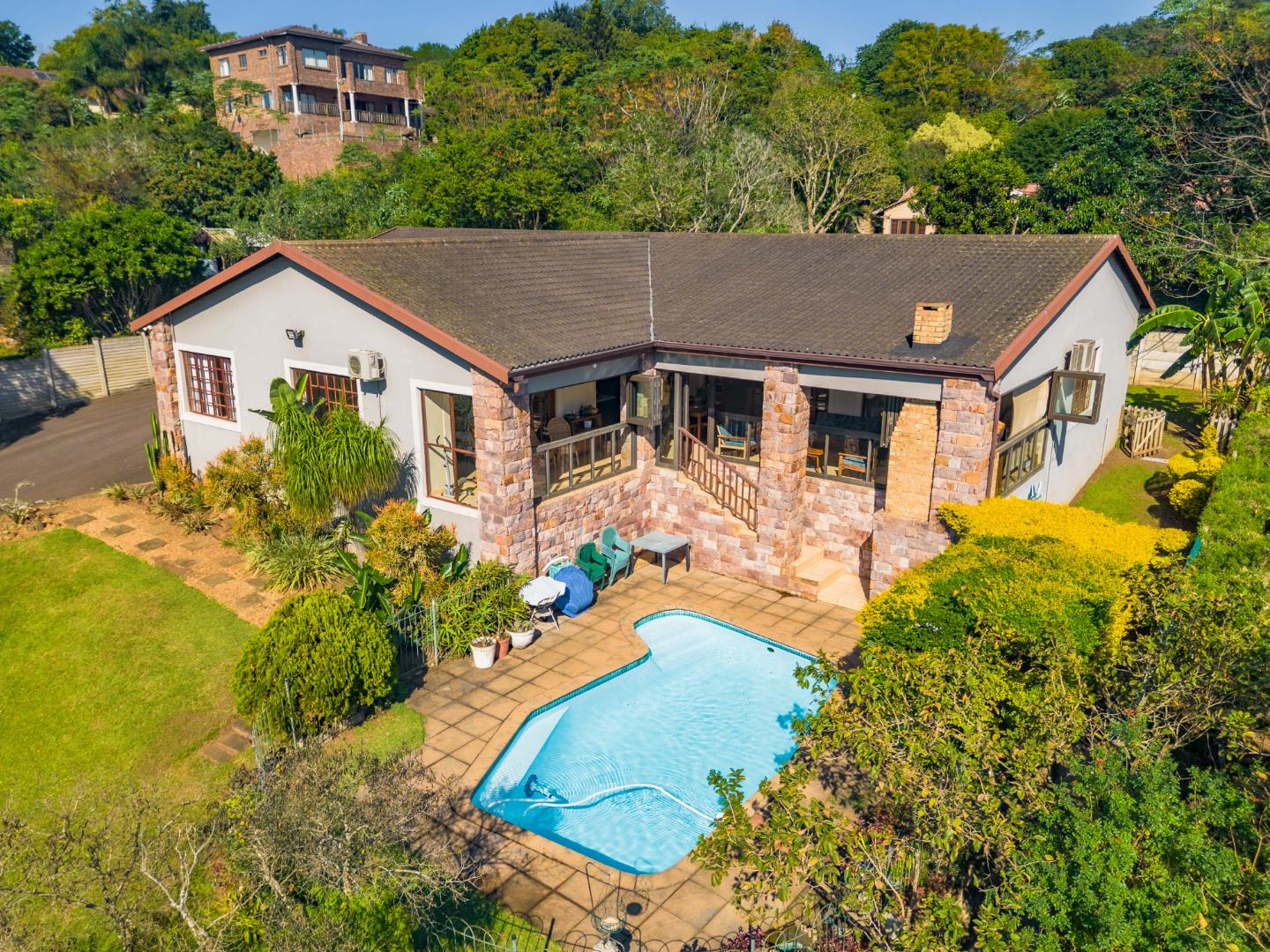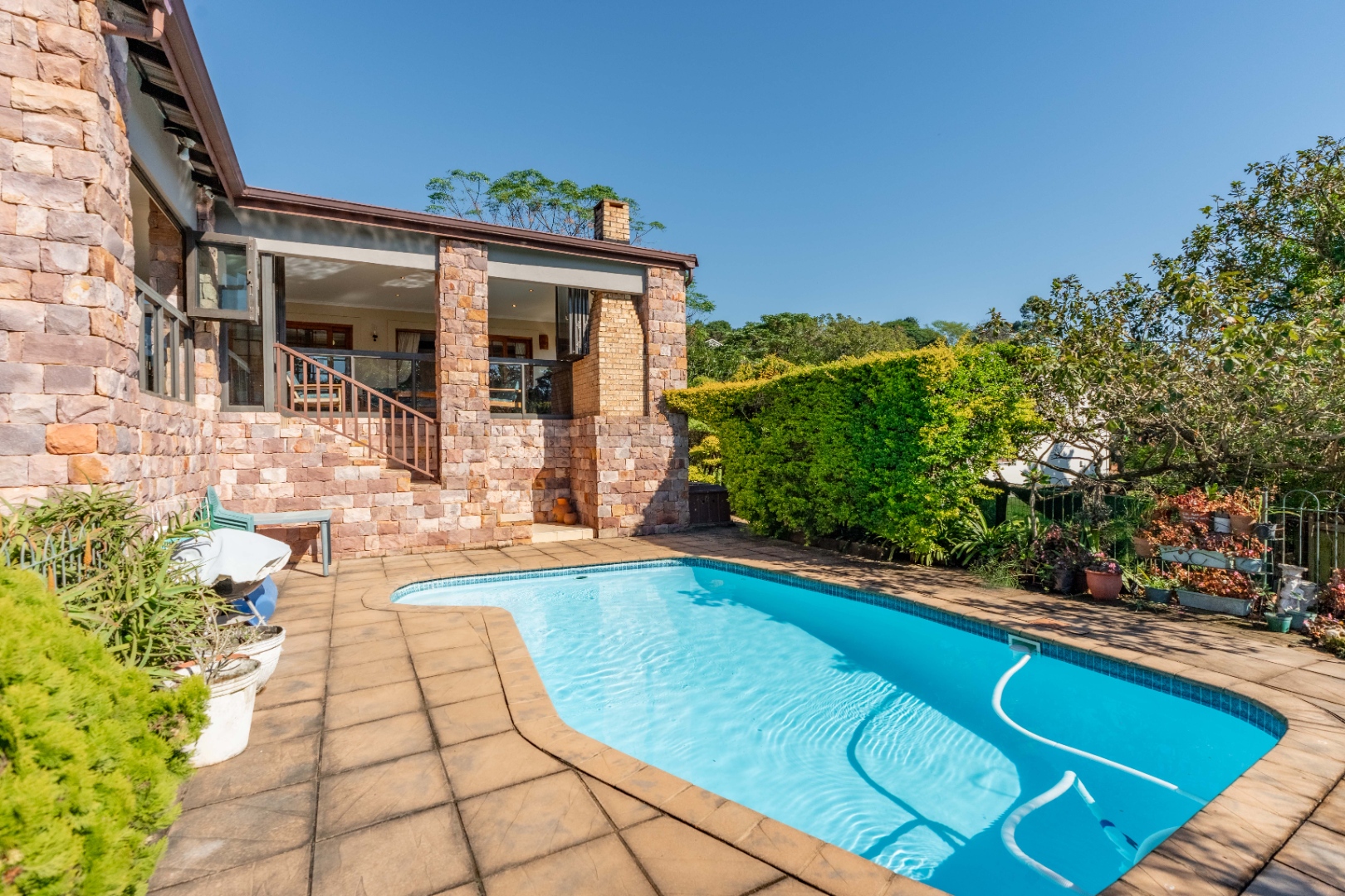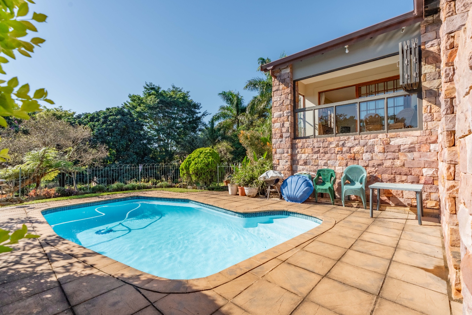 This immaculately maintained residence offers outstanding versatility, making it an excellent choice for large families, multi-generational living, or as a rental income opportunity. Thoughtfully designed as two separate homes, it is seamlessly connected by a stunning shared verandah. With stack-back windows framing views of a sparkling swimming pool and a built-in braai, this inviting space is perfect for entertaining and relaxed family gatherings.