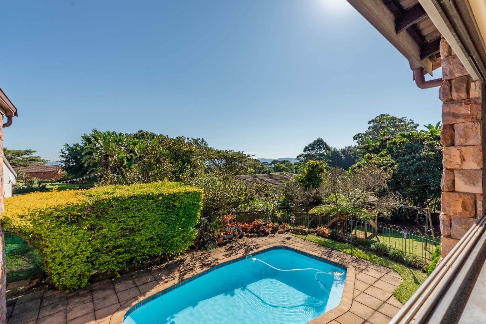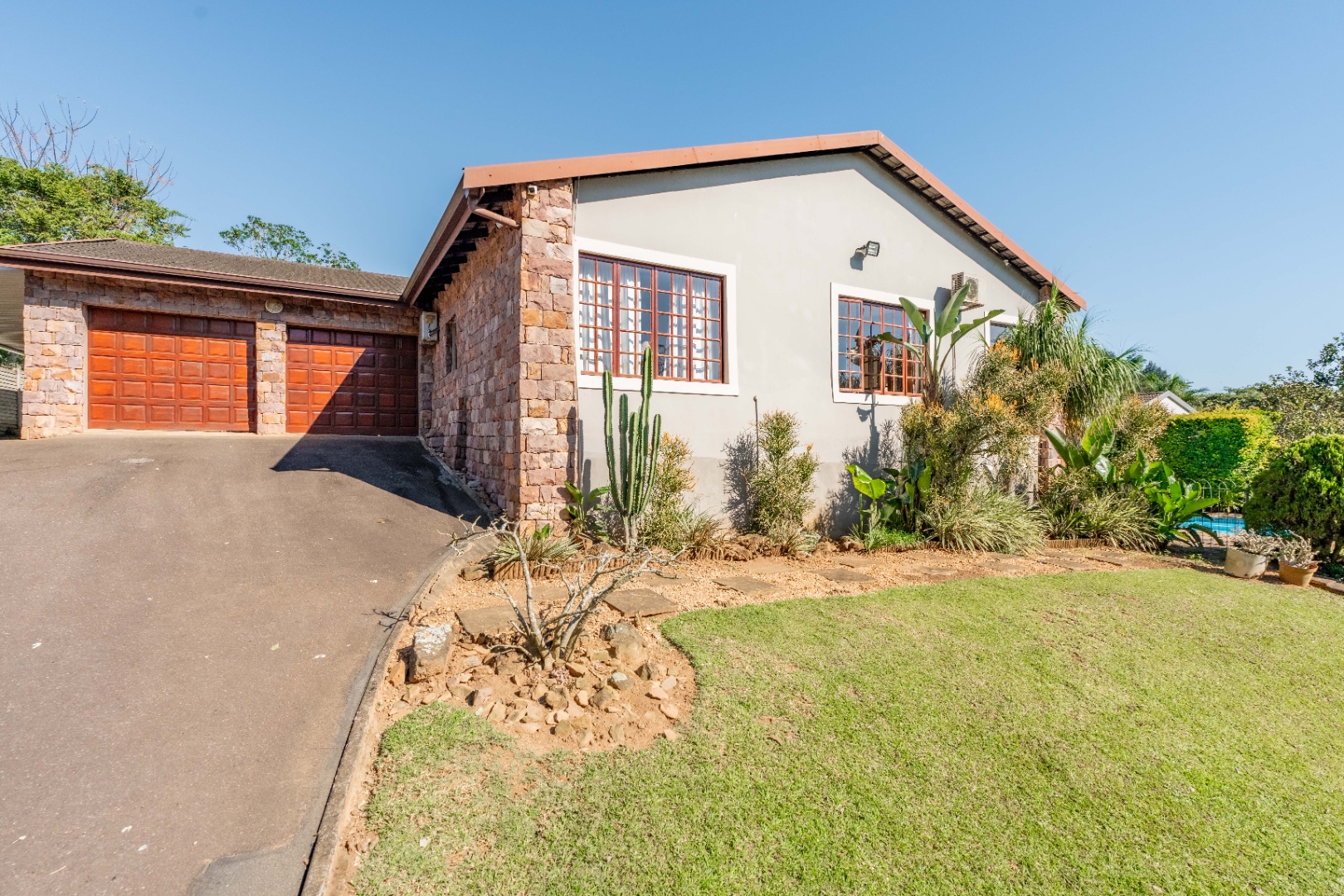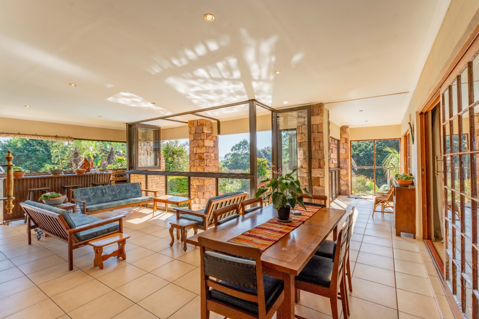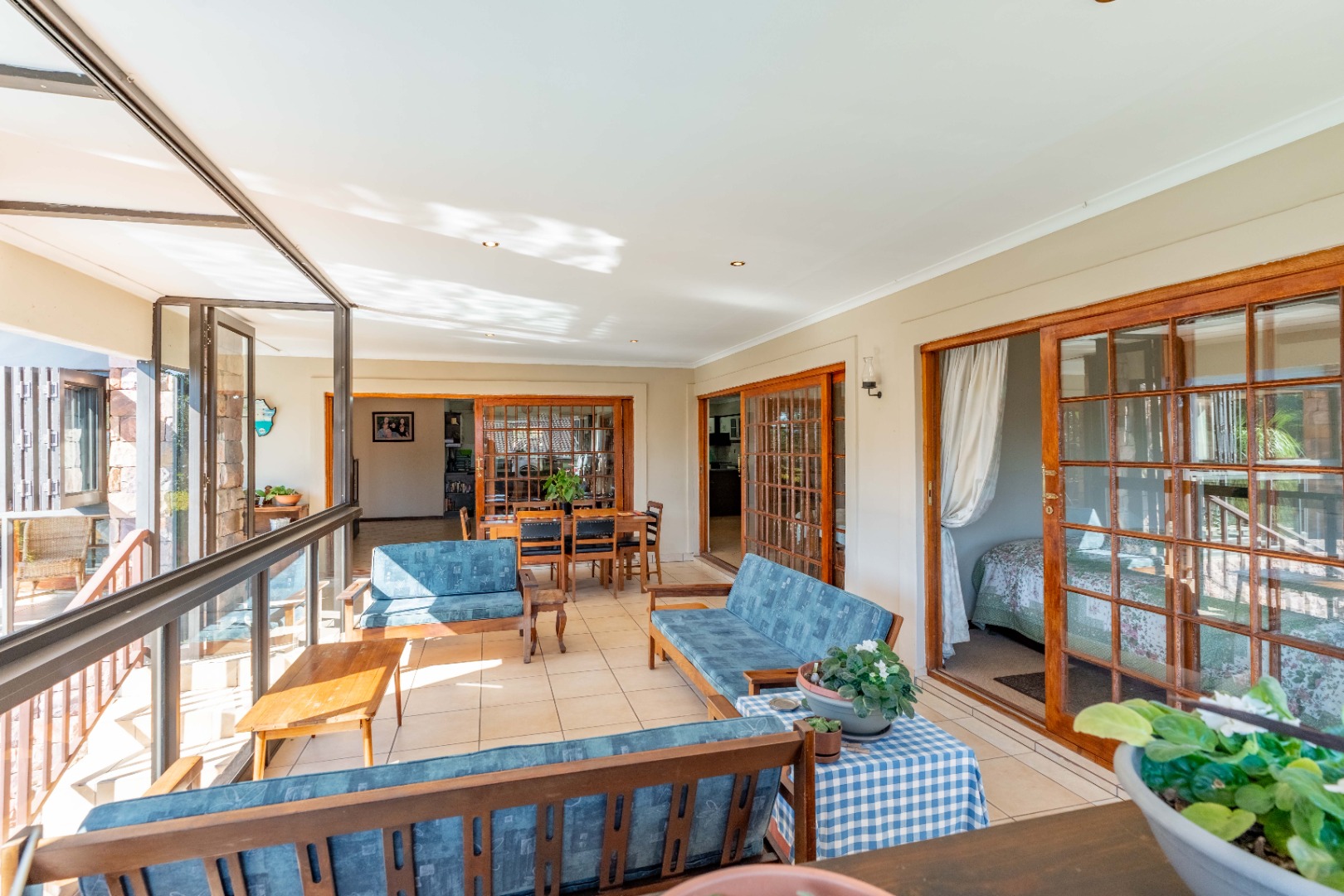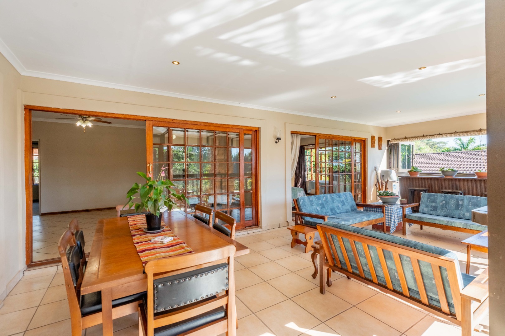 This immaculately maintained residence offers outstanding versatility, making it an excellent choice for large families, multi-generational living, or as a rental income opportunity. Thoughtfully designed as two separate homes, it is seamlessly connected by a stunning shared verandah. With stack-back windows framing views of a sparkling swimming pool and a built-in braai, this inviting space is perfect for entertaining and relaxed family gatherings.
