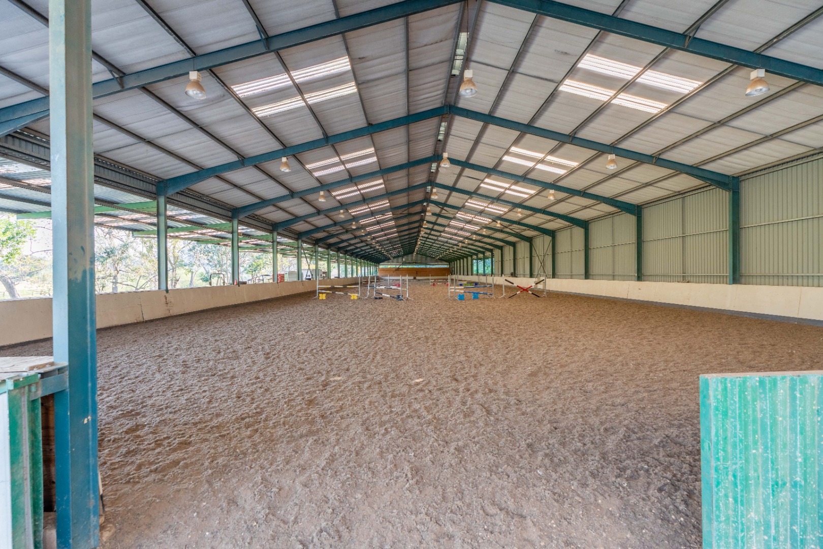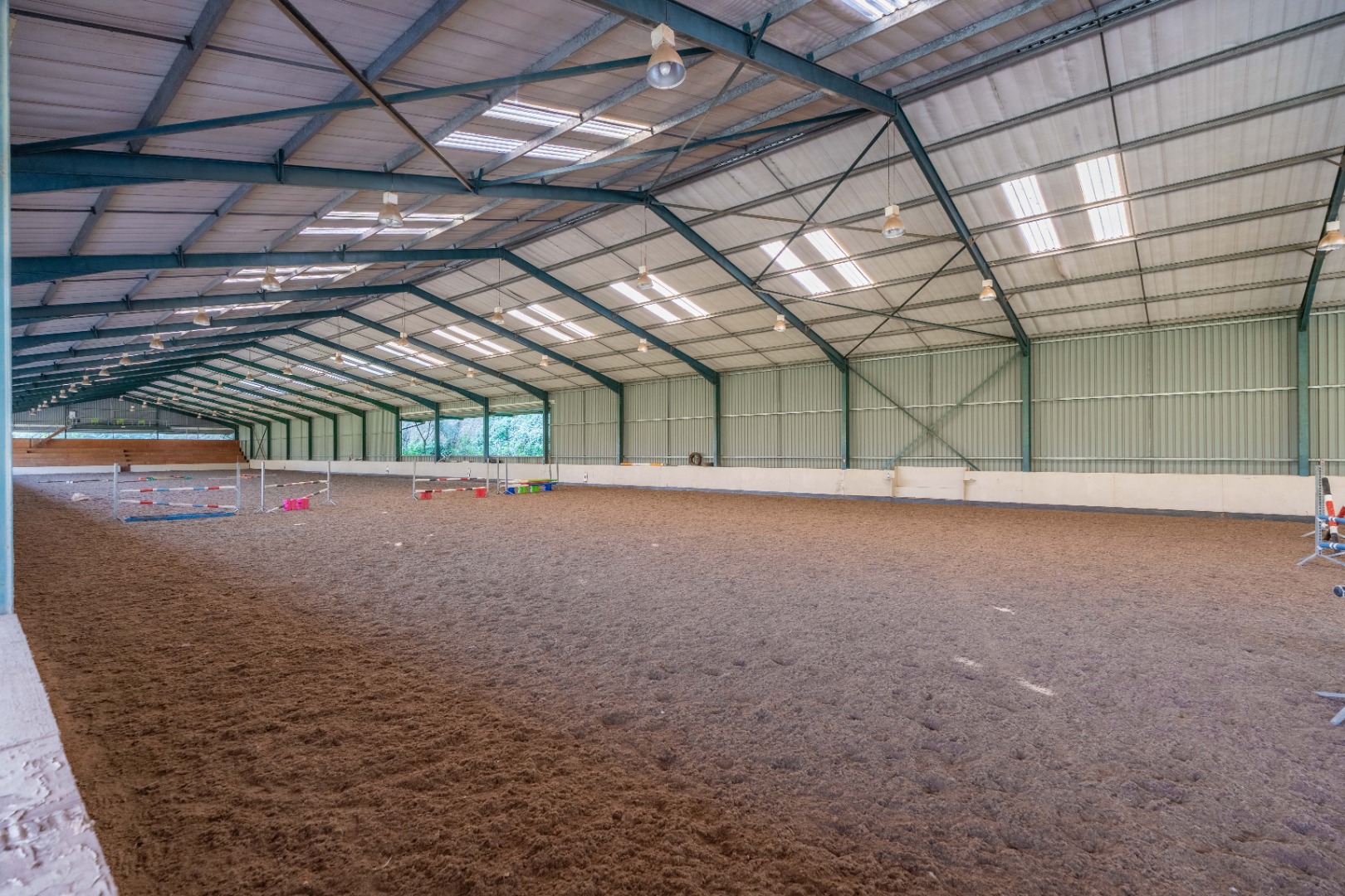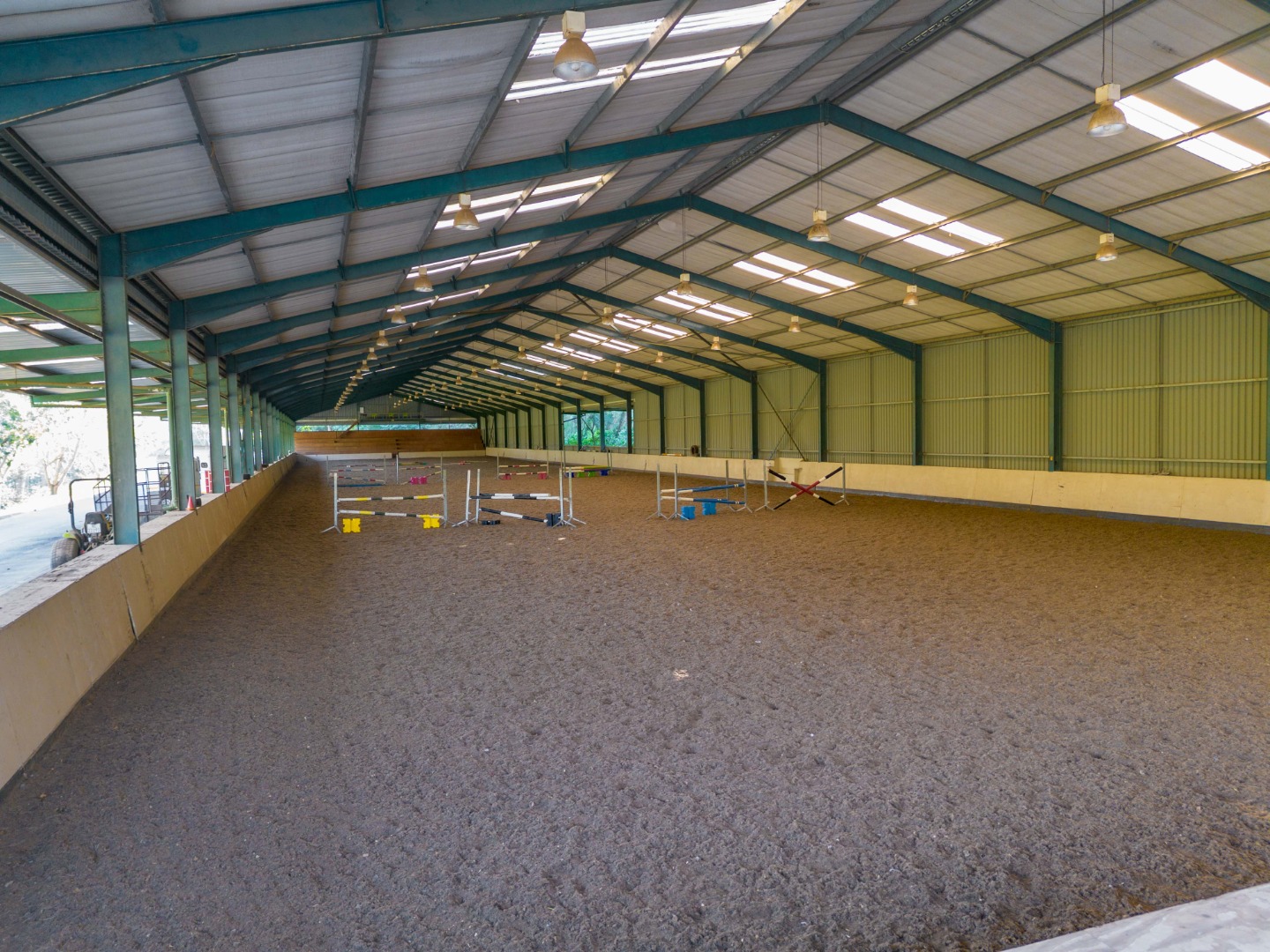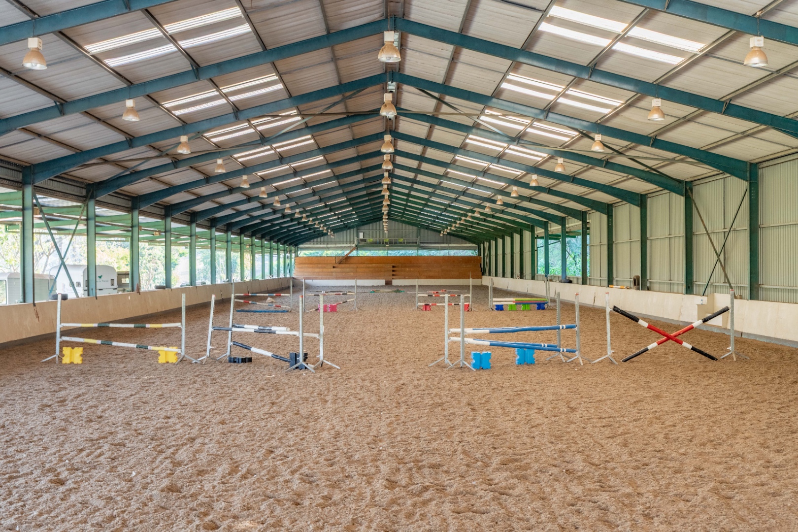 + Indoor fibre arena - 120 m x 24 m double volume steel structure for showjumping competitions or training shows complete with floodlights, sound system and spectator seating.
