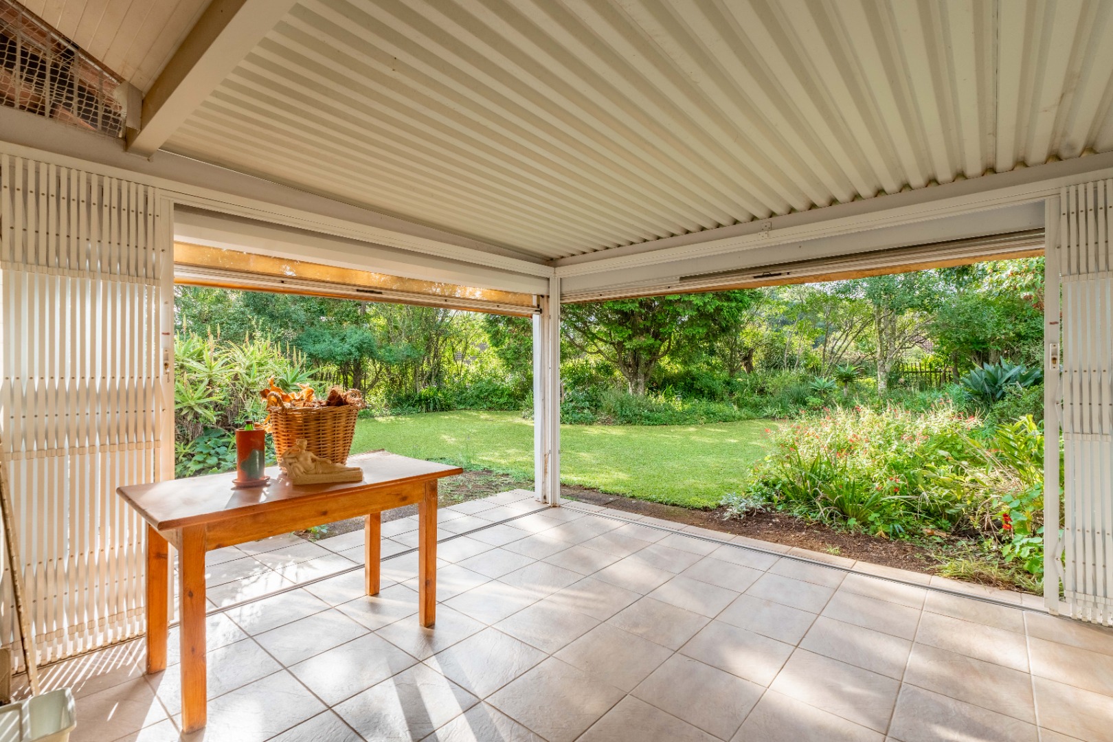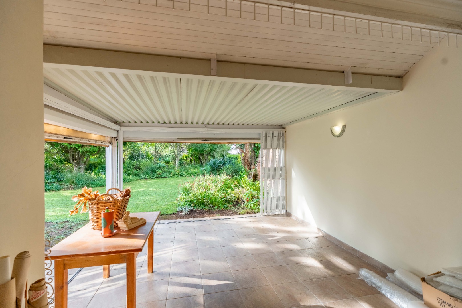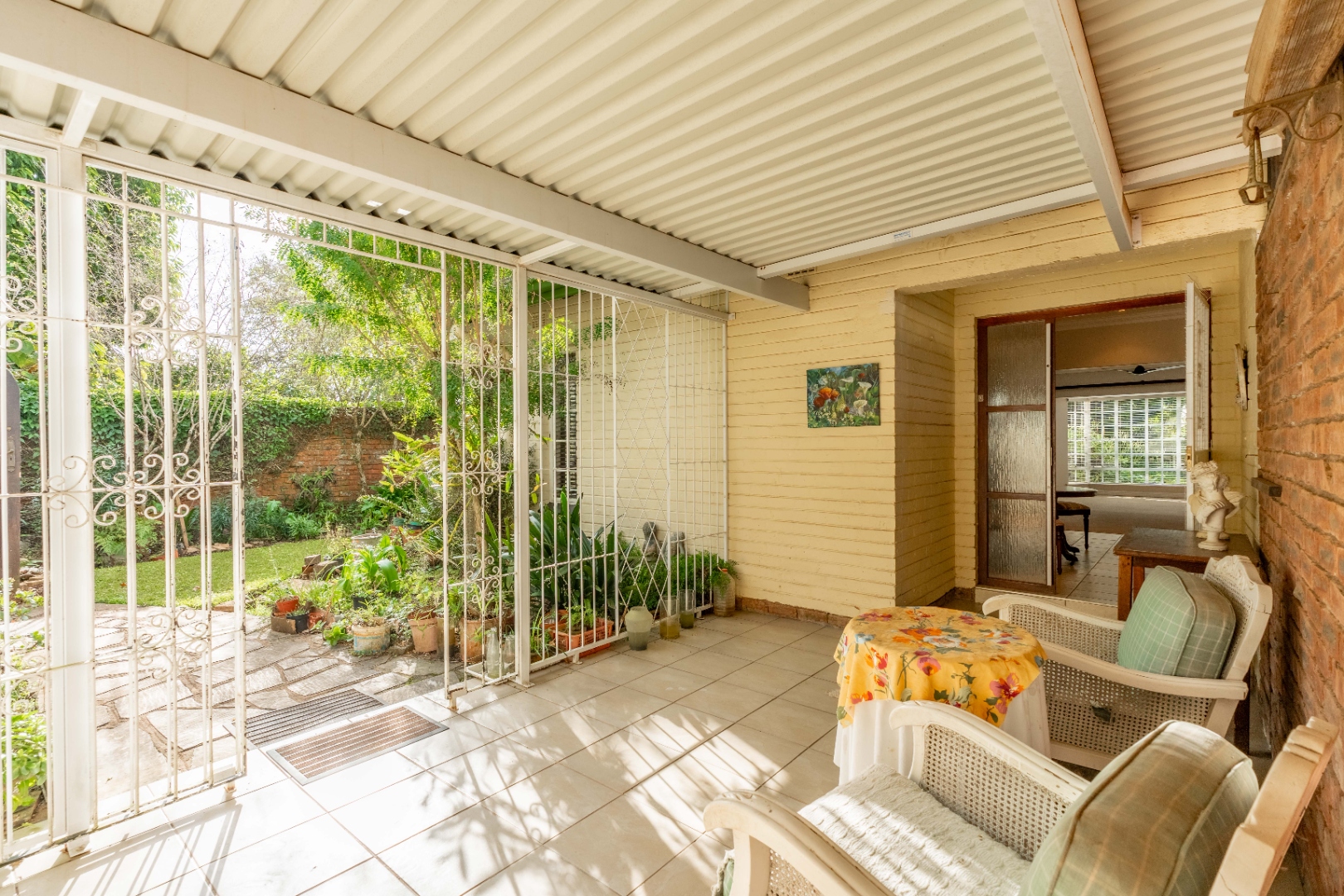 A double garage (one side automated) with direct access into a covered, gated patio and into the entrance hall. This sunny, tiled patio overlooks a completely private walled garden and is a delightful haven for morning tea or evening sundowners.