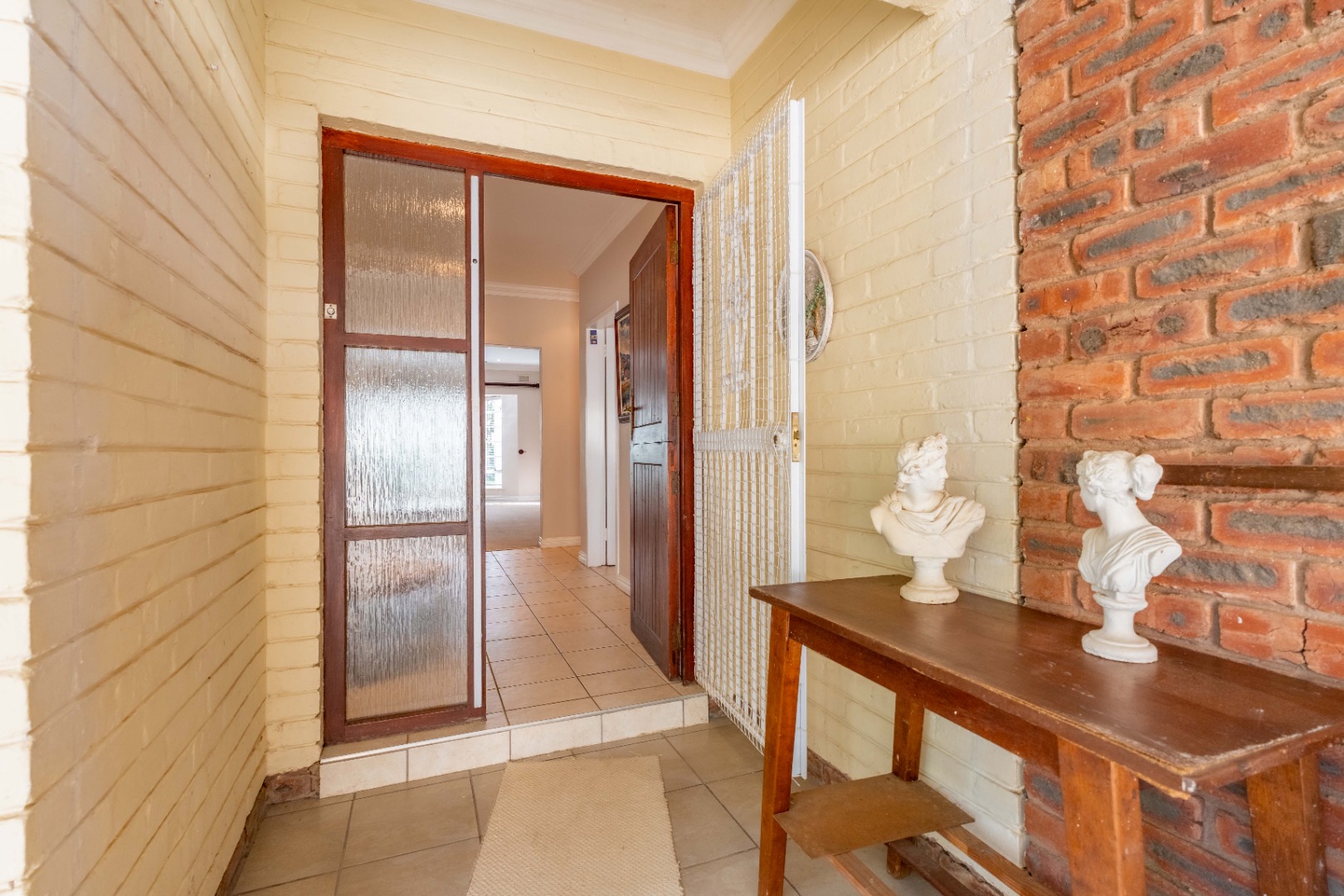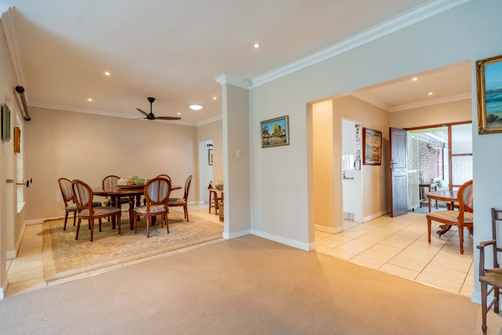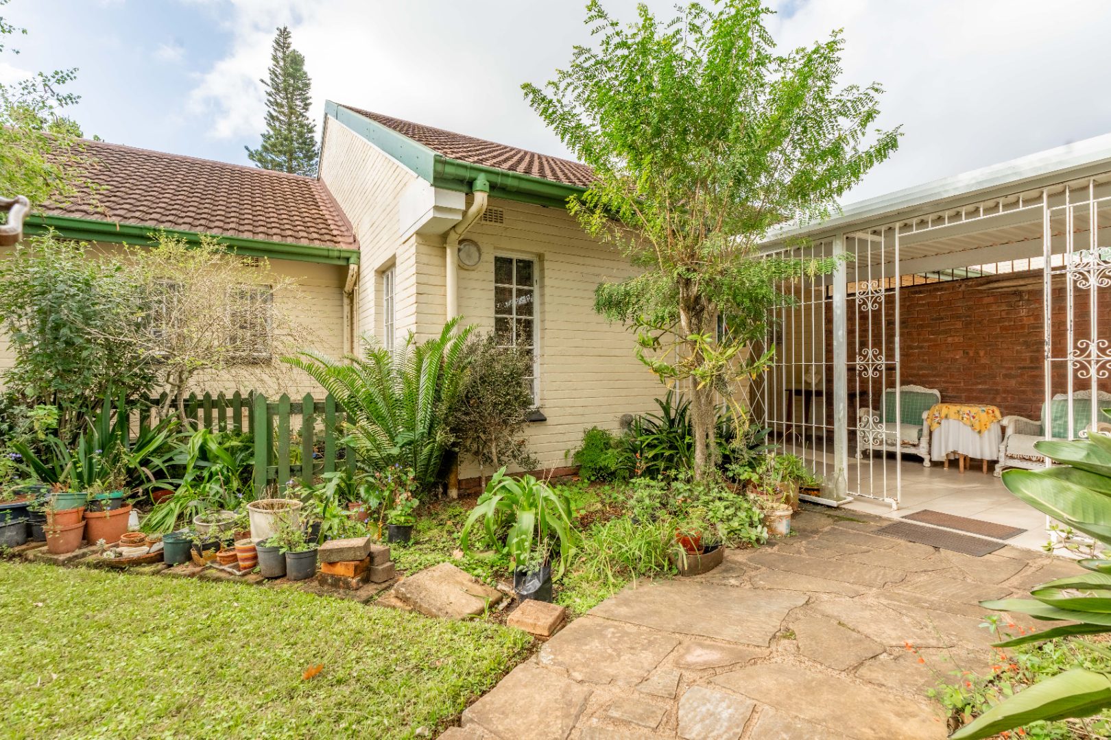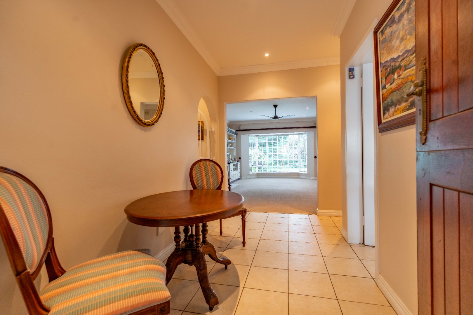 A double garage (one side automated) with direct access into a covered, gated patio and into the entrance hall. This sunny, tiled patio overlooks a completely private walled garden and is a delightful haven for morning tea or evening sundowners.