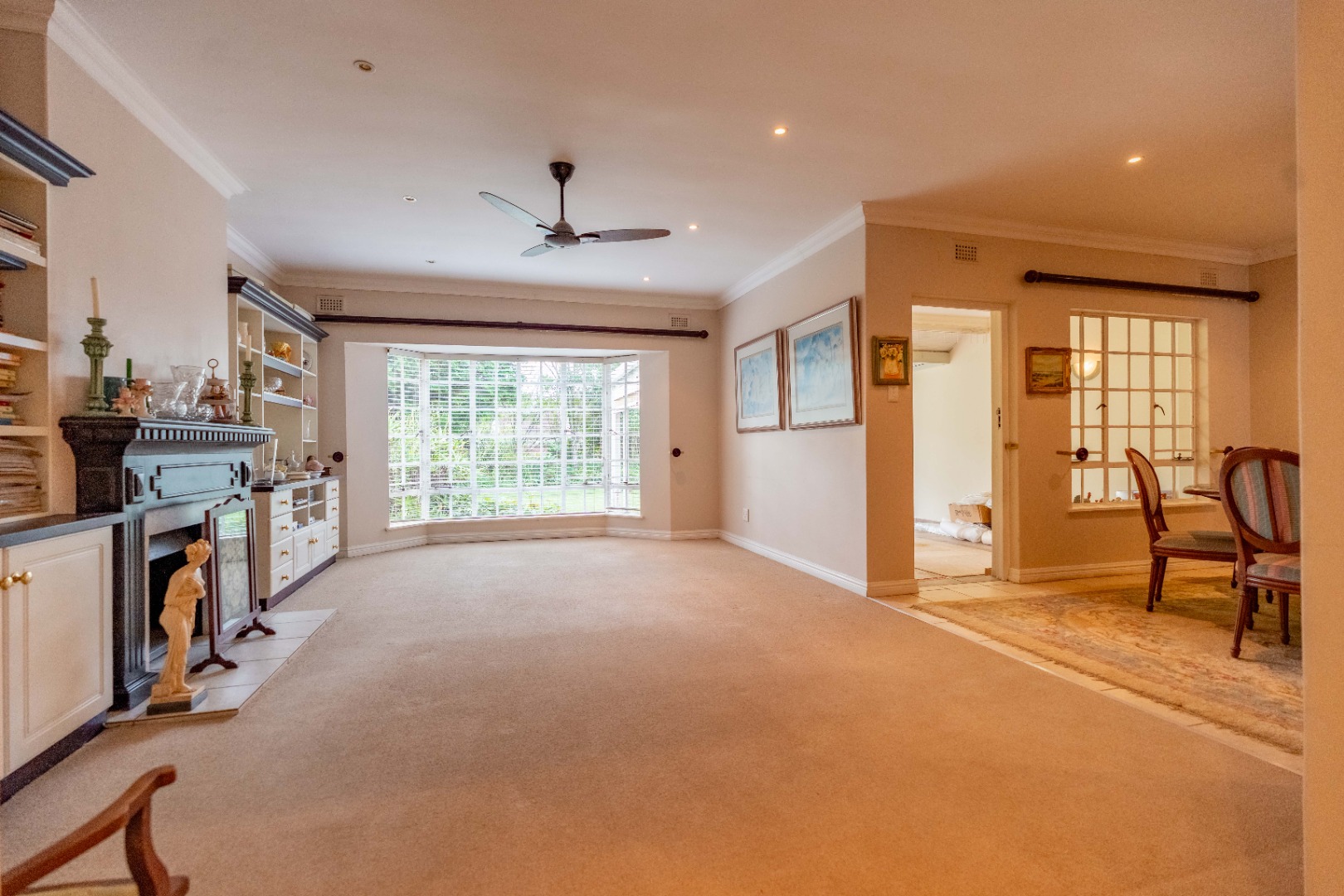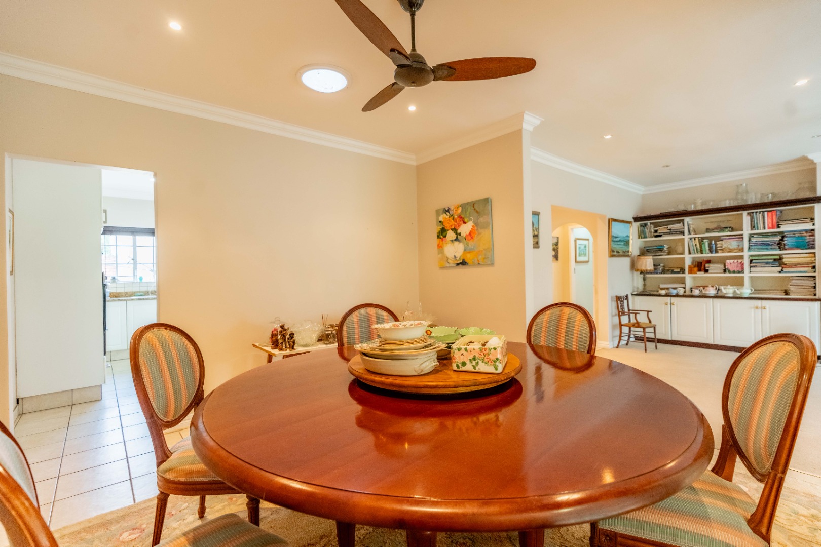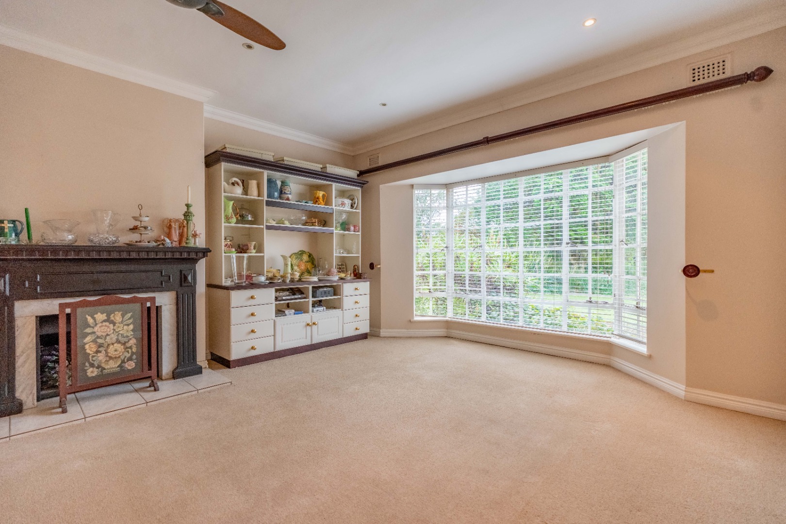 The entrance hall leads into an elegant lounge with built-in bookshelves, a bay window and jetmaster wood burning fireplace. The dining room features a skylight and opens onto a large covered patio for entertaining. The patio can be closed with trellidoors and roll down blinds or opened directly out into the level, manicured front garden.