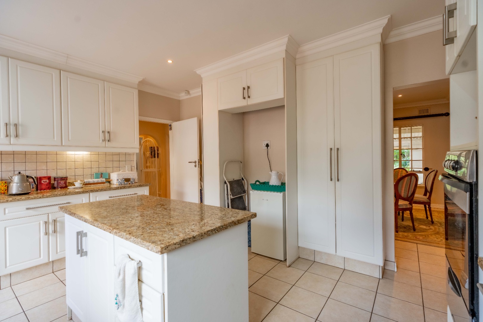 cupboard space. A ceran top stove, extractor fan and single, eye-level oven with warmer drawer make cooking a breeze. Space for a double fridge and two undercounter plumbed appliances.