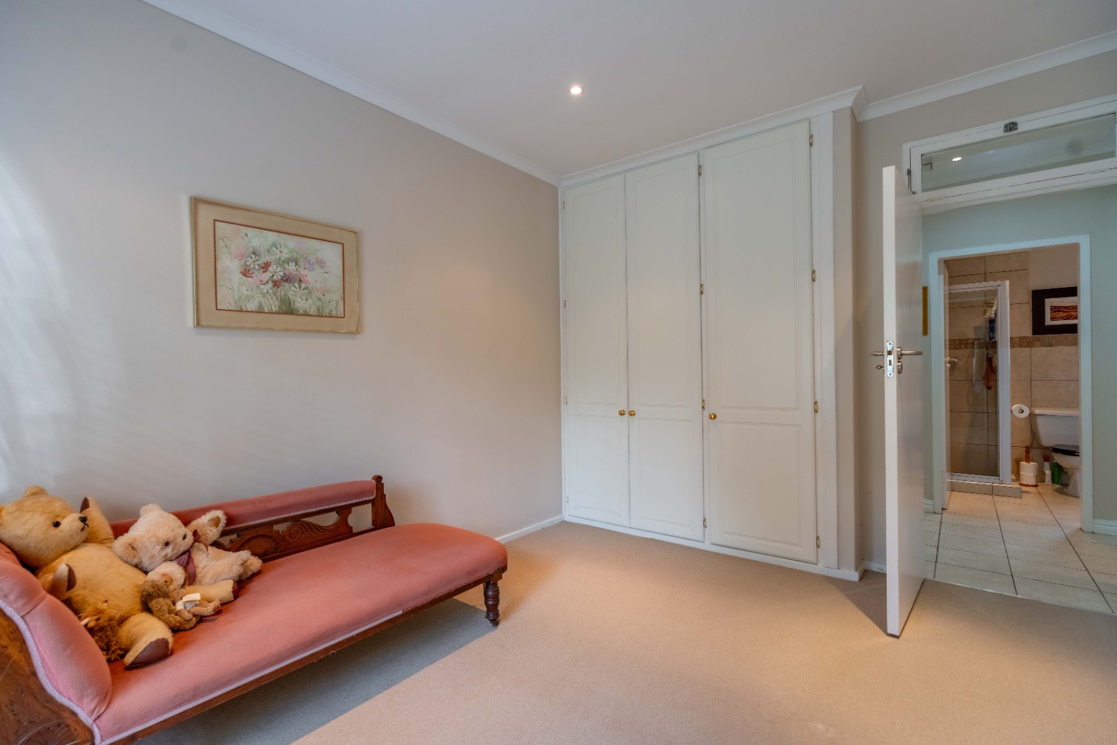 The main bedroom is super spacious with a wall of built-in cupboards and features an en-suite bathroom with bath, basin and toilet.