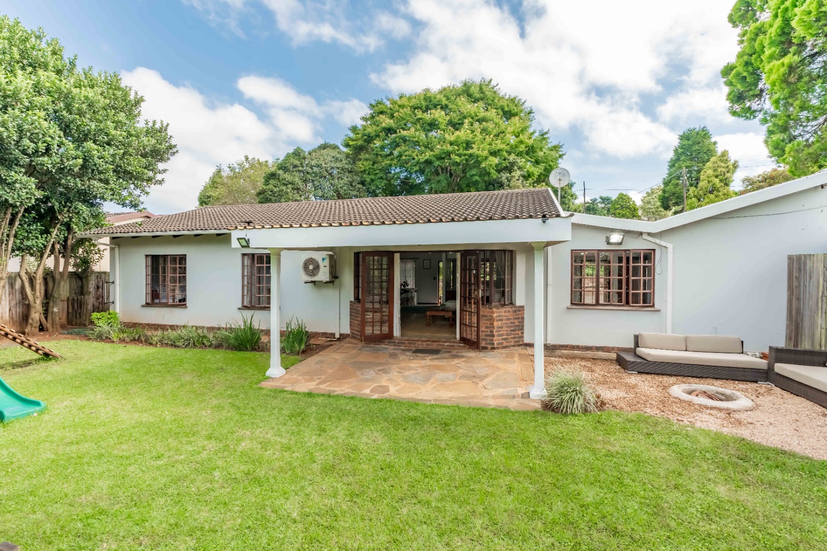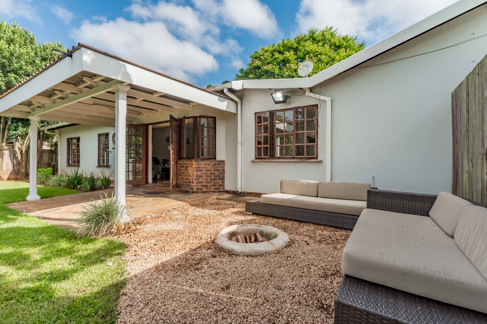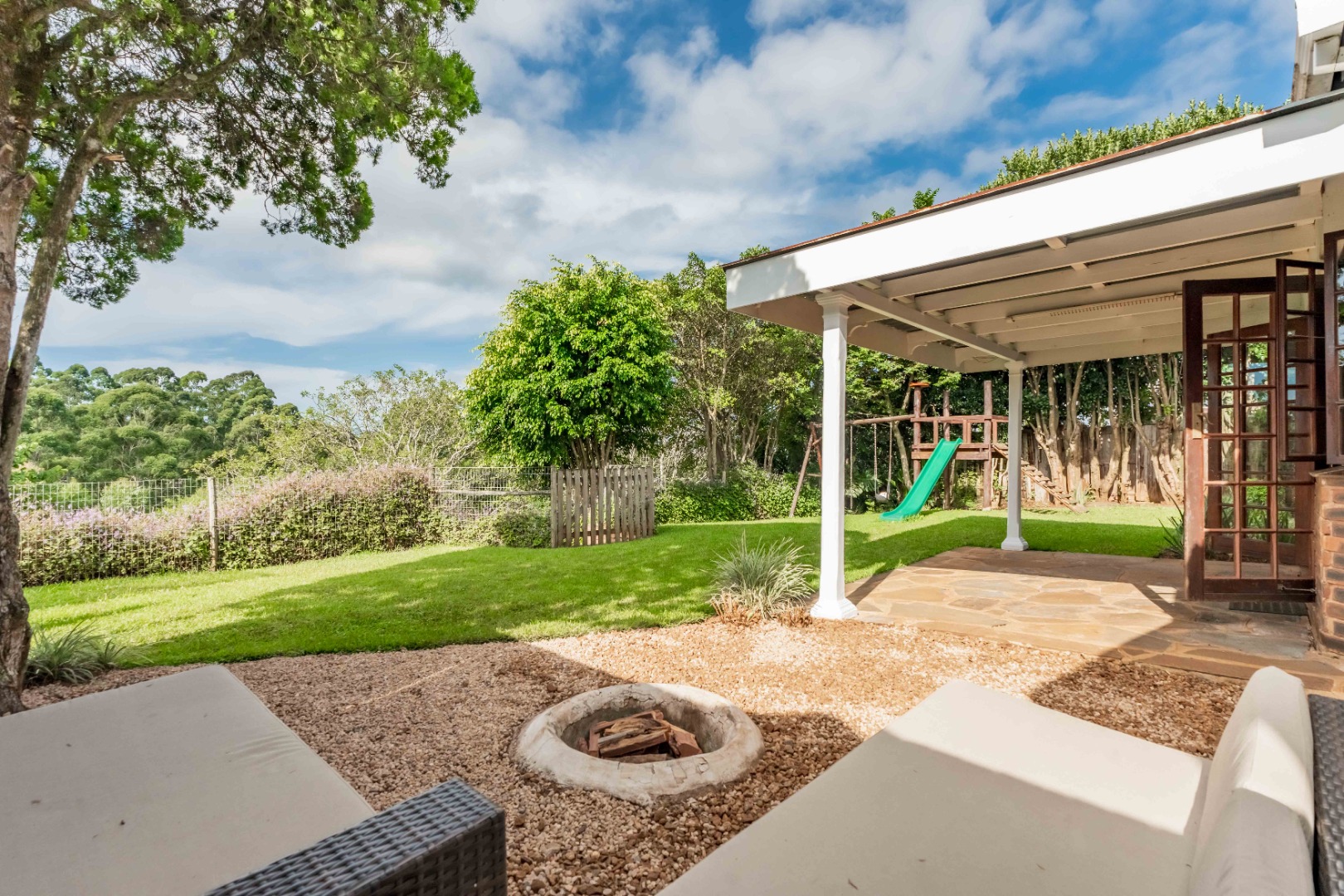 Step inside to light-filled, open-plan living area that creates a warm and inviting atmosphere, seamlessly flowing out onto a covered patio. This outdoor space, complete with a firepit area, is perfect for relaxed entertaining or enjoying quiet evenings while taking in views of the large, beautifully tiered garden—ideal for children, pets, or keen gardeners.