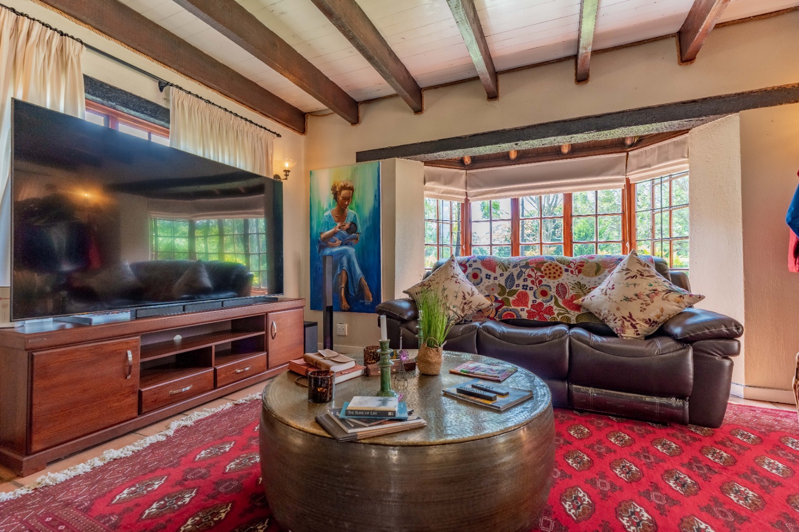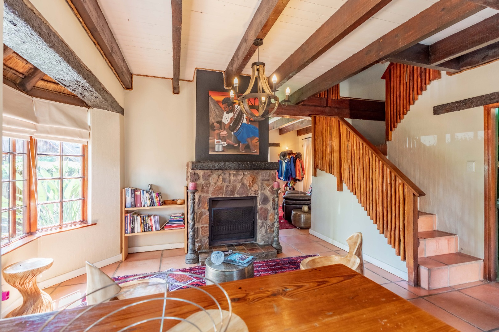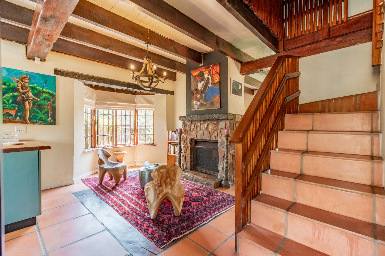 A centrally located fireplace warms both the lounge and dining room, creating a cozy atmosphere throughout the ground level on chilly winter nights. The spacious lounge opens onto a beautifully maintained garden with a small lapa, swimming pool, and fire pit - perfect for entertaining or for children to enjoy outdoor play.