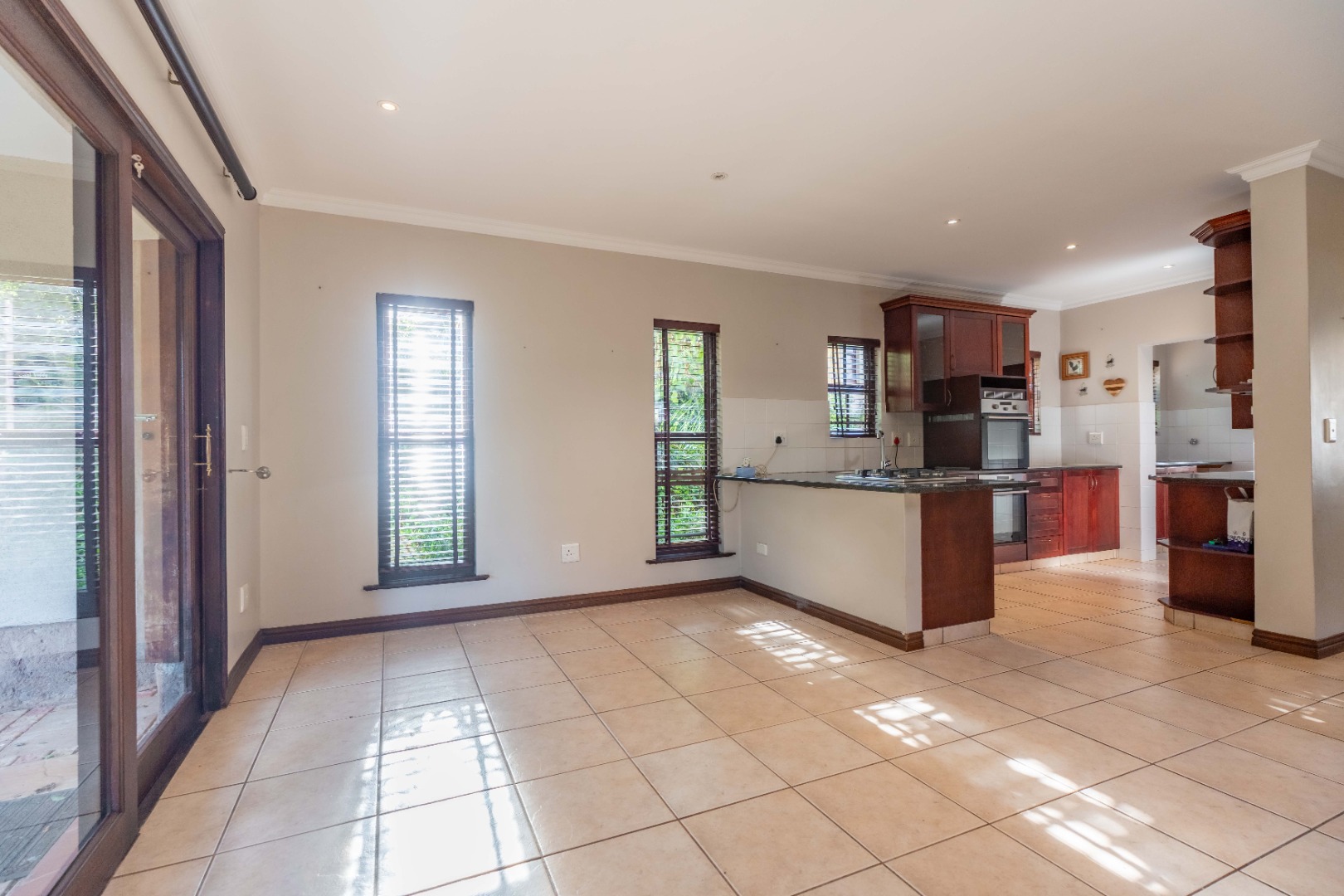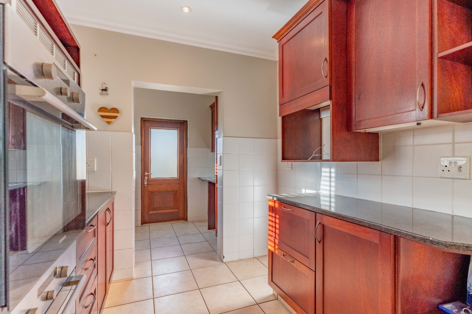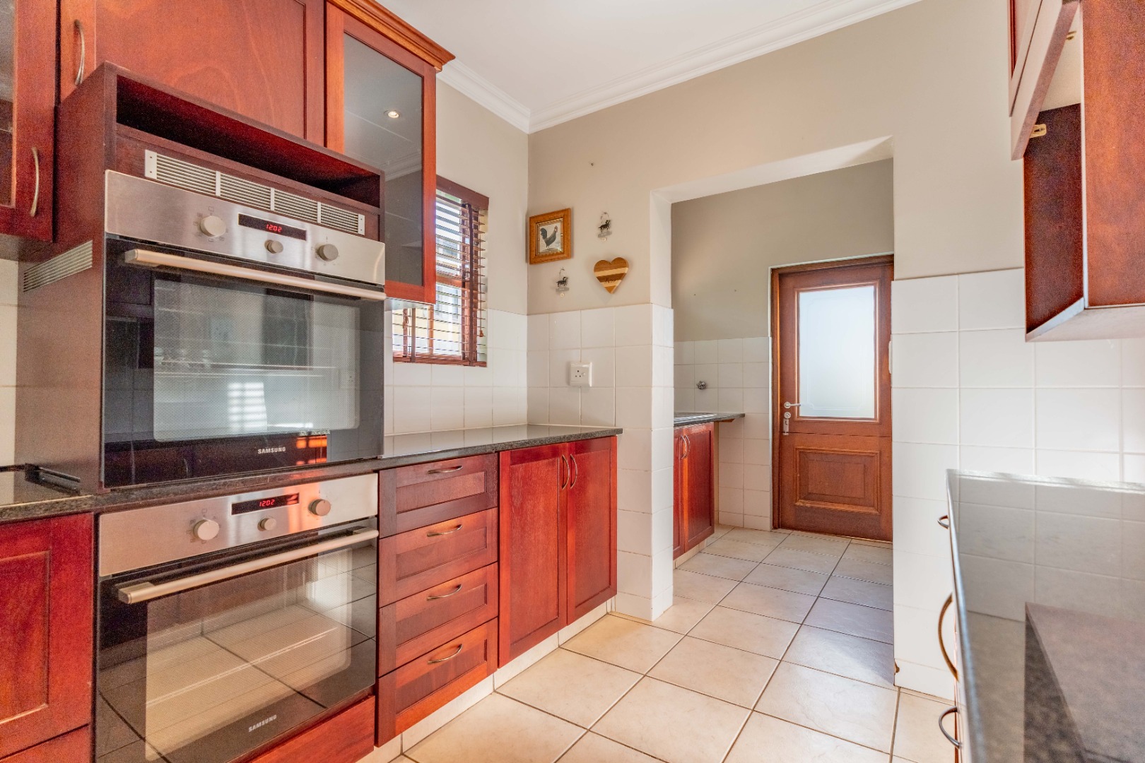 The gourmet kitchen will impress with its gas hob, double eye-level oven, sleek countertops, and a separate scullery for added convenience.