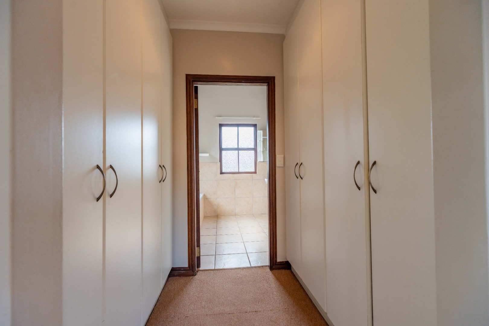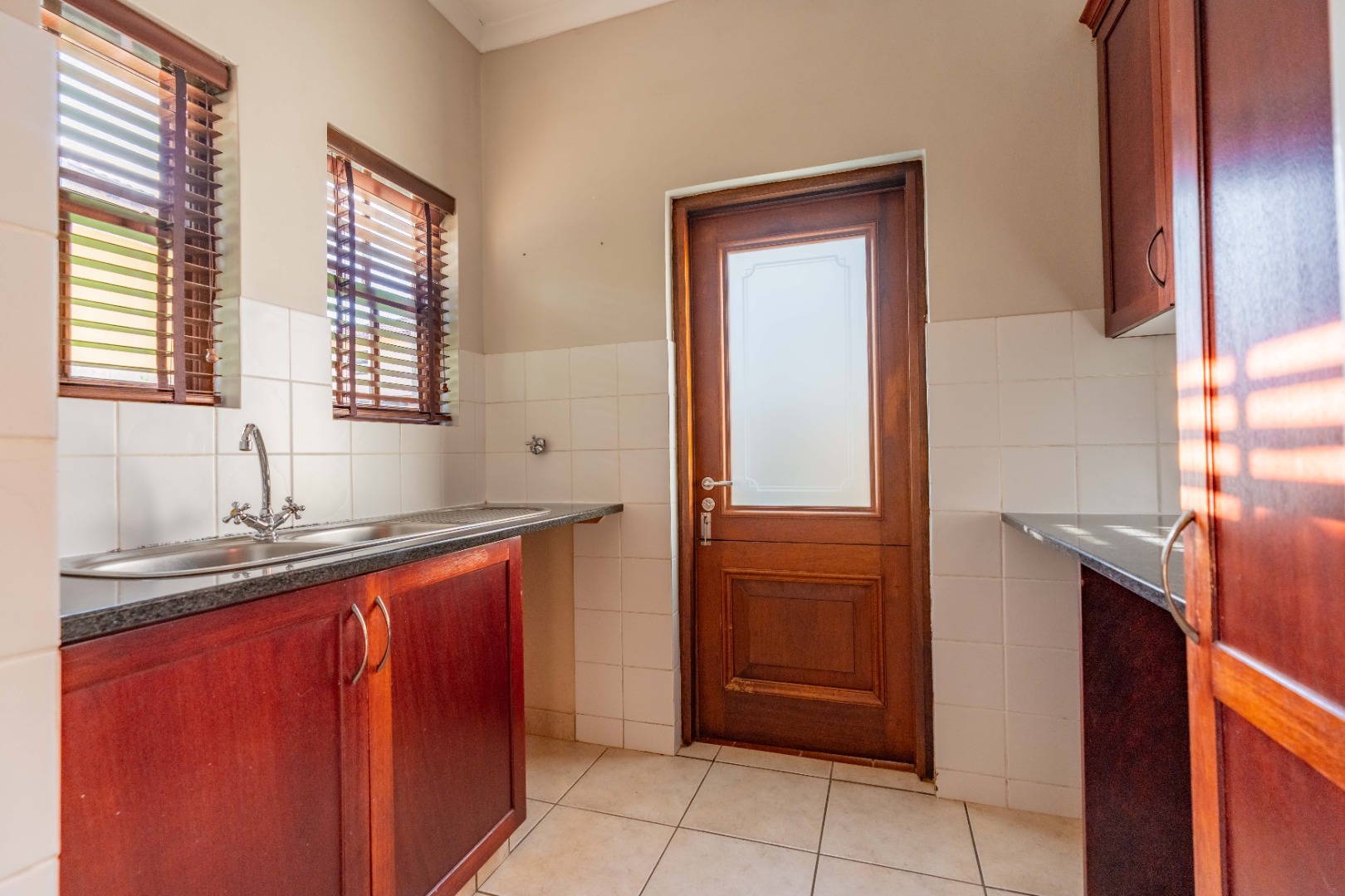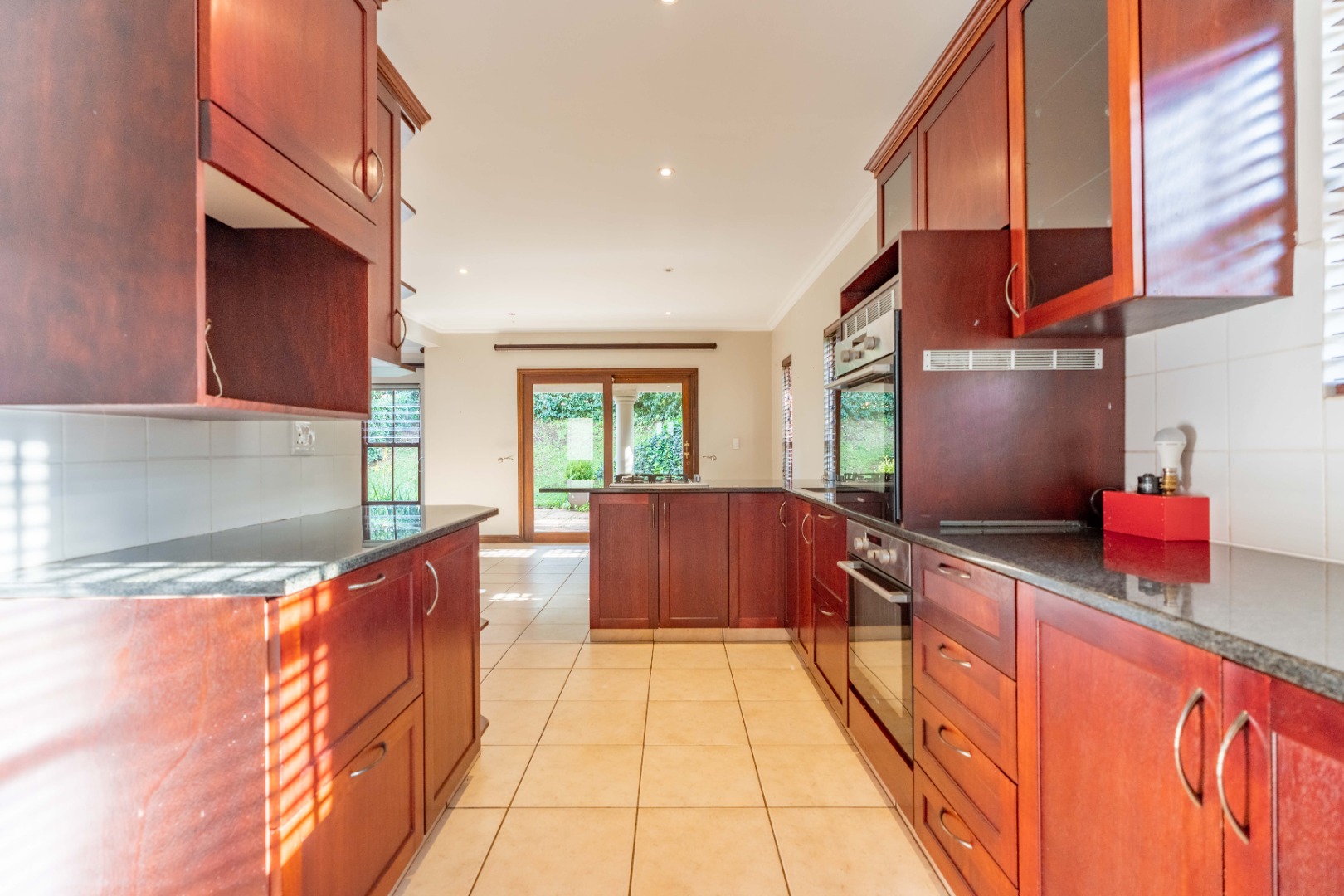 The gourmet kitchen will impress with its gas hob, double eye-level oven, sleek countertops, and a separate scullery for added convenience.