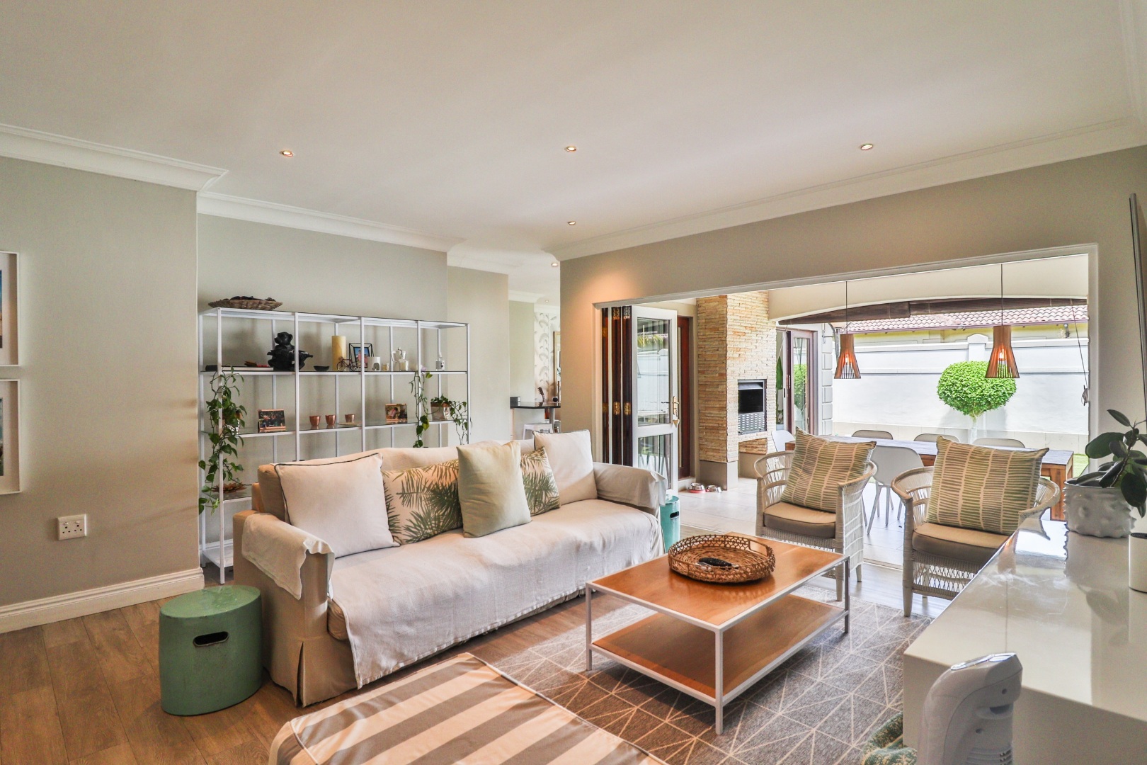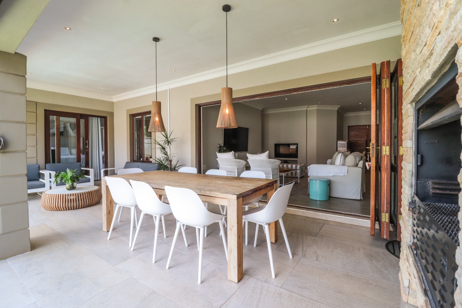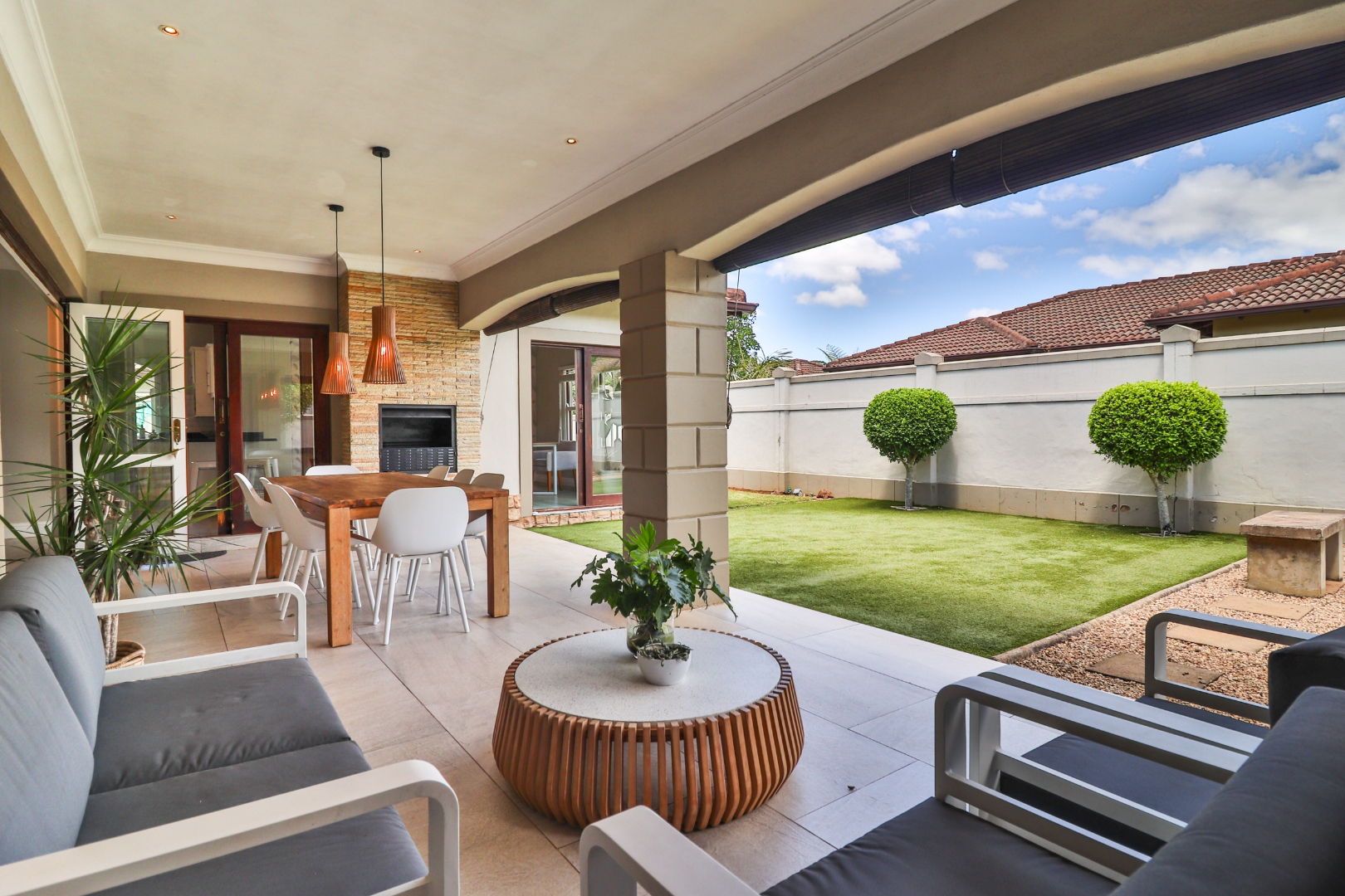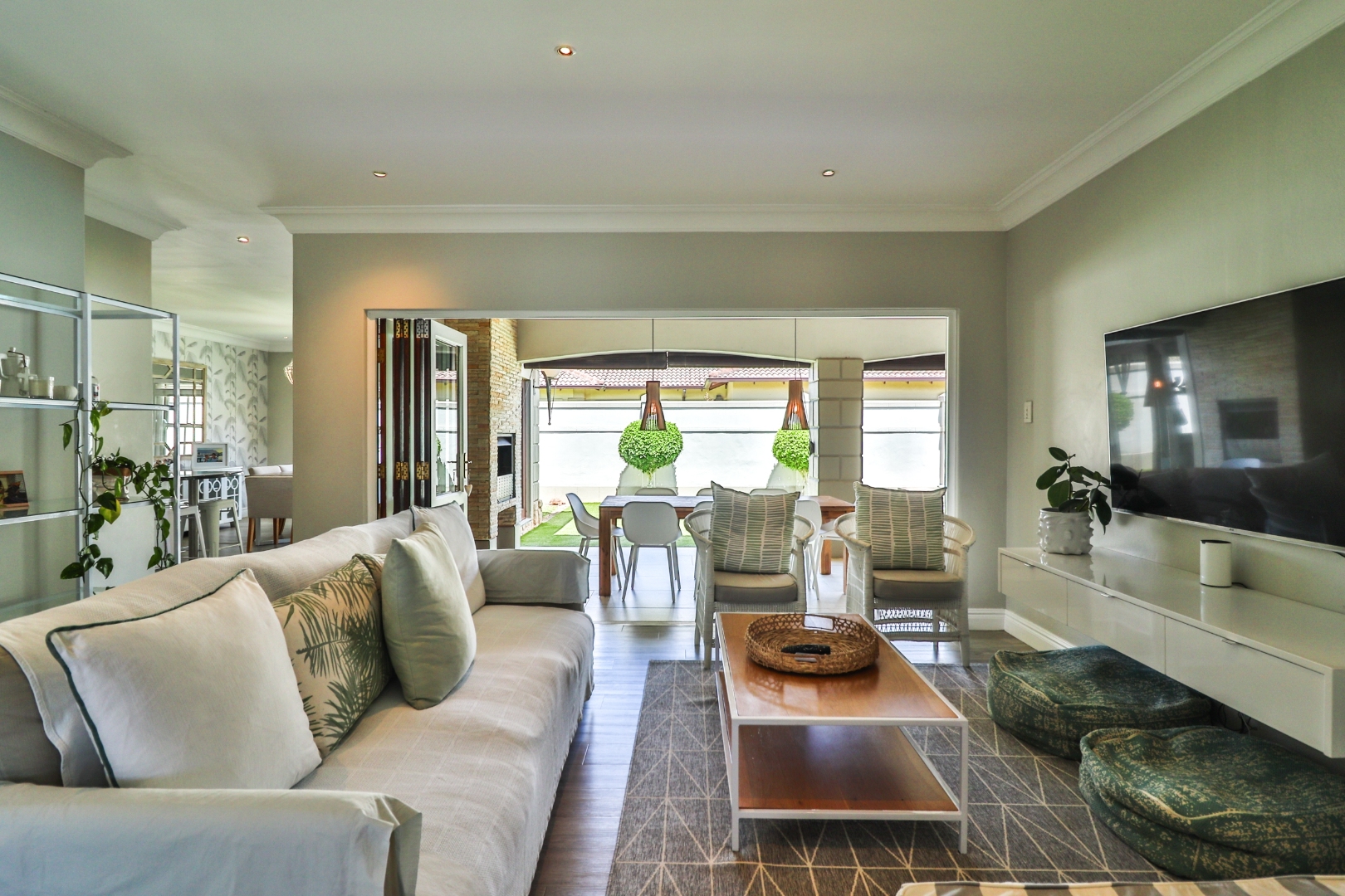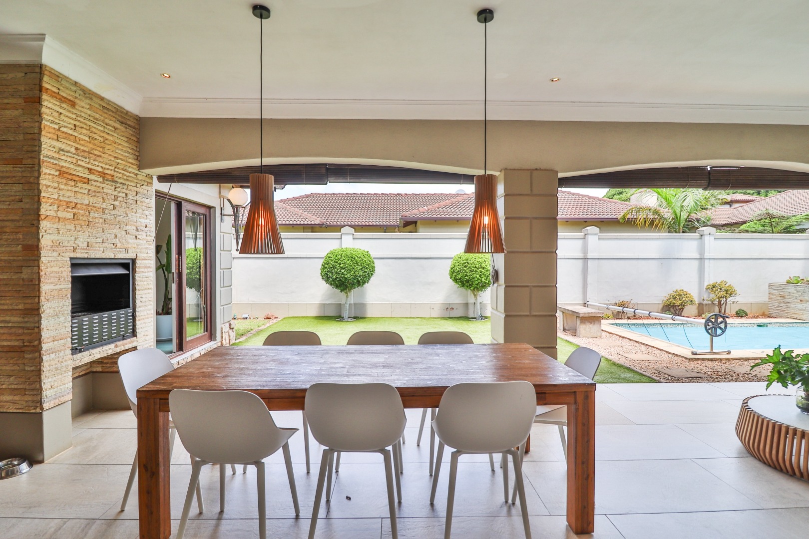 The open-plan living spaces extend to a covered patio with built-in braai overlooking the sparkling pool — perfect for year-round entertaining. A cosy lounge with a feature fireplace makes for warm family evenings, while the master suite enjoys direct access to the patio for quiet relaxation.