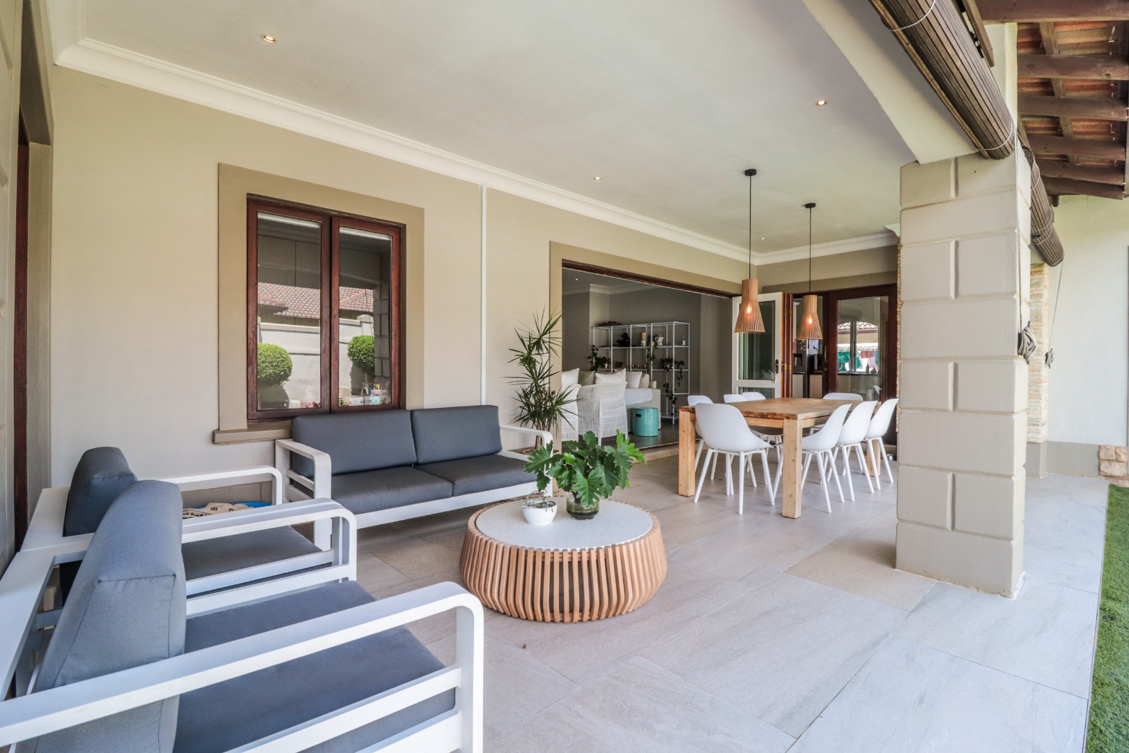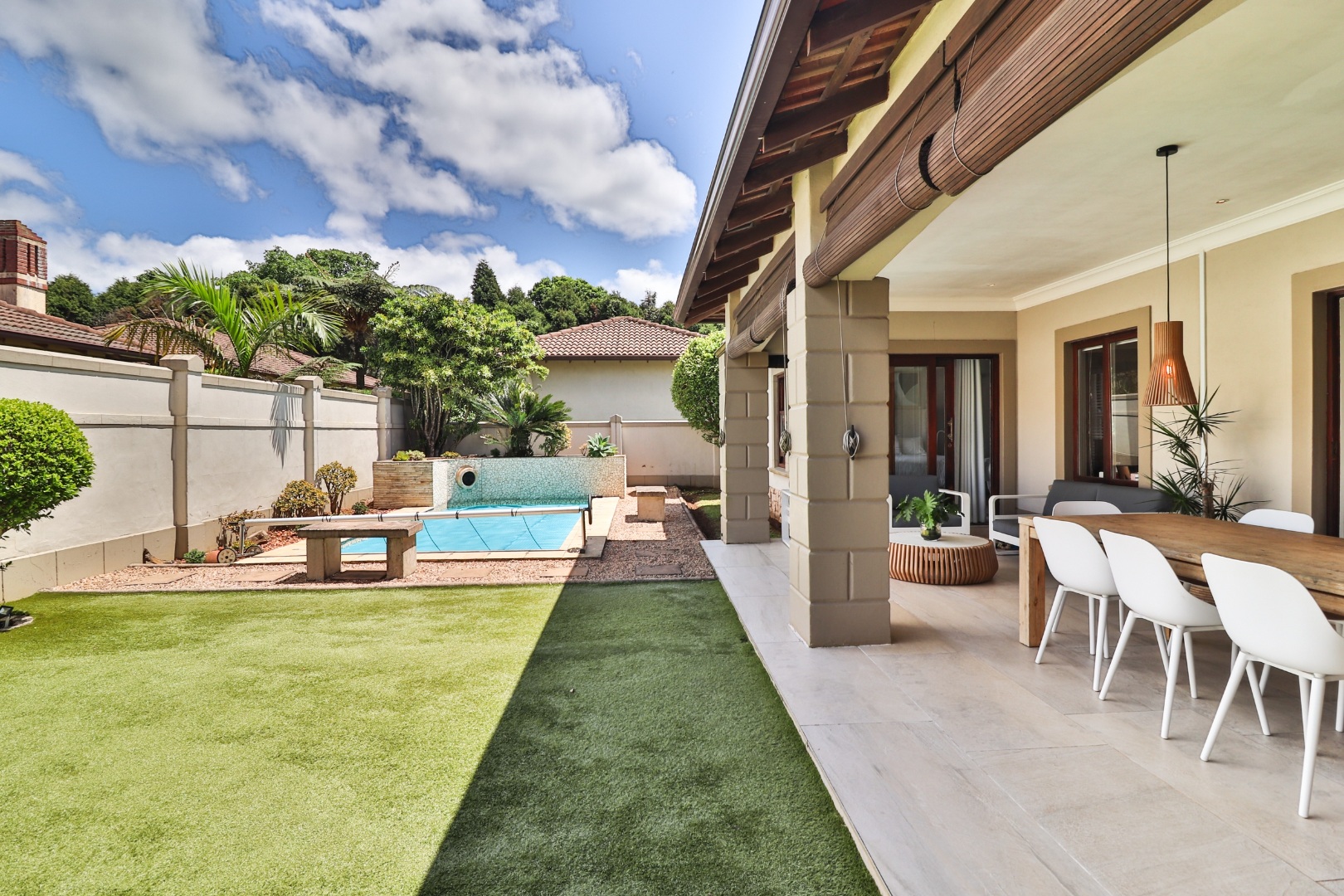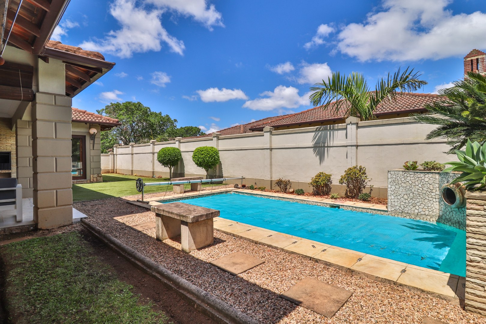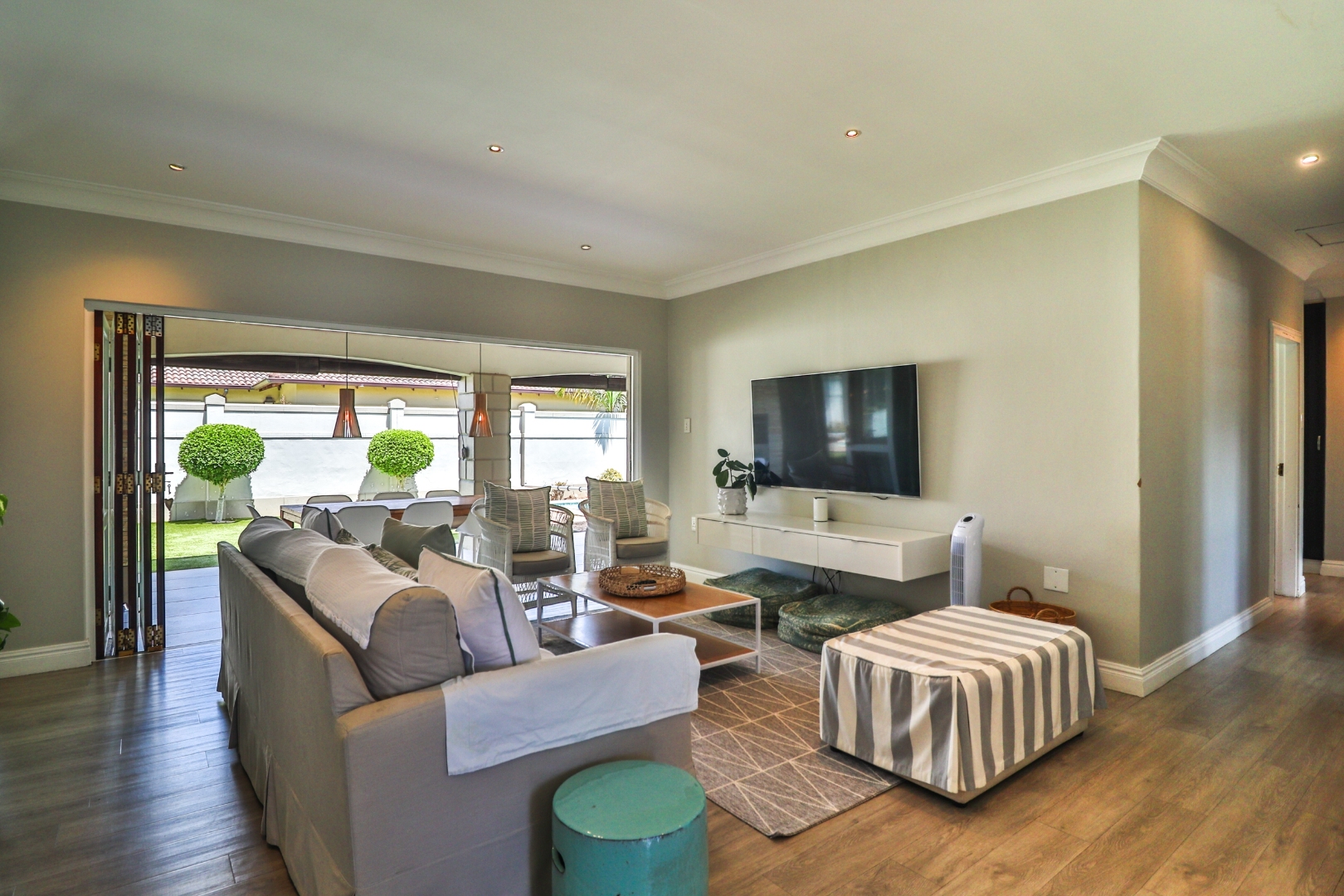 The open-plan living spaces extend to a covered patio with built-in braai overlooking the sparkling pool — perfect for year-round entertaining. A cosy lounge with a feature fireplace makes for warm family evenings, while the master suite enjoys direct access to the patio for quiet relaxation.
