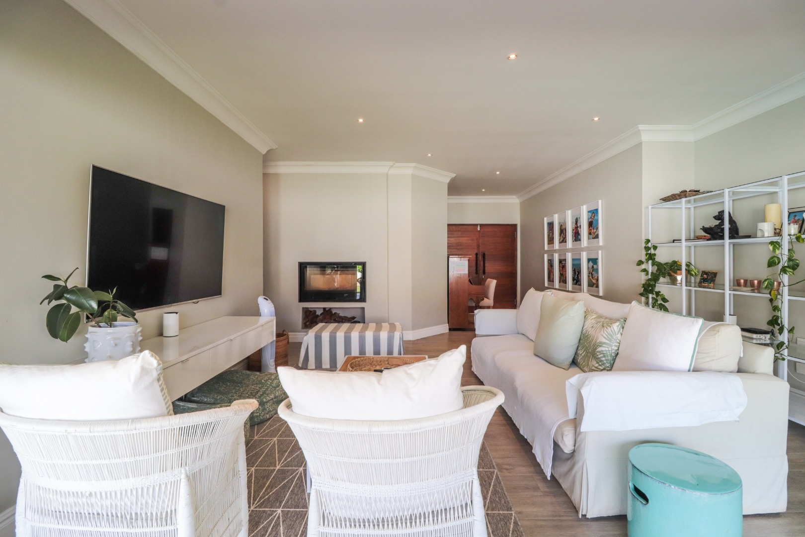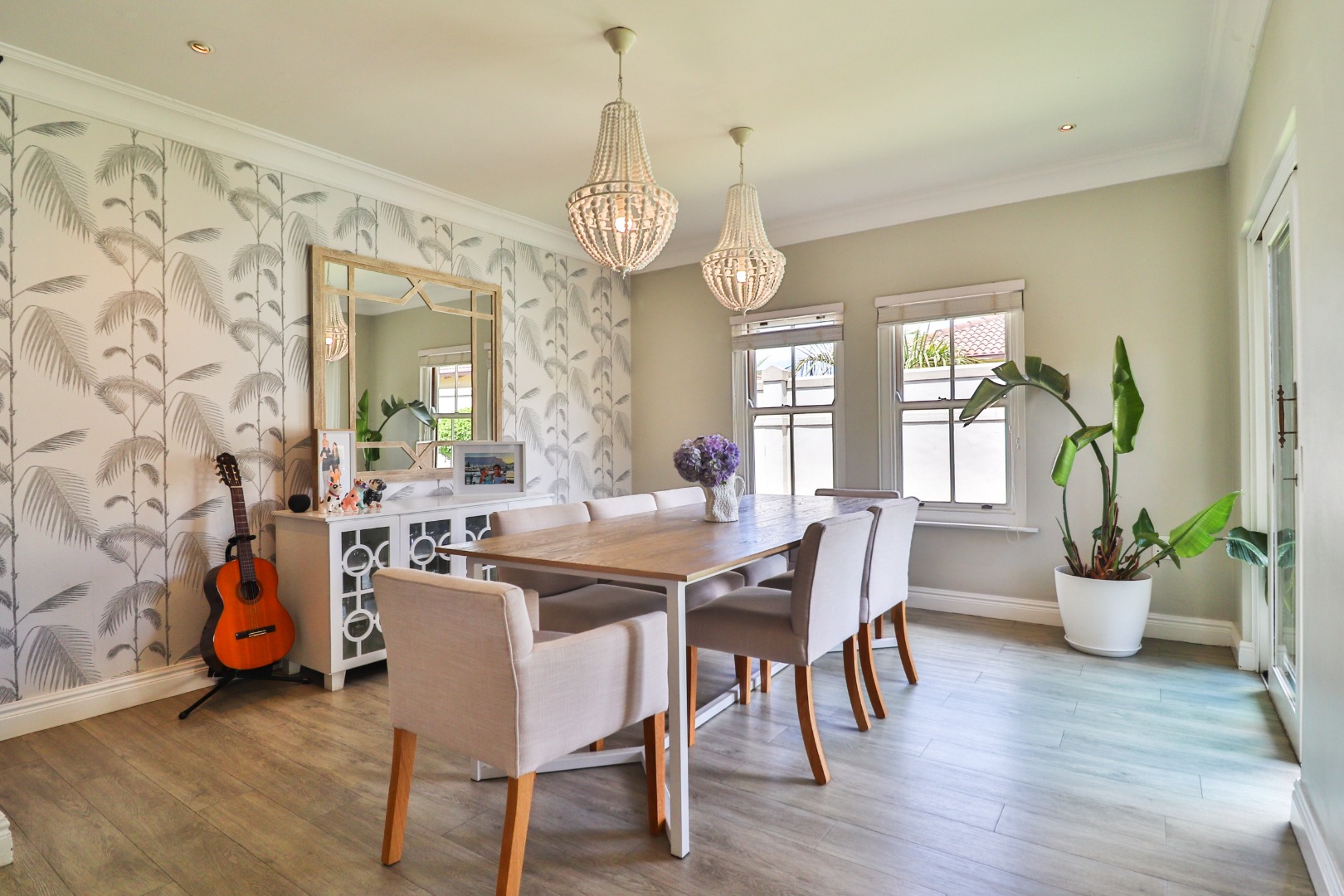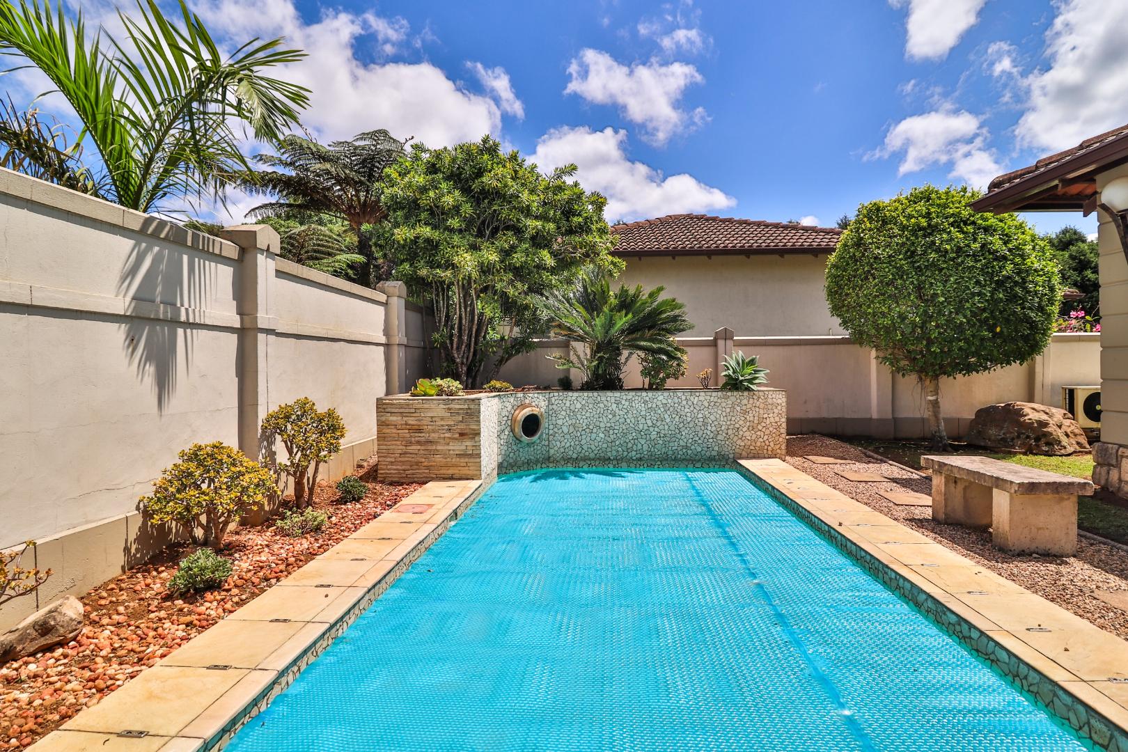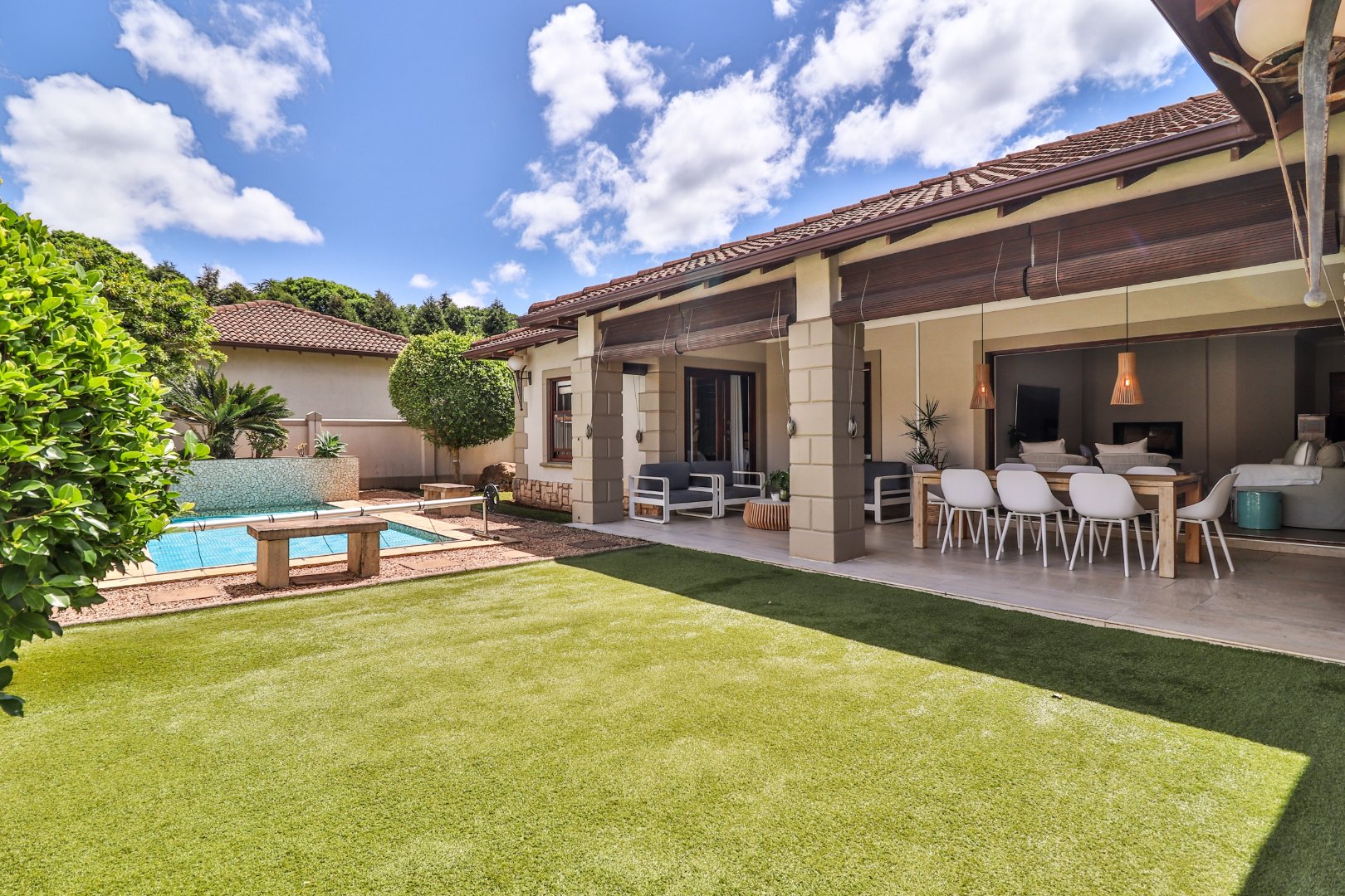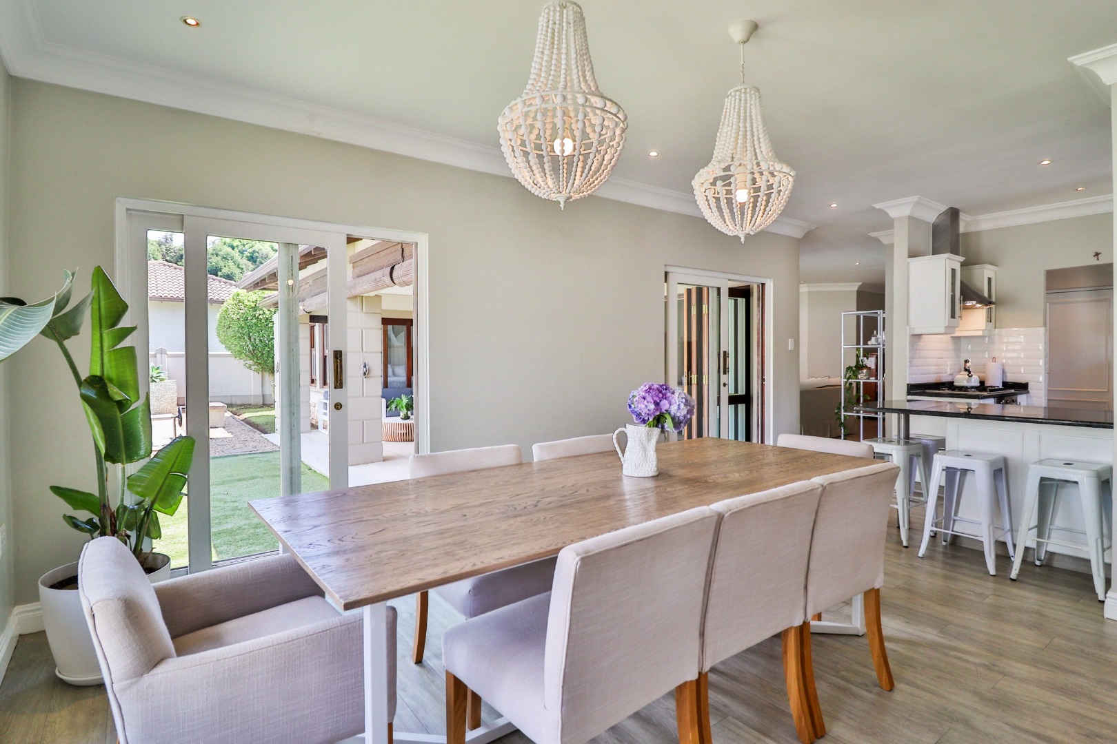 The open-plan living spaces extend to a covered patio with built-in braai overlooking the sparkling pool — perfect for year-round entertaining. A cosy lounge with a feature fireplace makes for warm family evenings, while the master suite enjoys direct access to the patio for quiet relaxation.