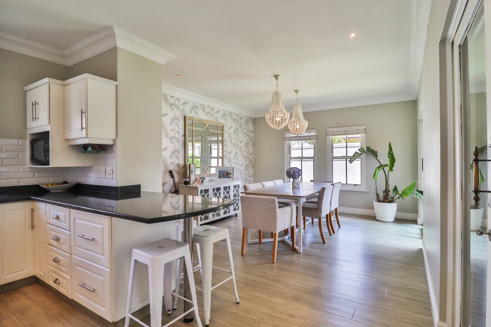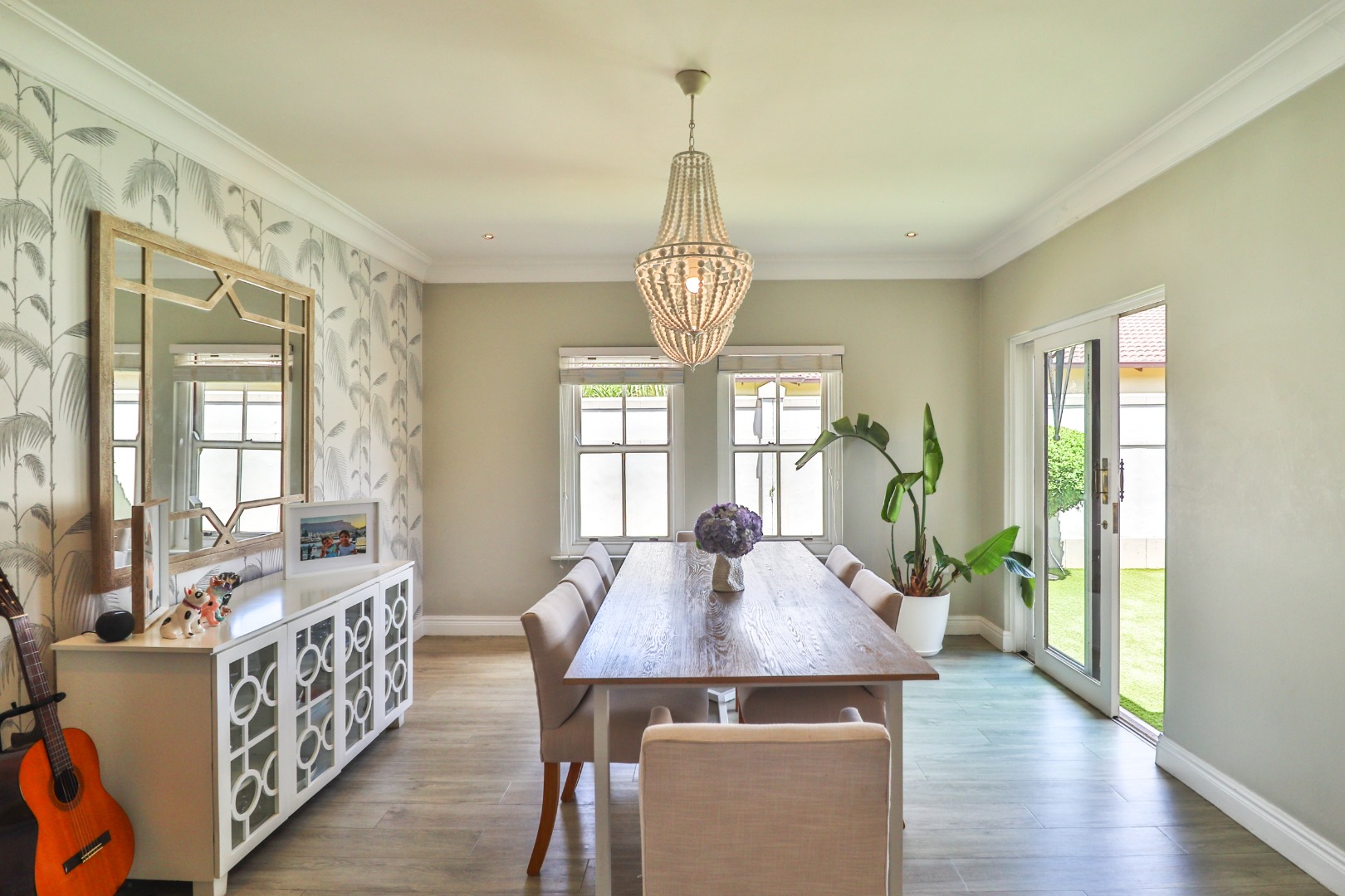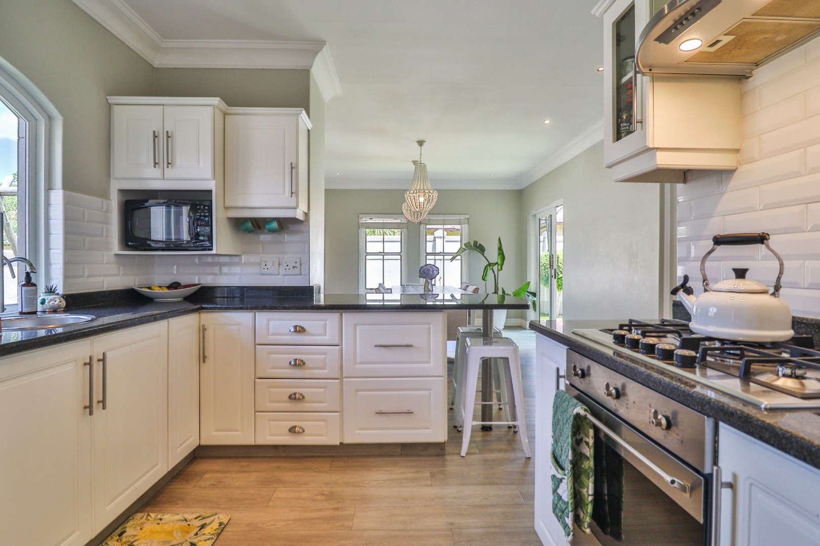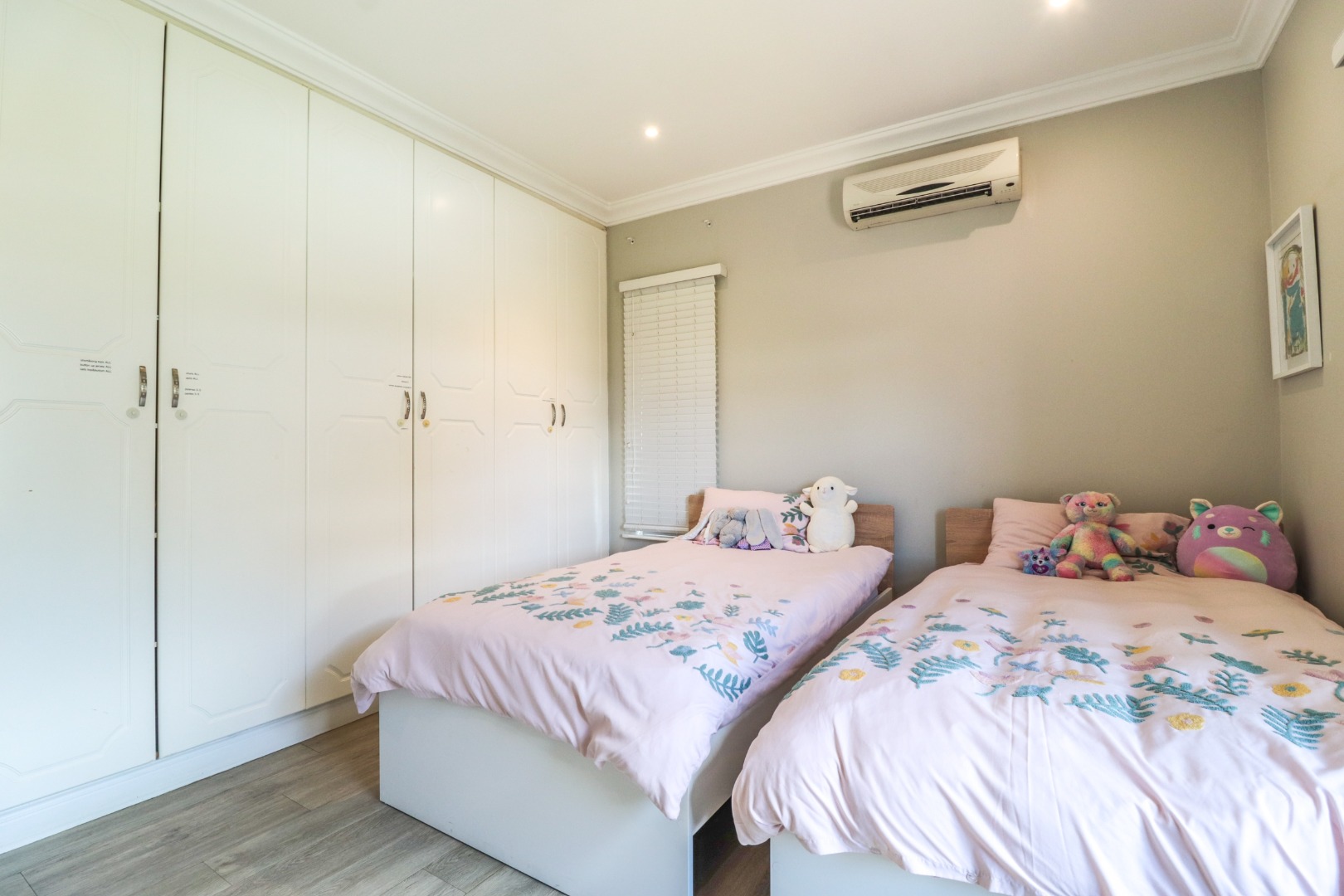 The open-plan living spaces extend to a covered patio with built-in braai overlooking the sparkling pool — perfect for year-round entertaining. A cosy lounge with a feature fireplace makes for warm family evenings, while the master suite enjoys direct access to the patio for quiet relaxation.