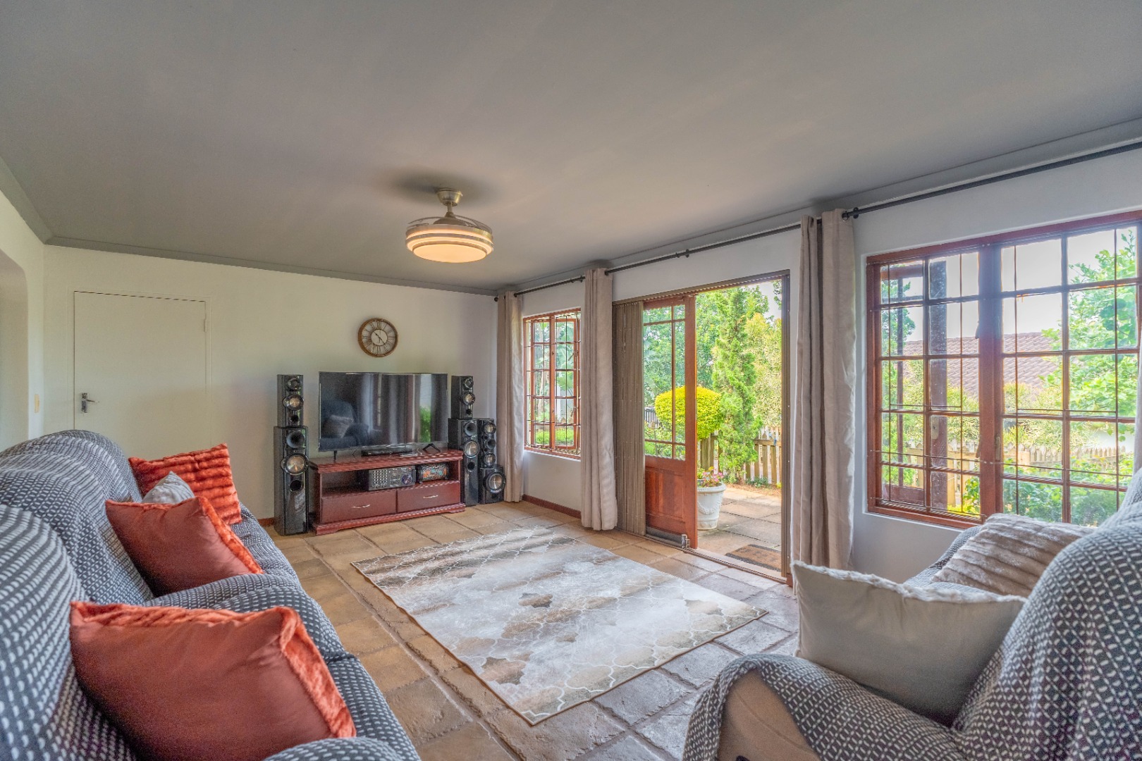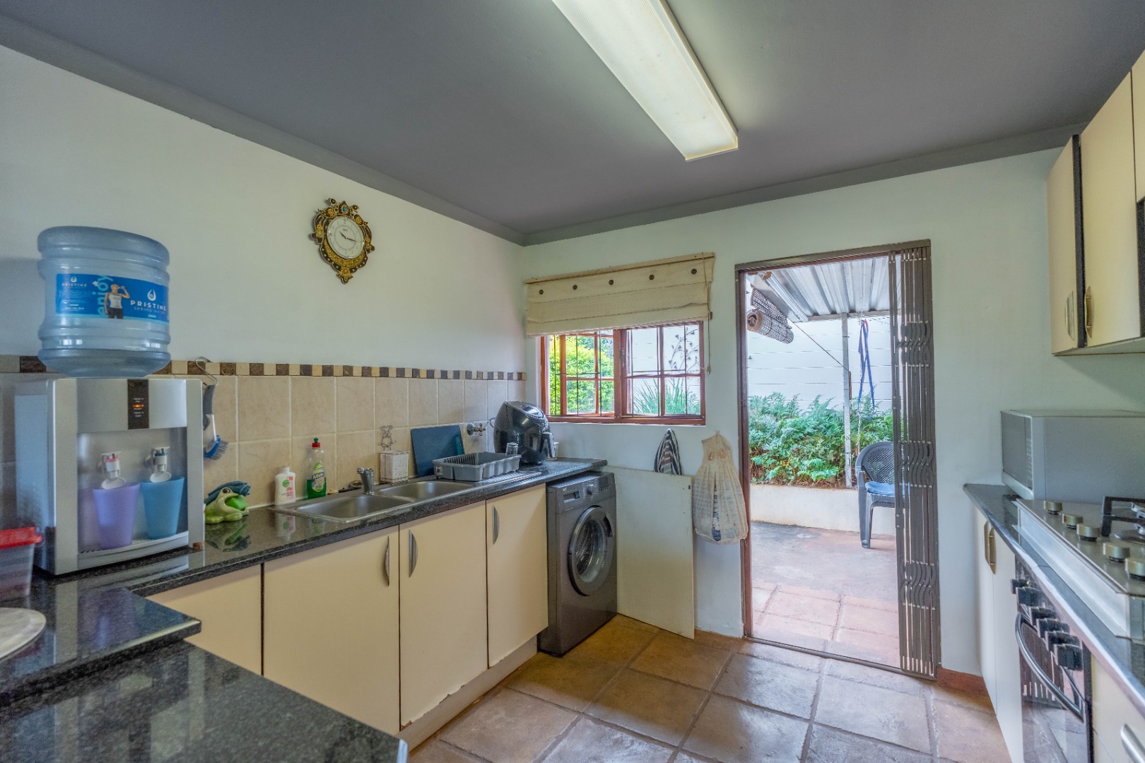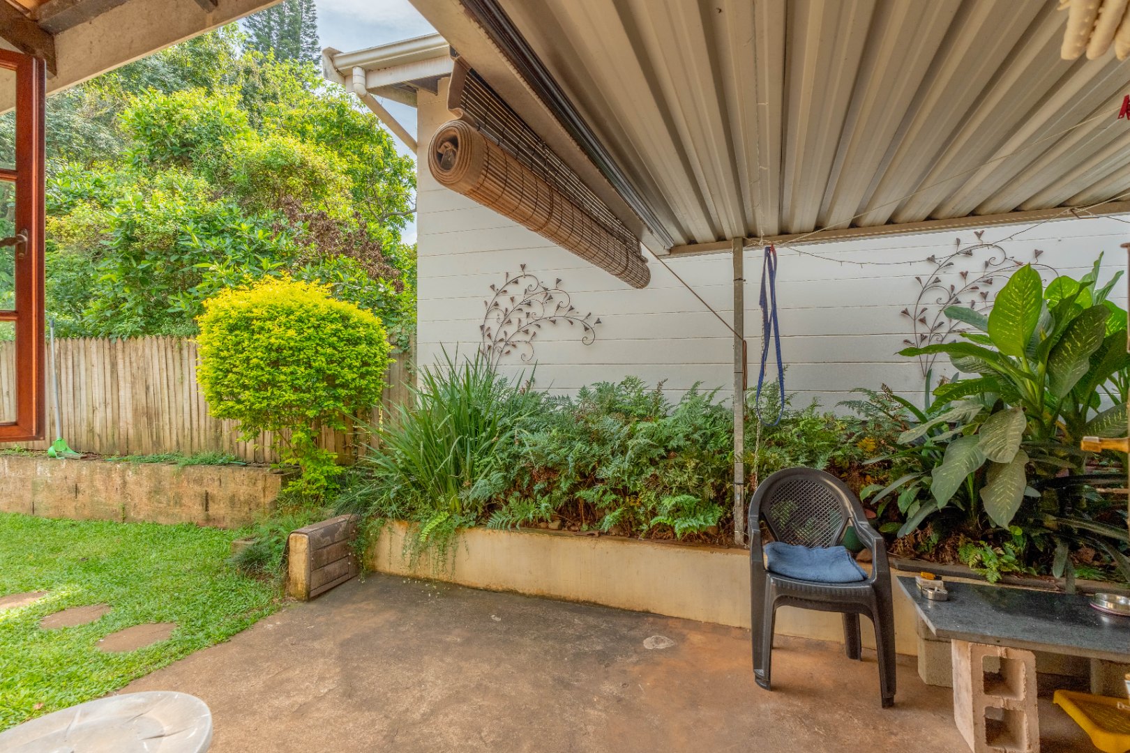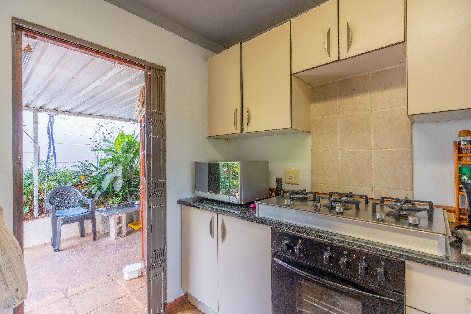 The open-plan lounge and dining area flows seamlessly into a modern kitchen fitted with granite countertops and plumbing for a washing machine. From the kitchen, you step out onto a private patio with an awning, perfect for enjoying morning coffee or entertaining guests.
