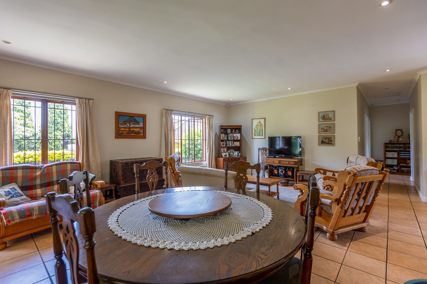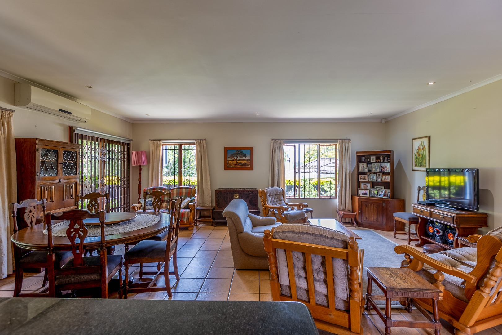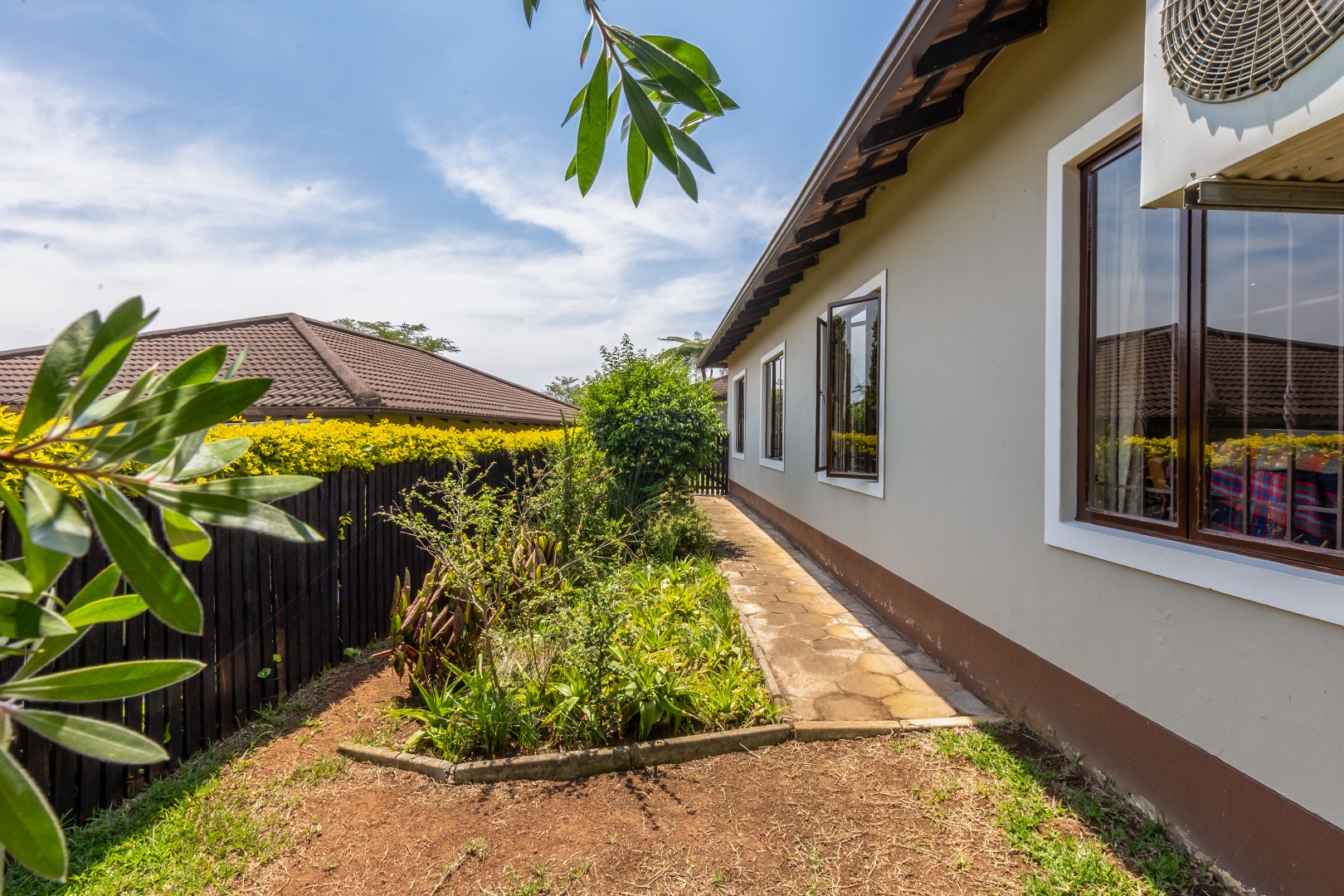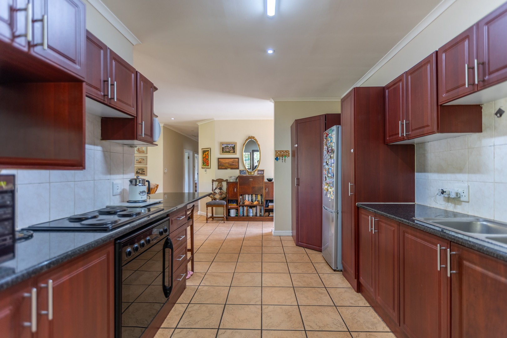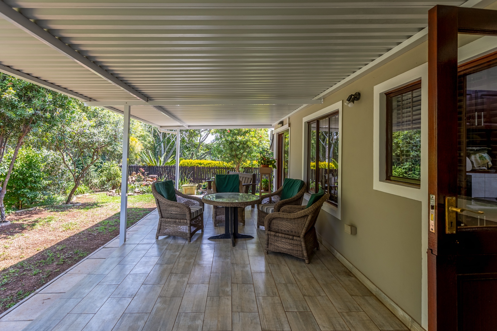 The open-plan lounge, kitchen, and dining area flow seamlessly to a large undercover patio and private garden. The kitchen is fitted with granite countertops and ample cupboard space.