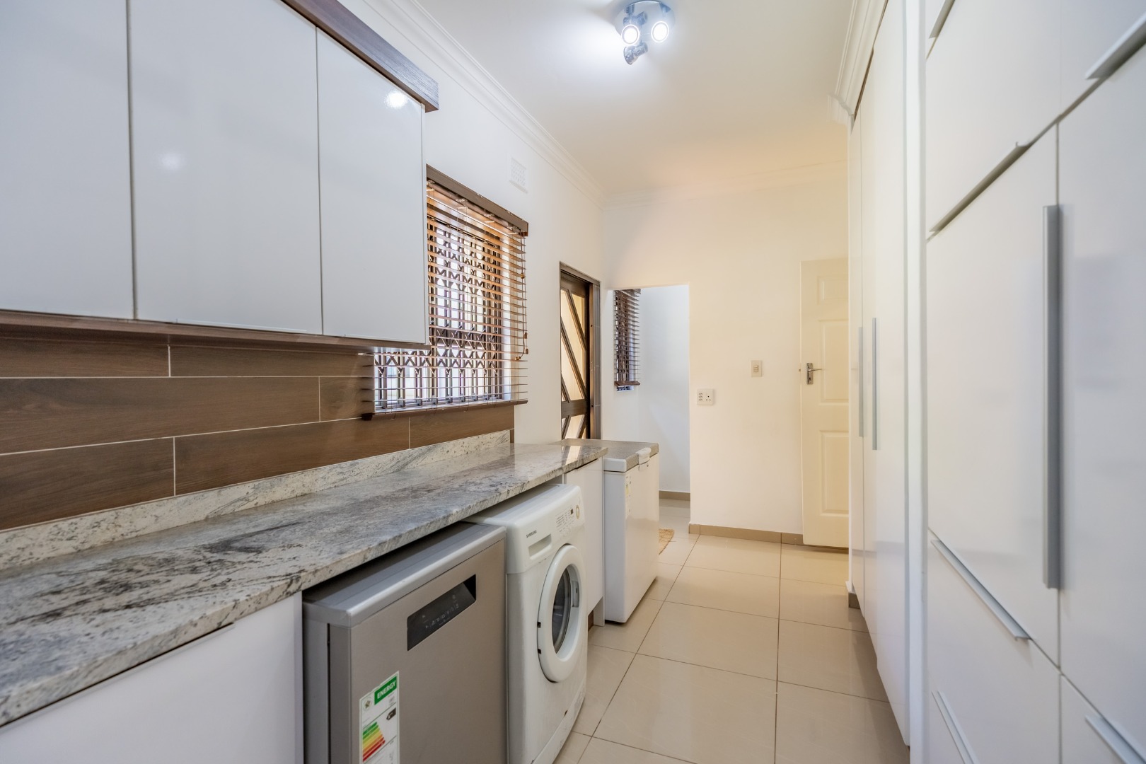 The chef’s kitchen is both stylish and functional, offering a gas stove, eye-level oven, and modern finishes throughout. A separate scullery and laundry room add to the convenience, while an office or playroom just off the kitchen provides flexible living options.