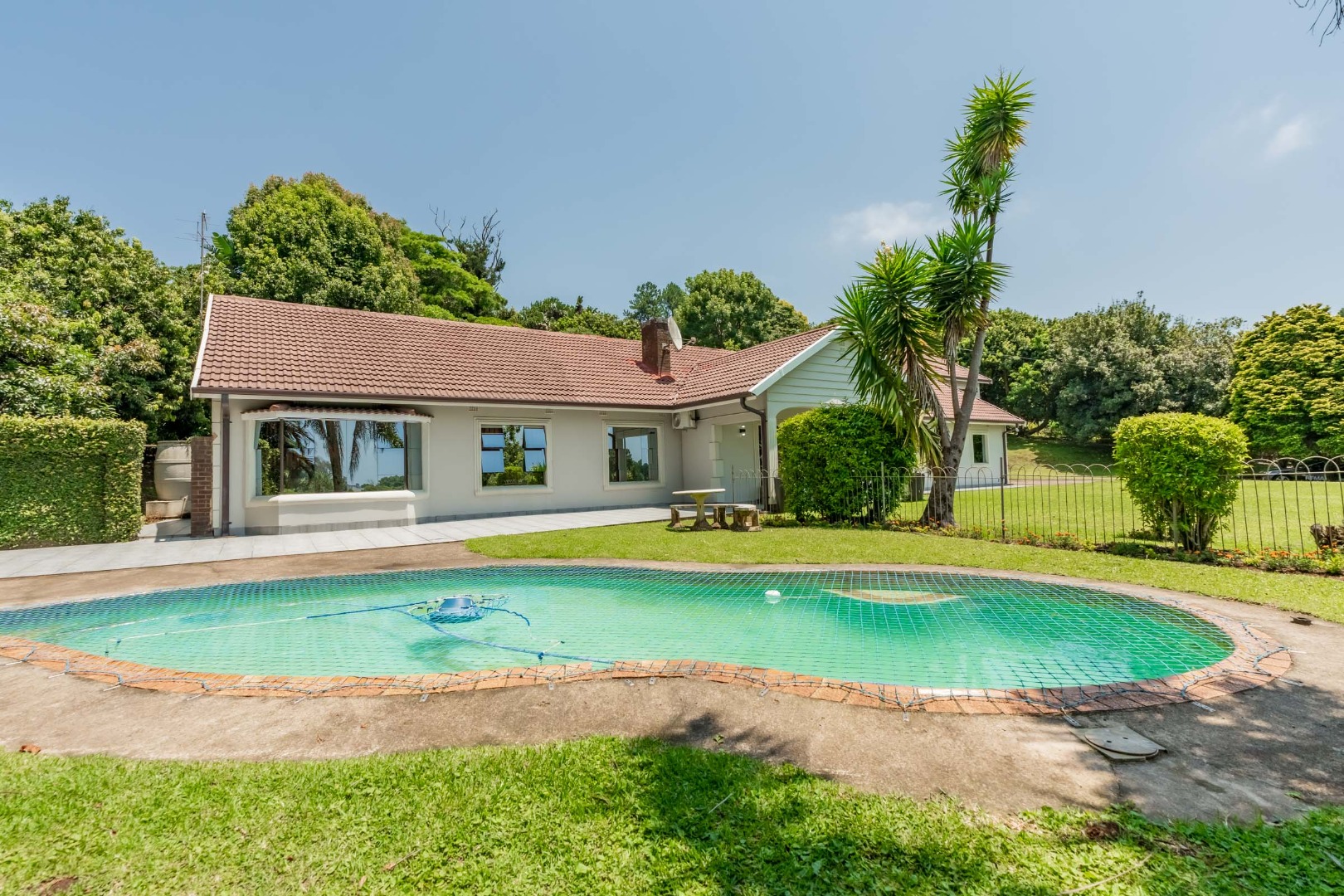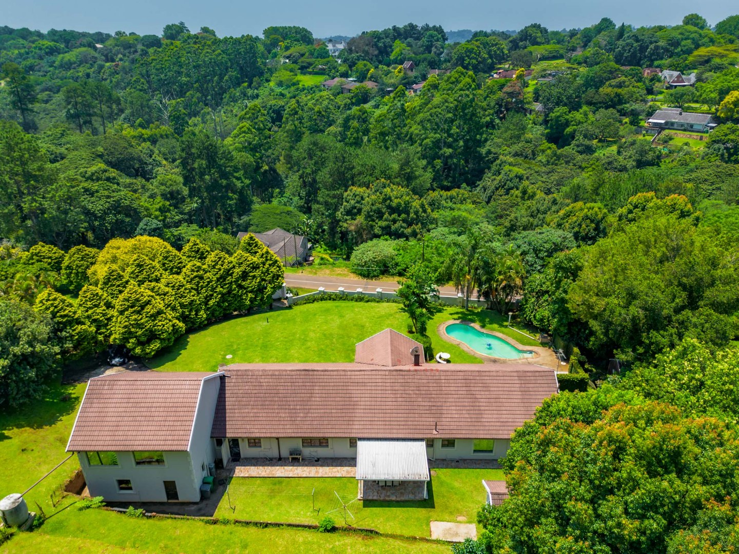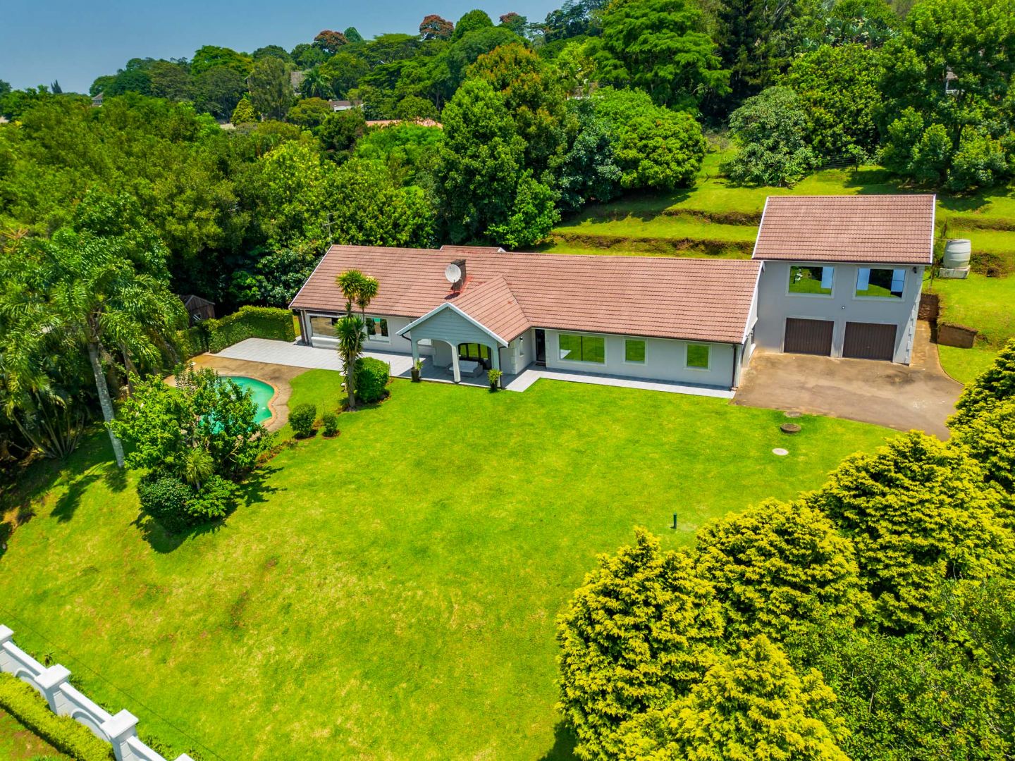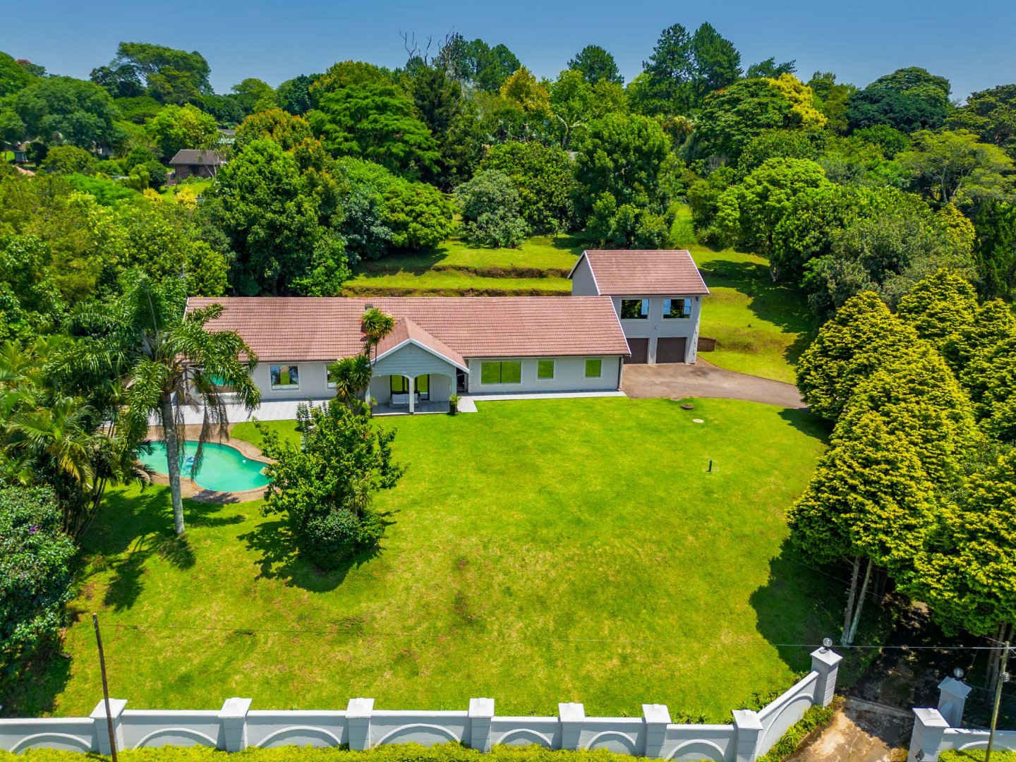 Additional features include separate domestic quarters with a room and toilet, an inviting swimming pool, and a beautifully maintained garden. The home is positioned above road level and offers three garages along with ample parking space.